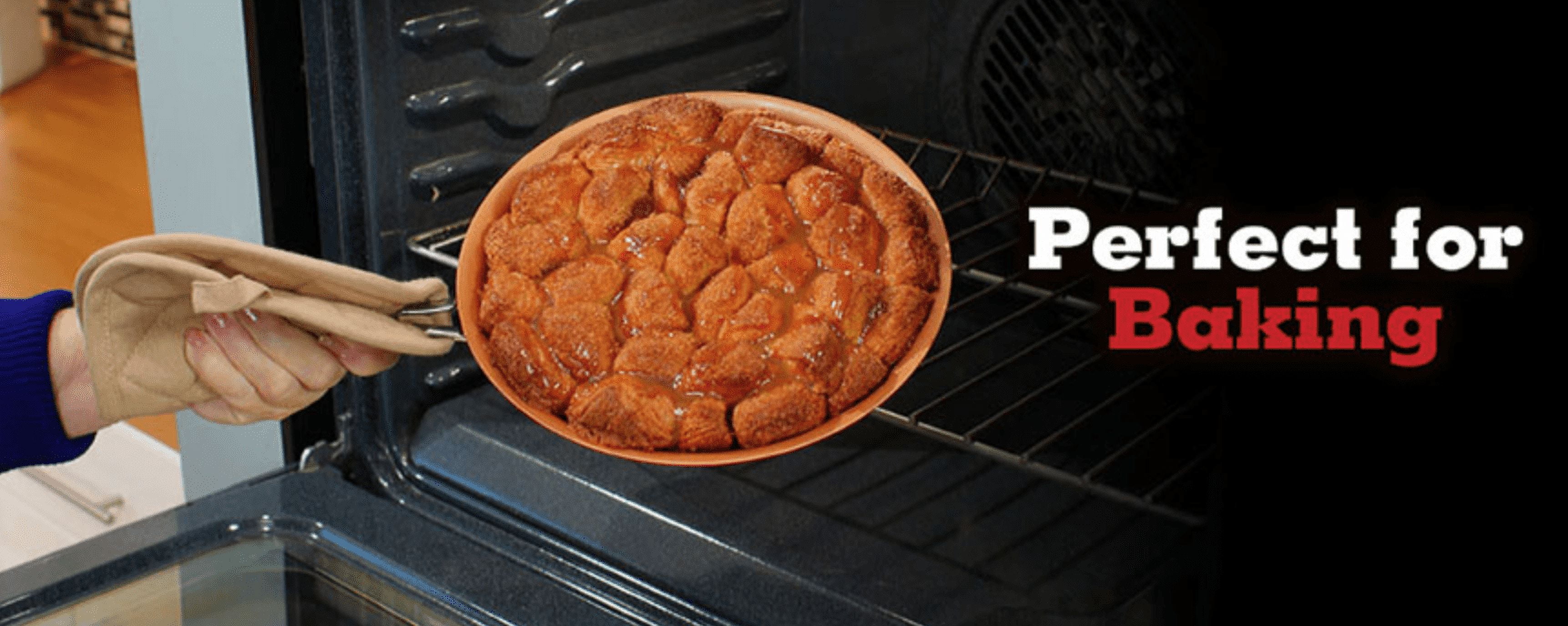 Copper-infused fry pan includes a high-heat-resistant, PFOA and PTFE-free, scratch-resistant ceramic coating that will not peel, chip, or flake Naturally Non-Stick Ceramic Surface Allows You Fry Up Your Favorite Breakfast Meats, Eggs, Veggies, And More Without Oils, Sprays, Or Butter Aluminum cooking rings ensure even heat for no hot spots Transitions from stovetop to ovens up to 500 degrees Fahrenheit for meal versatility. Dishwasher safe for easy cleanups Brown chicken or chops, sear steak, and finish in the oven. Includes 10/12 inch pan with stay cool stovetop handle
