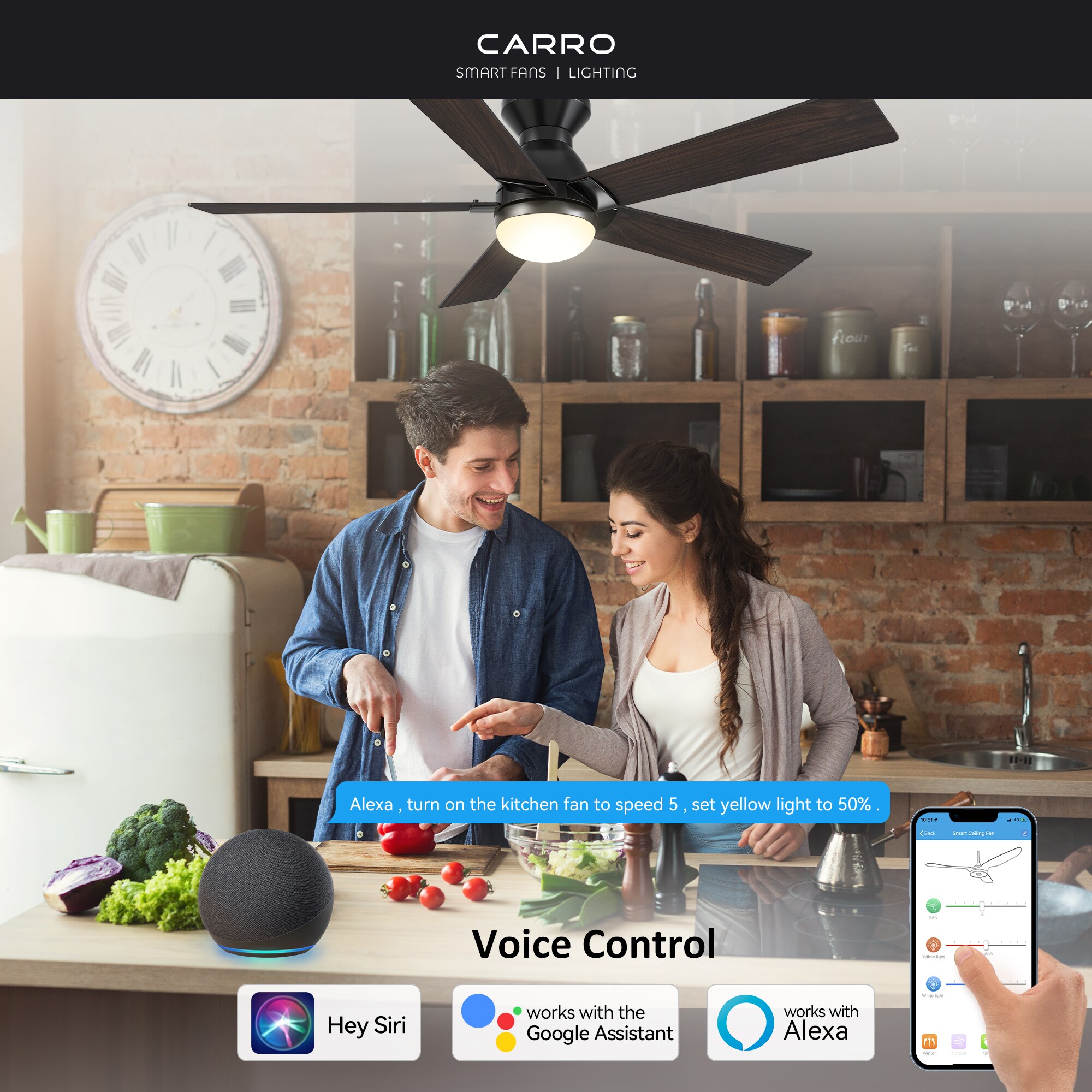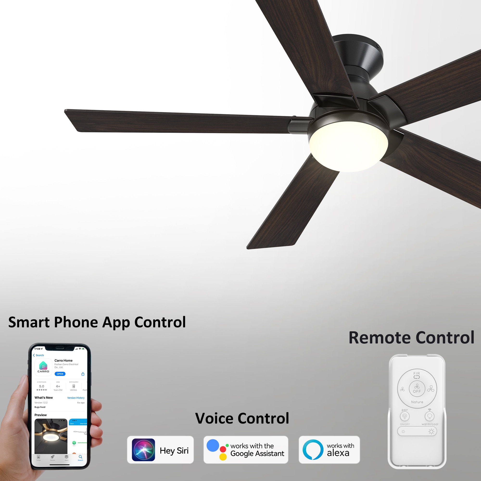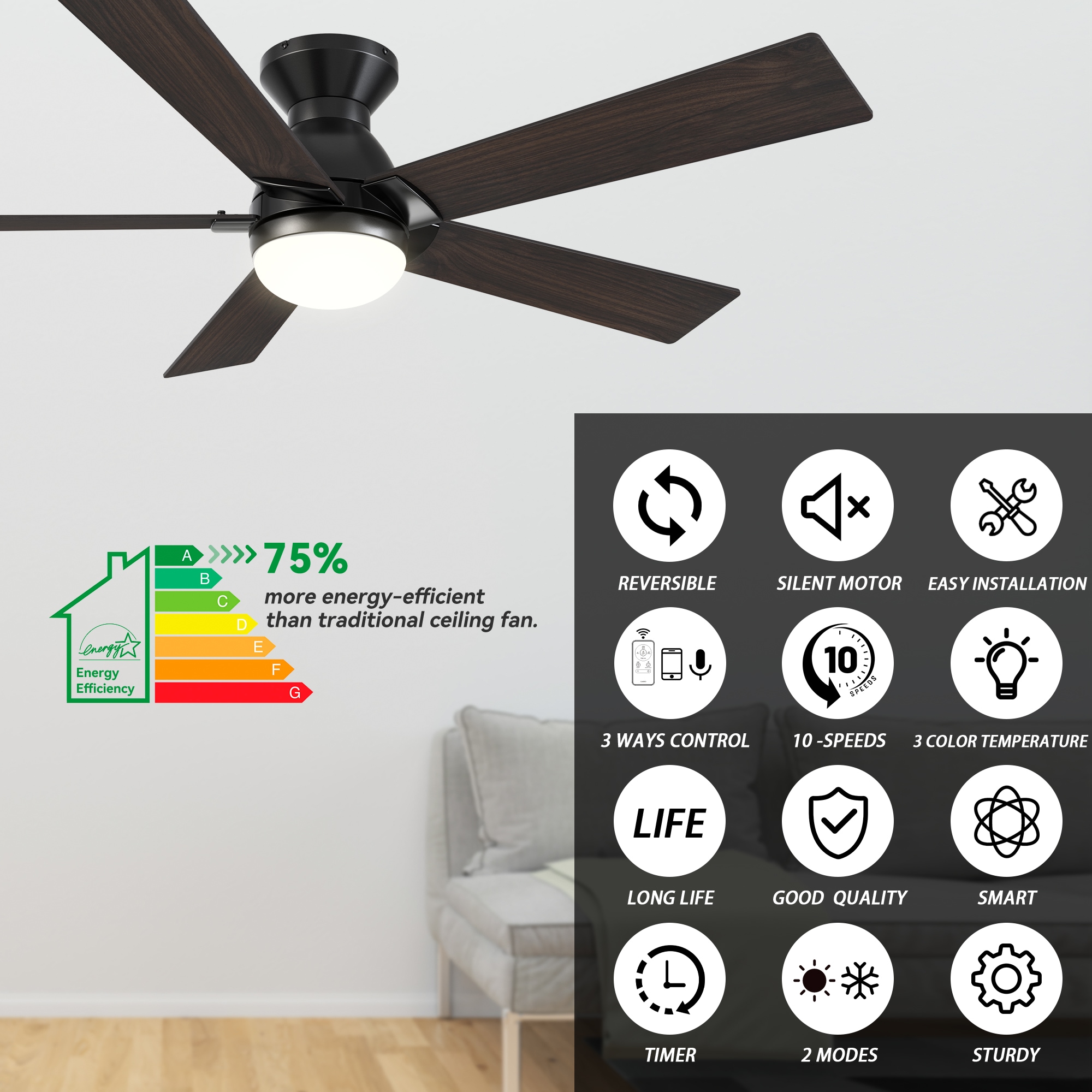 The Aspen 52-in smart ceiling fan offers a combination of cooling, illumination, and aesthetics, making it an ideal choice for spacious indoor living areas. With its sleek design and Black finish, this Wifi-enabled smart ceiling fan showcases a blend of simplicity and elegance. It incorporates elegant Plywood blades and has an Integrated 4000K LED daylight, enhancing both functionality and style. The fan provides convenient features such as a Remote control, Wi-Fi apps, Siri Shortcut compatibility, and Voice control technology, making it compatible with Amazon Alexa and Google Home Assistant for effortless fan customization.