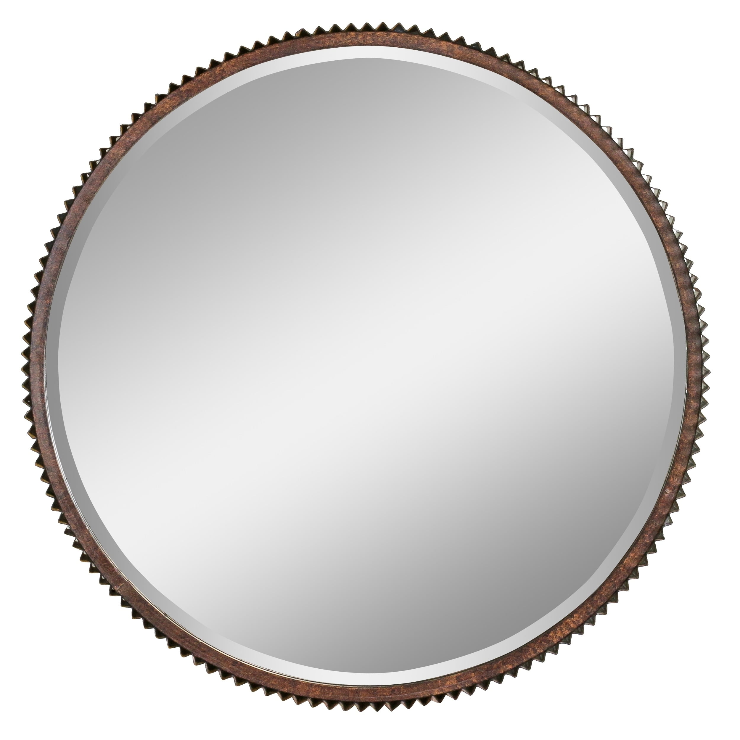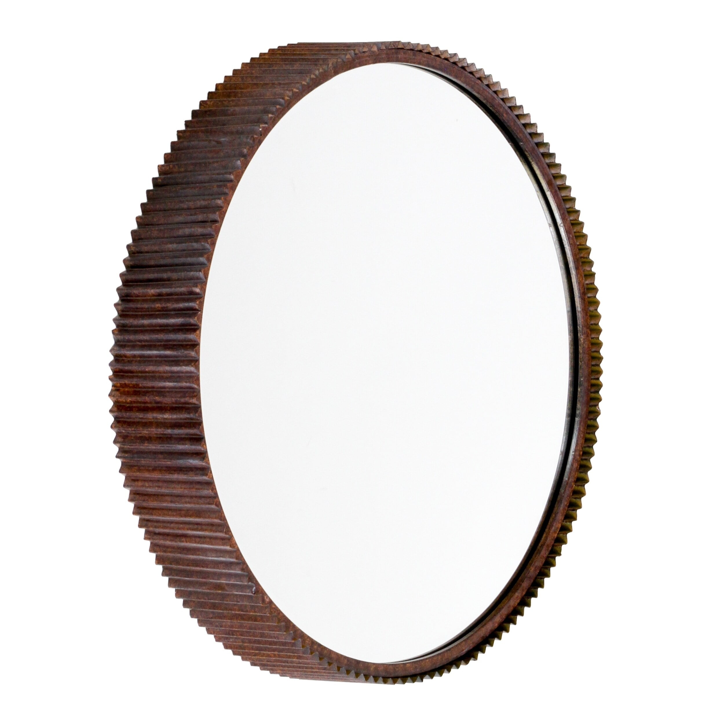 Augment your industrial decor with this round wall mirror featuring a brown frame. This beveled mirror has a four-inch-deep frame that is encased in corrugated metal for a textural appearance. The medium size of this mirror lets you install it effortlessly on a wall with a single nail.