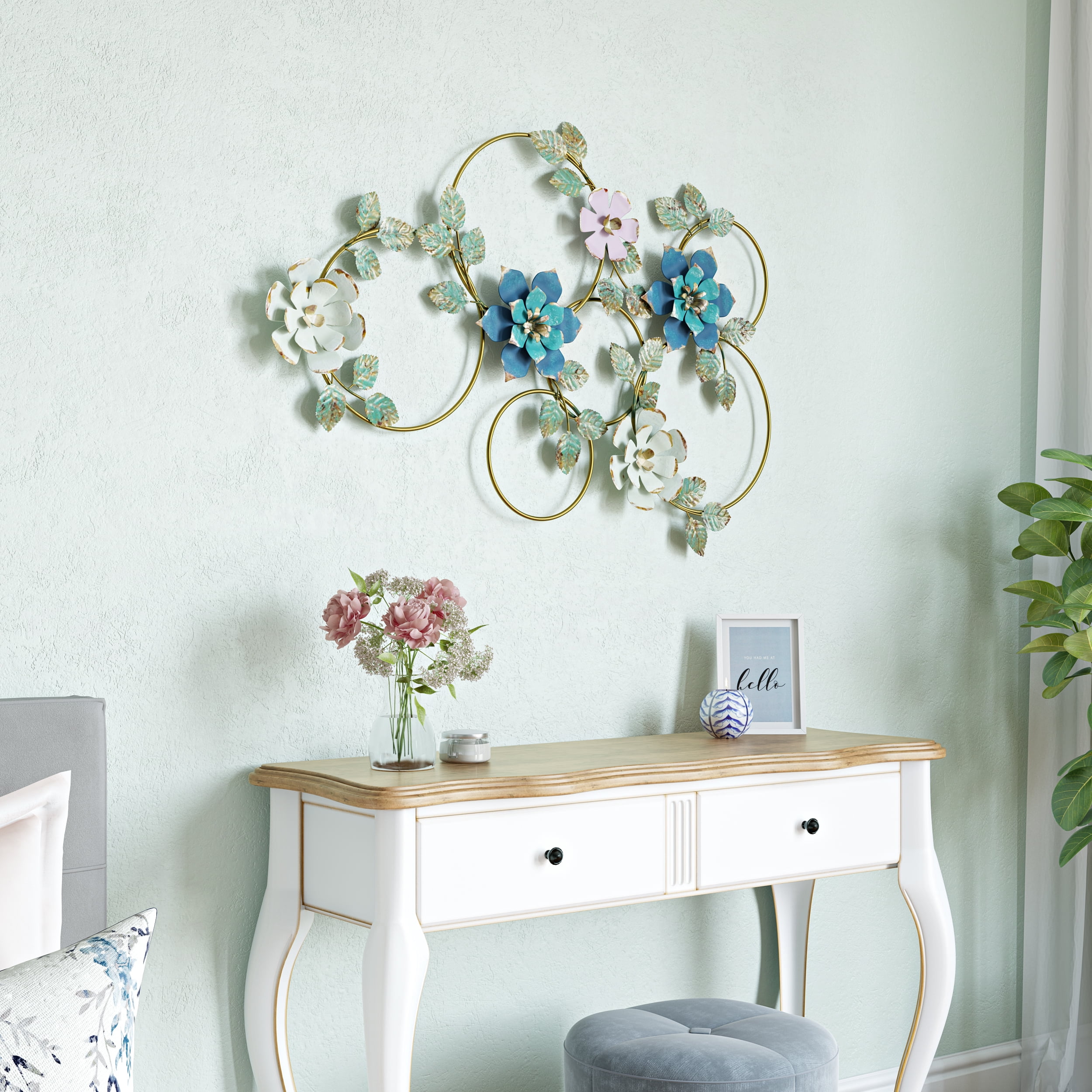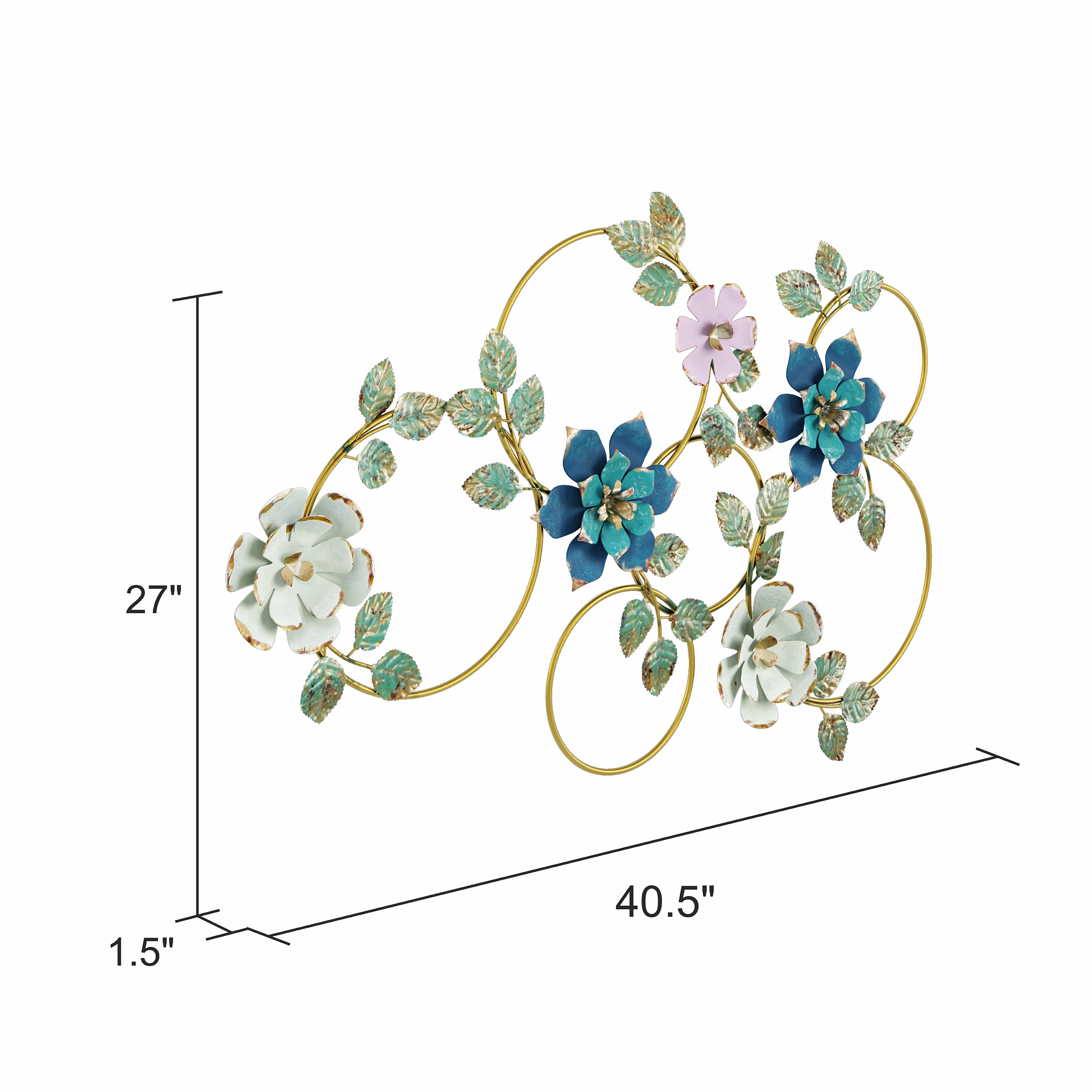 Evoke the charm of a garden and add color to your space with this stylish floral wall accent. The multicolored design features three-dimensional flowers crafted beautifully from metal. The soft and feminine look blends well with many decor styles and fits any room that needs a romantic touch. Hang it above the bed as a romantic headboard alternative, or in a living room or bathroom.
