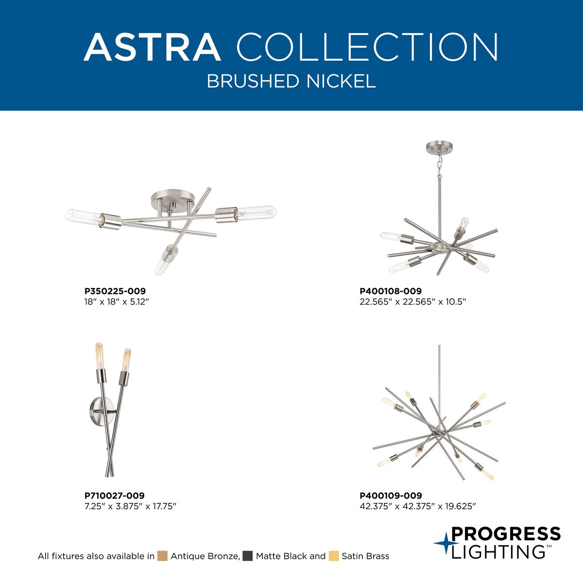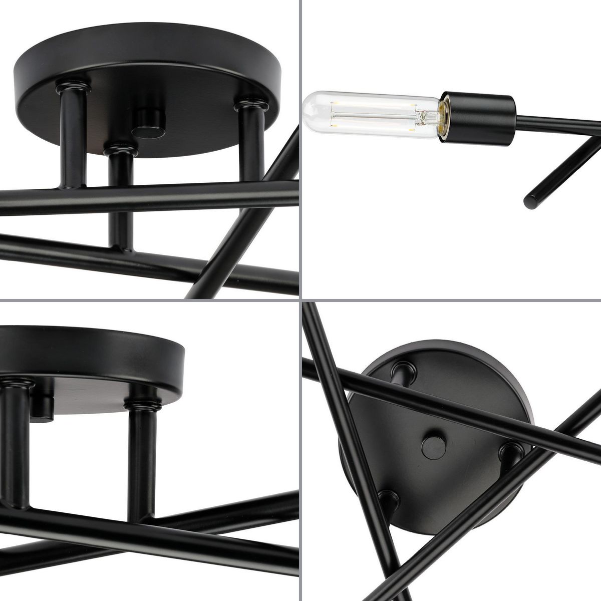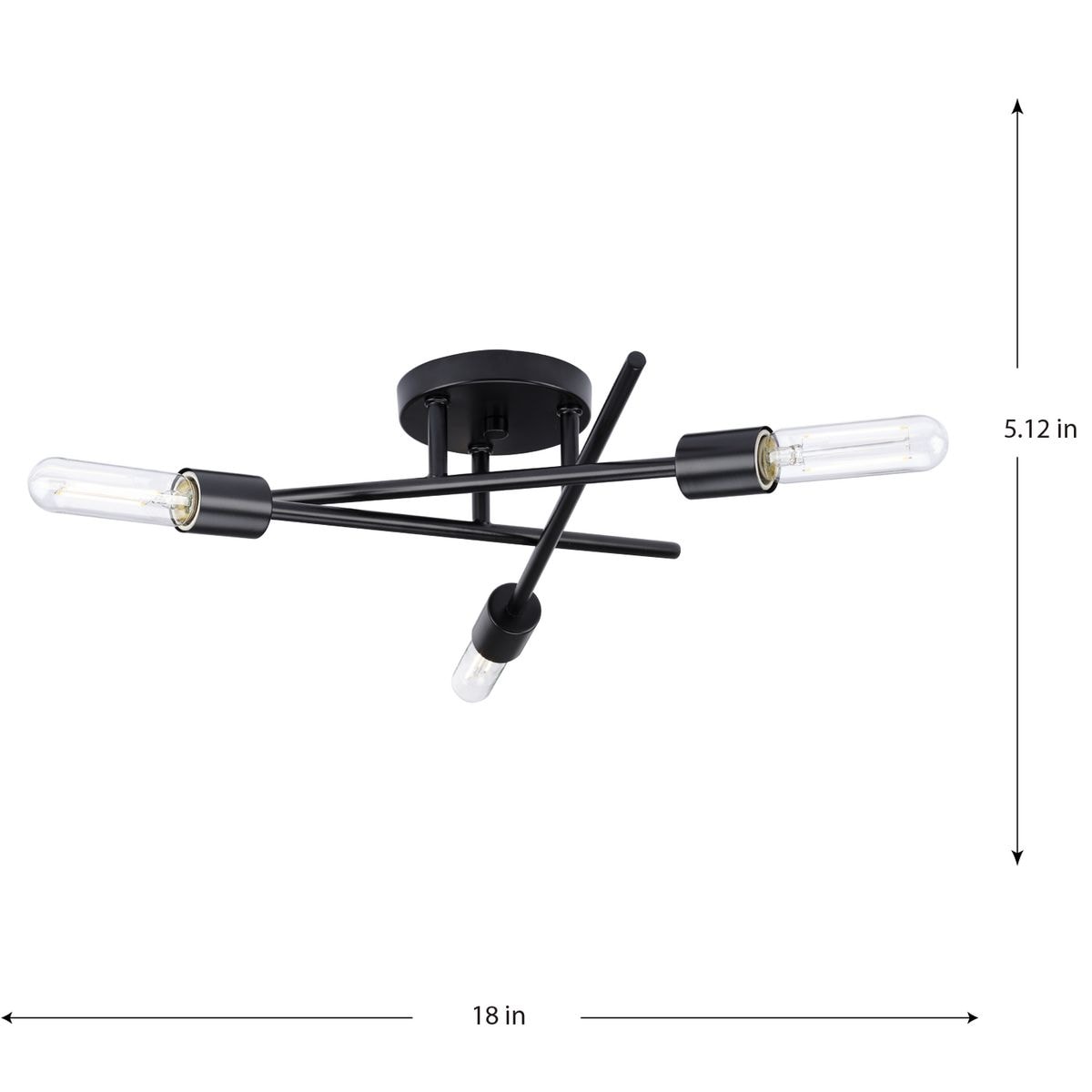 The Astra semi-flush mount light features a space-age-inspired design perfect for modern and mid-century decor. A trio of spoked arms radiate out from a cylindrical down rod suspended from a center round canopy, bringing a dynamic flair to the fixture’s design. A matte black finish adds a touch of sophistication. Decorative bulbs (sold separately) adorn the ends of each perpendicular arm. The generous scale is ideal for bringing illumination to bedrooms, hallways and family rooms. This fixture is part of the Progress Lighting Design Series, a lighting collection offering fashionable styles and affordable luxury lighting for the home.