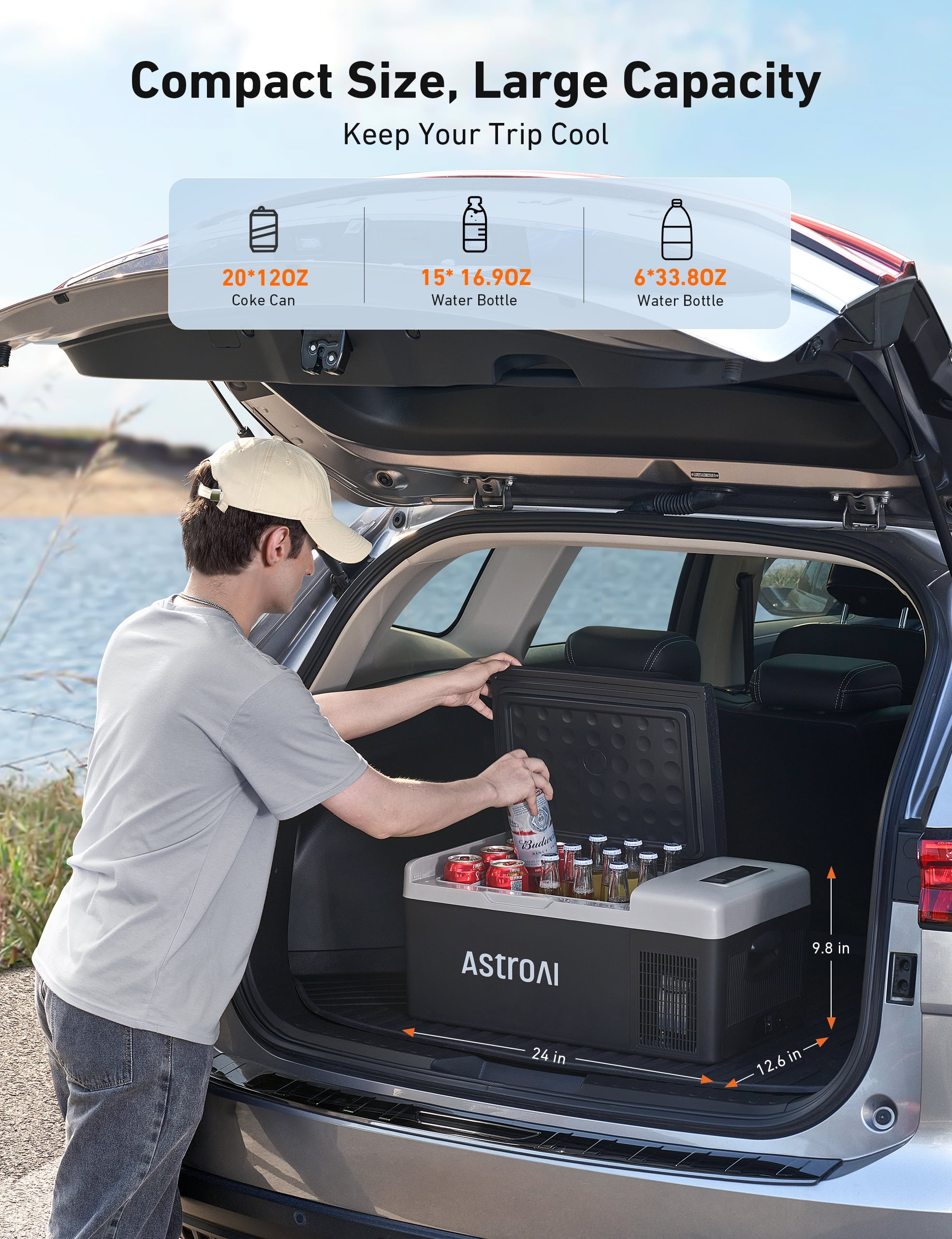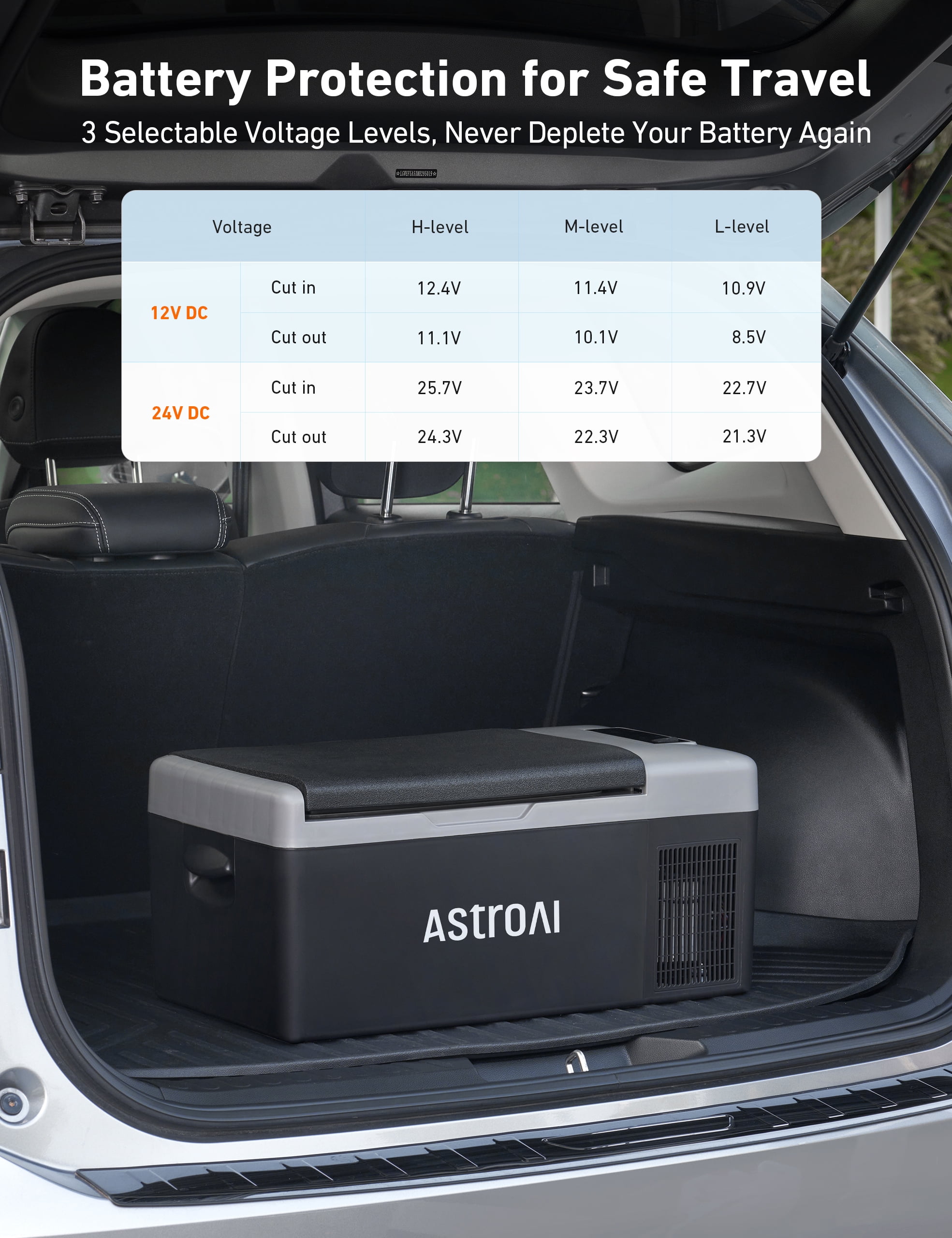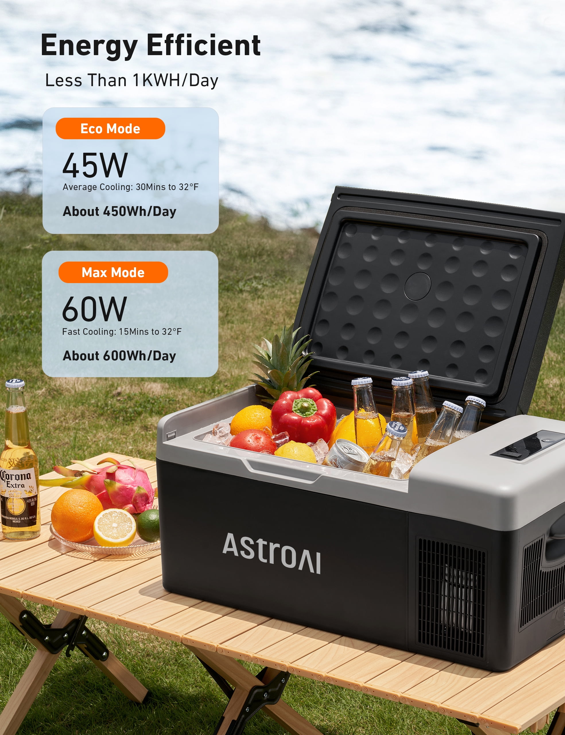 LARGE CAPACITY: With 15L large capacity, interior dimension 13.8″(L)x 9.6″(W) x 7.1″(H), it could be a fridge or freezer to keep stuff cool at varying temperatures, such as Beverages, Fruits, Ice Cream, Vegetables, Seafood, Meats, Skin Care, and Breast Milk. Best for Picnic, Barbecue, Camping, Home Party, travel. Ideal gifts for women and men. FAST COOLING: With a powerful compressor, the car freezer in an empty can cool up to the maximum 95℉within 30 minutes, and reach the lowest -4℉(-20 °C about an hour. And you would choose max mode for fast cooling or ECO mode for energy saving. (The operating temperature does not exceed 131℉) BATTERY PROTECTION: With three-levels of battery protection mechanism- Low, Medium, and High, the car fridge can protect your vehicle battery from running out. It saves your time to re-set with memory function for next time. FUNCTIONAL DESIGNS: LED display panel helps to check and set the temperature in dim areas.USB Charging Port charges your phone when needed. UL Listed car cigarette lighter extension cord with built-in ceramic fuse provides first-class protection from overloaded and short circuits. MULTI-USE: With 12/24V DC and 100V to 240V AC adapter, you can cool stuff with this fridge at home or in your car. You even can use it outdoors with a portable power bank. 1-Year Warranty provided by AstroAI.