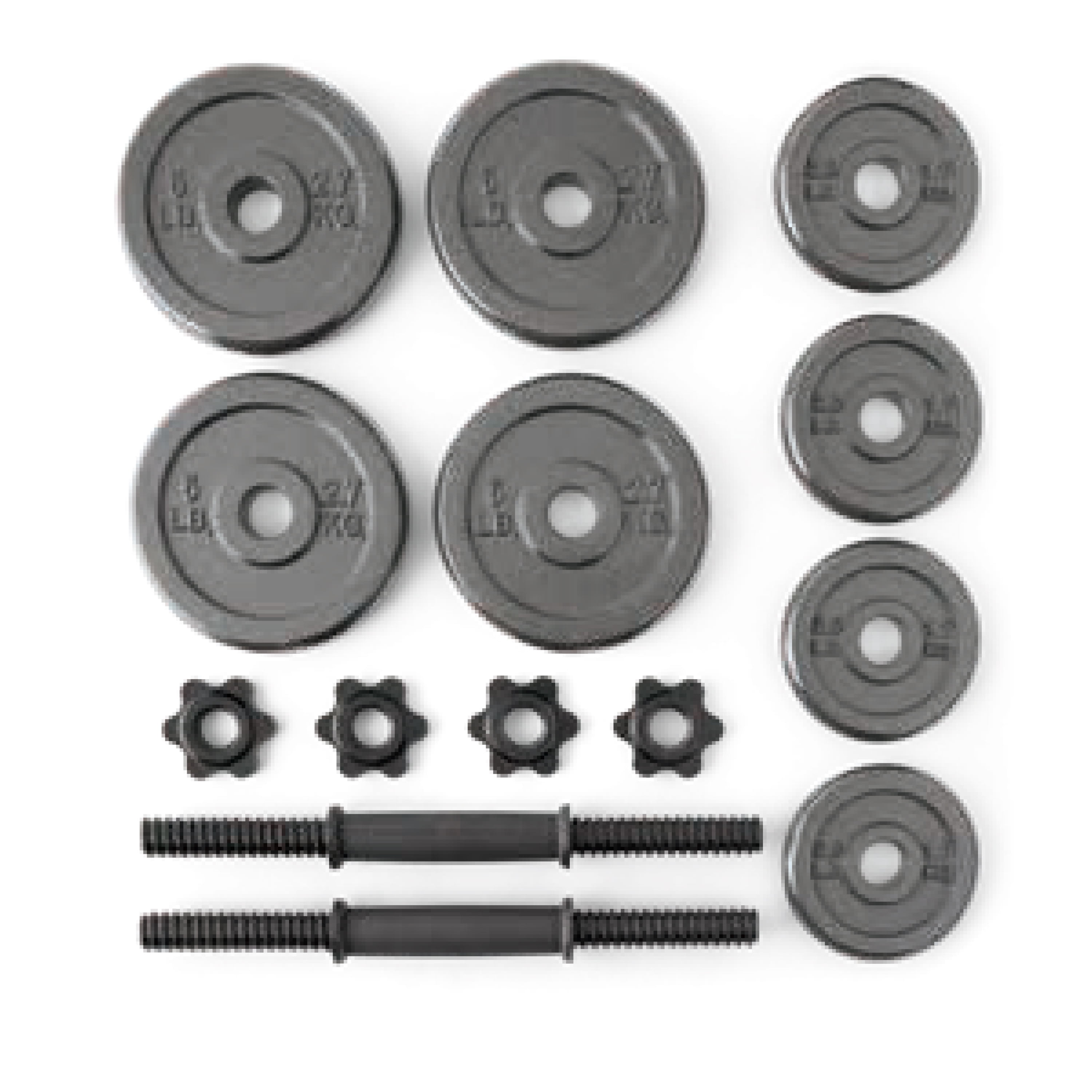 Athletic Works 40lb Adjustable Cast Iron Dumbbell Set: The ideal choice for both beginners and the advanced fitness enthusiast Fully adjustable with four 6 lb plates, four 2.5 lb plates, 2 threaded solid dumbbell handles, and 4 spin-lock collars Plates are made of solid cast iron with an enamel finish Different weight plates allow you to create several weight combinations with the dumbbells Weights can be gradually added as the workouts intensify Ideal for home use