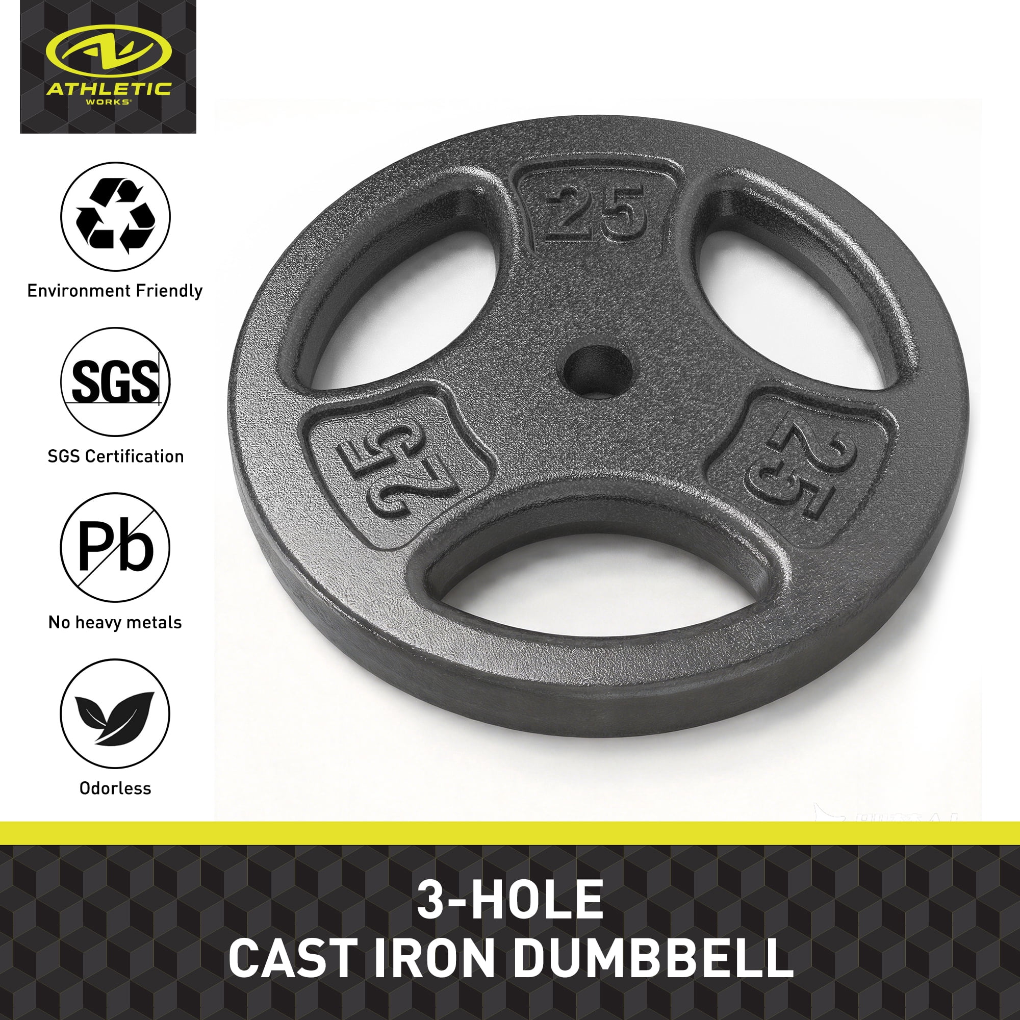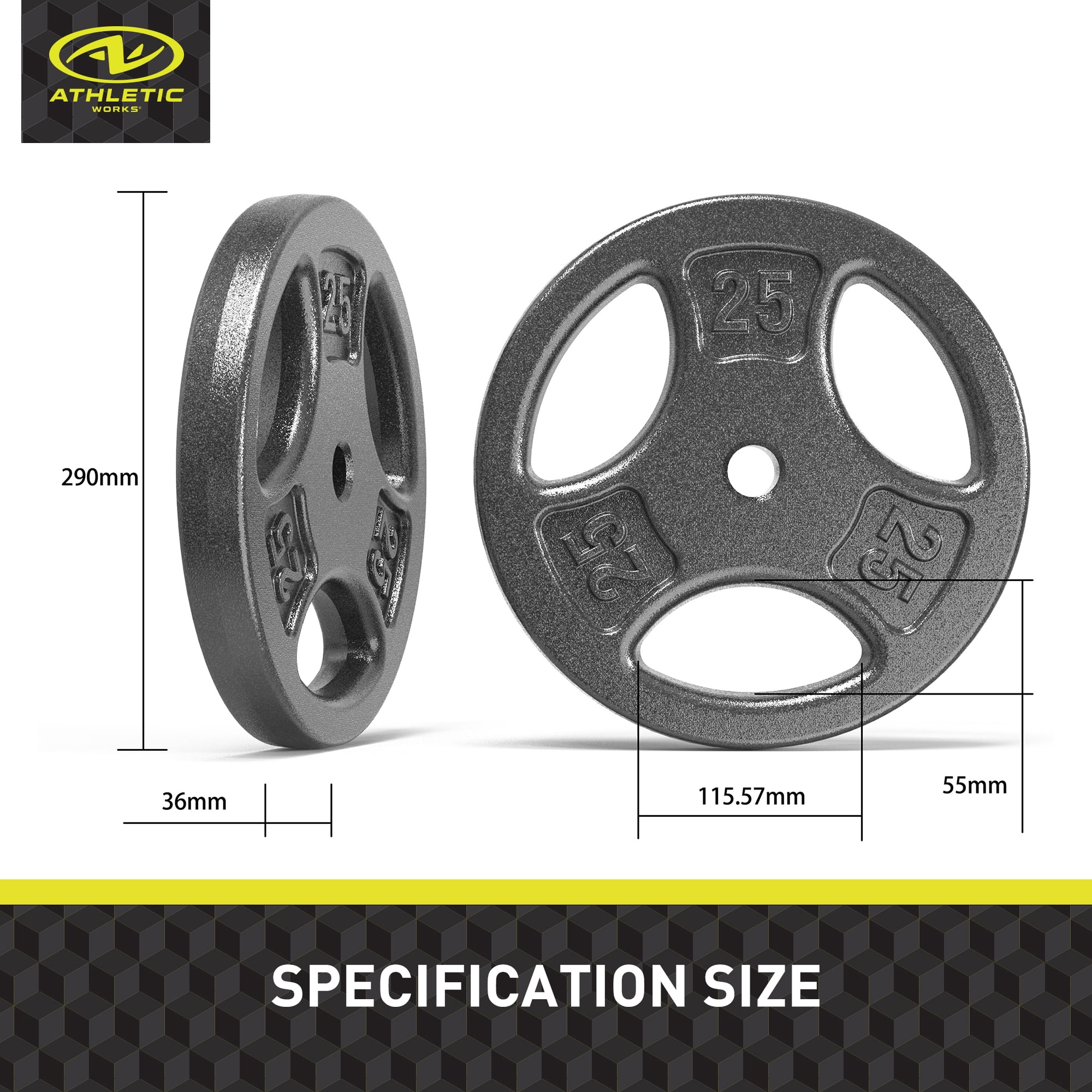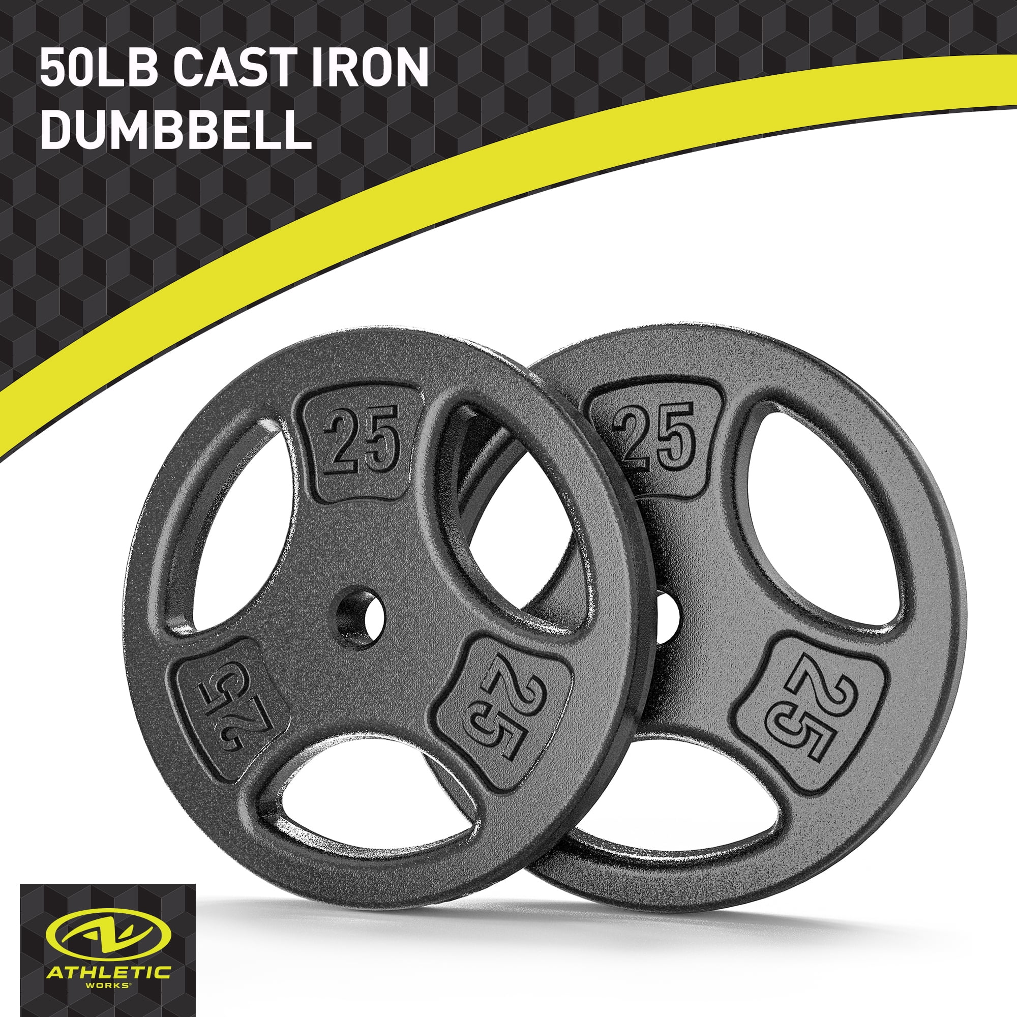 Athletic Works 50LB Cast Iron Standard Weight Plate Sets, 2piece Each of 25LB Premium Durability & Strength: Crafted with precision using automated casting lines and heavy-duty solid iron, these weight plates offer exceptional durability and stability for all your workouts. The Hammertoe paint finish ensures no unpleasant odor, prevents fading, and resists chipping and peeling for long-lasting performance. Versatile Training Tool: Perfect for building muscle, boosting strength, enhancing balance, and improving flexibility, this weight plate set is ideal for weightlifting, strength training, and general fitness. The individual plates are also great for warm-up routines, making them suitable for both beginners and advanced athletes. Ergonomic & User-Friendly: Featuring a 3-hole grip design, these plates provide a secure and comfortable hold for effortless handling. Ideal for home gyms, the ergonomic grips ensure ease of use during every workout session.