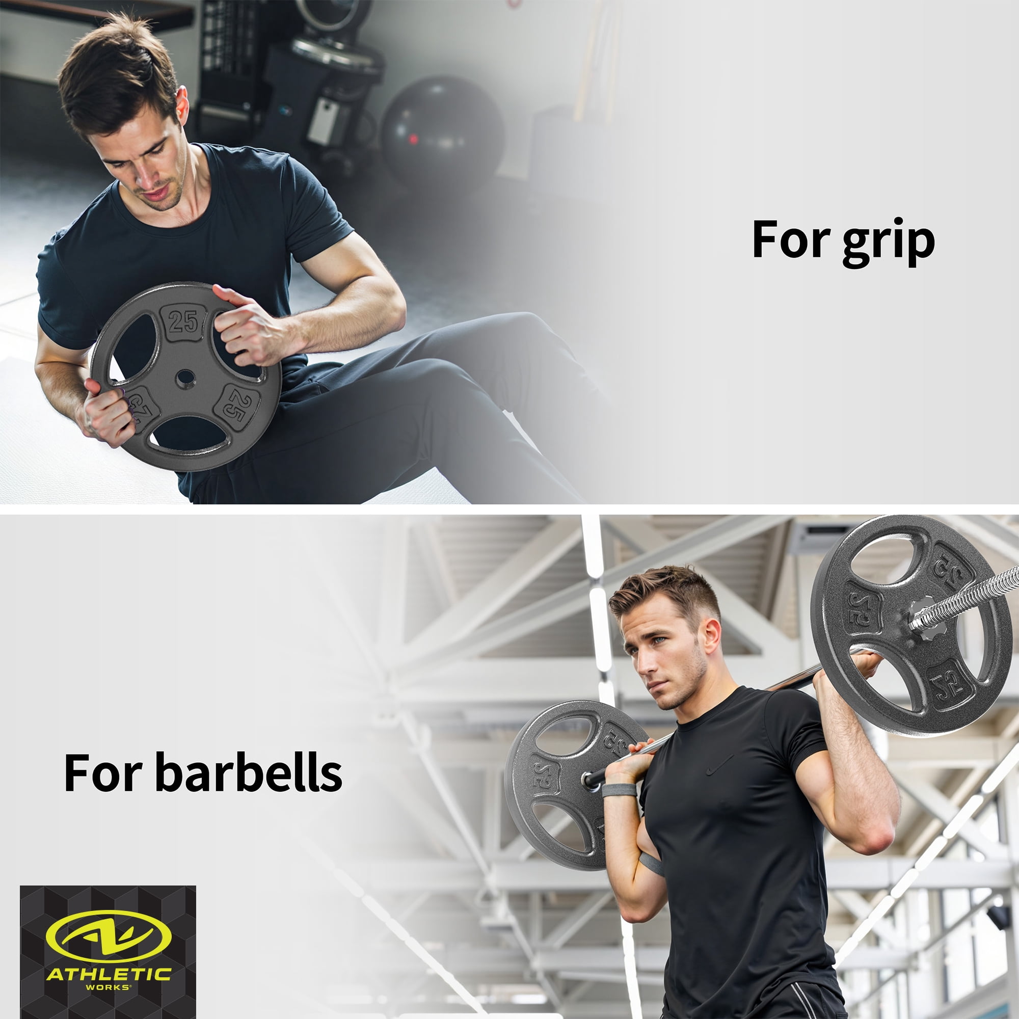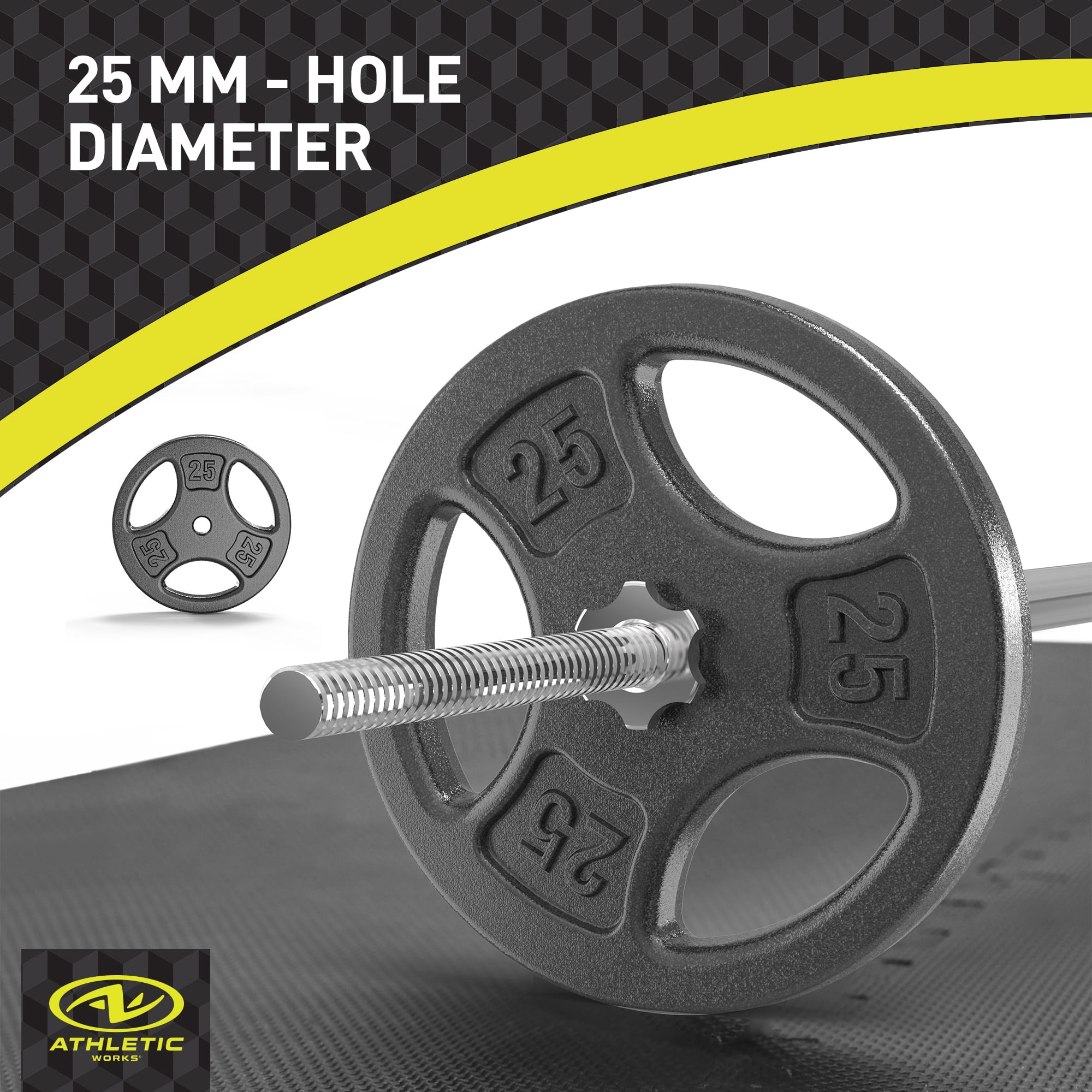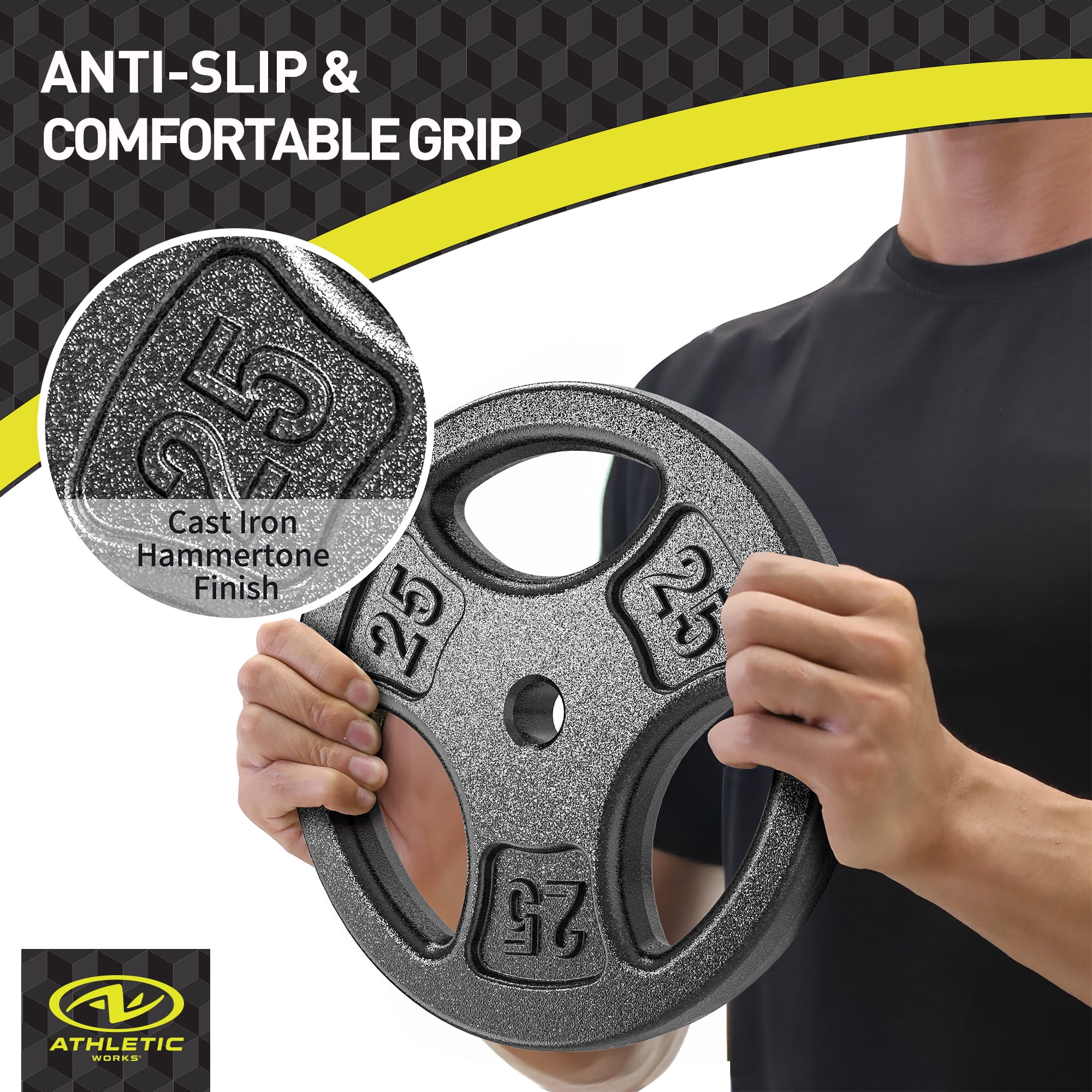 Athletic Works 50LB Cast Iron Standard Weight Plate Sets, 2piece Each of 25LB Premium Durability & Strength: Crafted with precision using automated casting lines and heavy-duty solid iron, these weight plates offer exceptional durability and stability for all your workouts. The Hammertoe paint finish ensures no unpleasant odor, prevents fading, and resists chipping and peeling for long-lasting performance. Versatile Training Tool: Perfect for building muscle, boosting strength, enhancing balance, and improving flexibility, this weight plate set is ideal for weightlifting, strength training, and general fitness. The individual plates are also great for warm-up routines, making them suitable for both beginners and advanced athletes. Ergonomic & User-Friendly: Featuring a 3-hole grip design, these plates provide a secure and comfortable hold for effortless handling. Ideal for home gyms, the ergonomic grips ensure ease of use during every workout session.