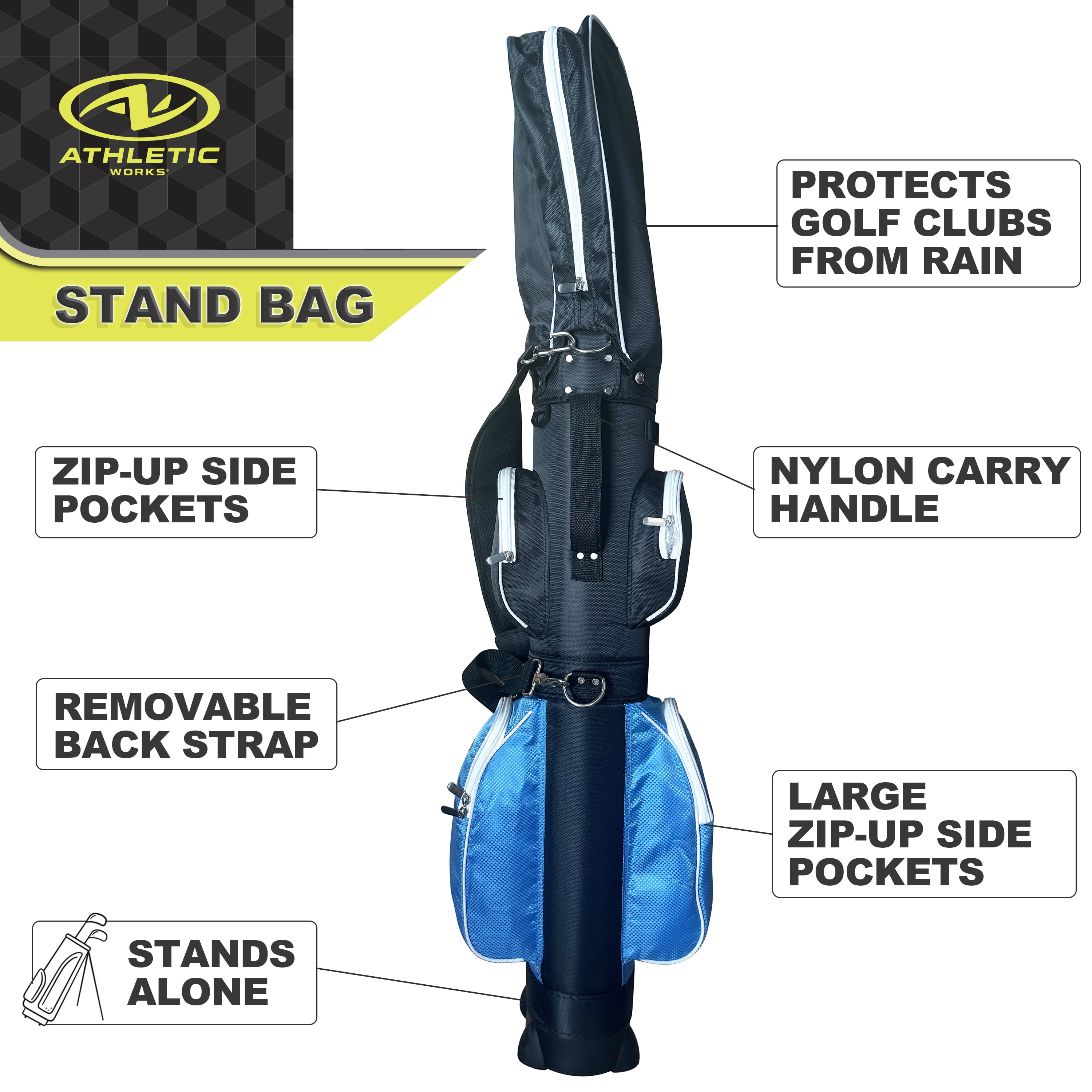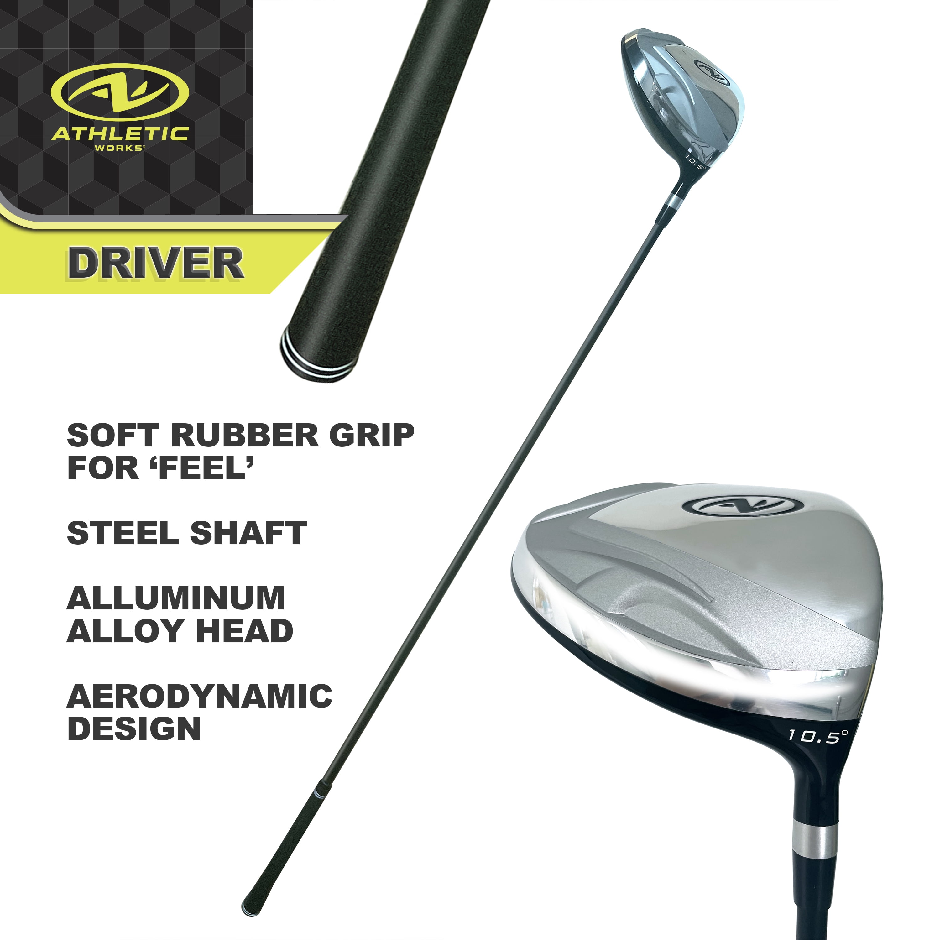 Athletic Works Men`s Golf Club Set 7 Piece Right Handed What’s Included: Driver Fairway Driver Hybrid 7-iron 9/PW Putter Golf Bag Equipment Features: Men’s 7 Piece Starter Golf Club Set with Golf Bag Drivers are constructed with Aluminum Alloy heads and Steel Shafts for accuracy and durability Sleek Hybrid Club designed for in-between distances on the course Irons are stainless steel and geared for precision Blade Putter encourages consistent strokes on the green Grip Material: Soft Rubber for grip and feel through your swing Golf Bag Material: Durable Nylon Golf Bag has straps for easy carry and golf cart attachment Color: Black, Yellow Right-Handed Men’s Beginner Golf Club Set Athletic Works
