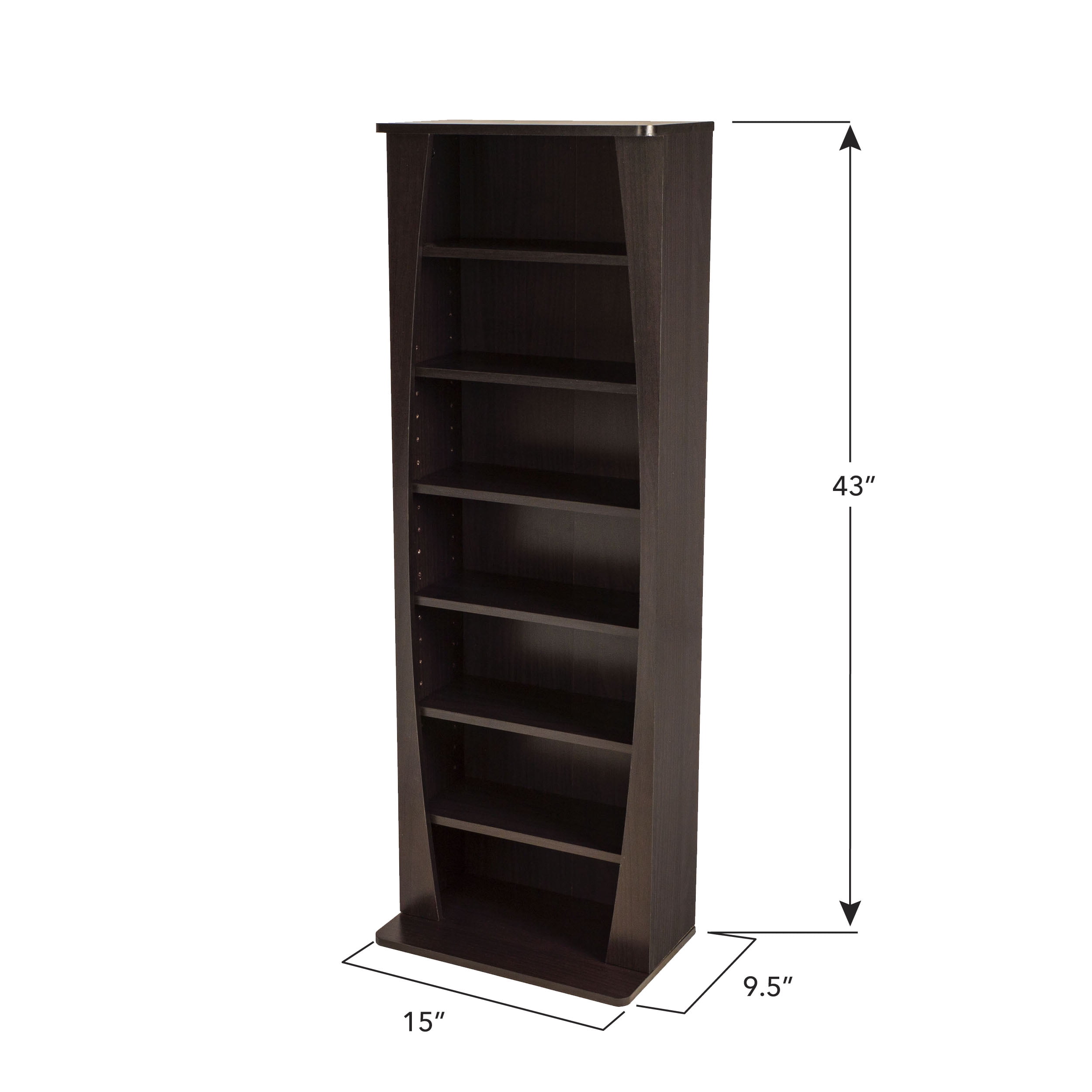 Compact and lightweight frame Overall dimensions(in): 43.13H x 9.38W x 15.00D Wide base provides greater stability Adjustable shelves for efficient organization Elegant espresso finish Easy Assembly