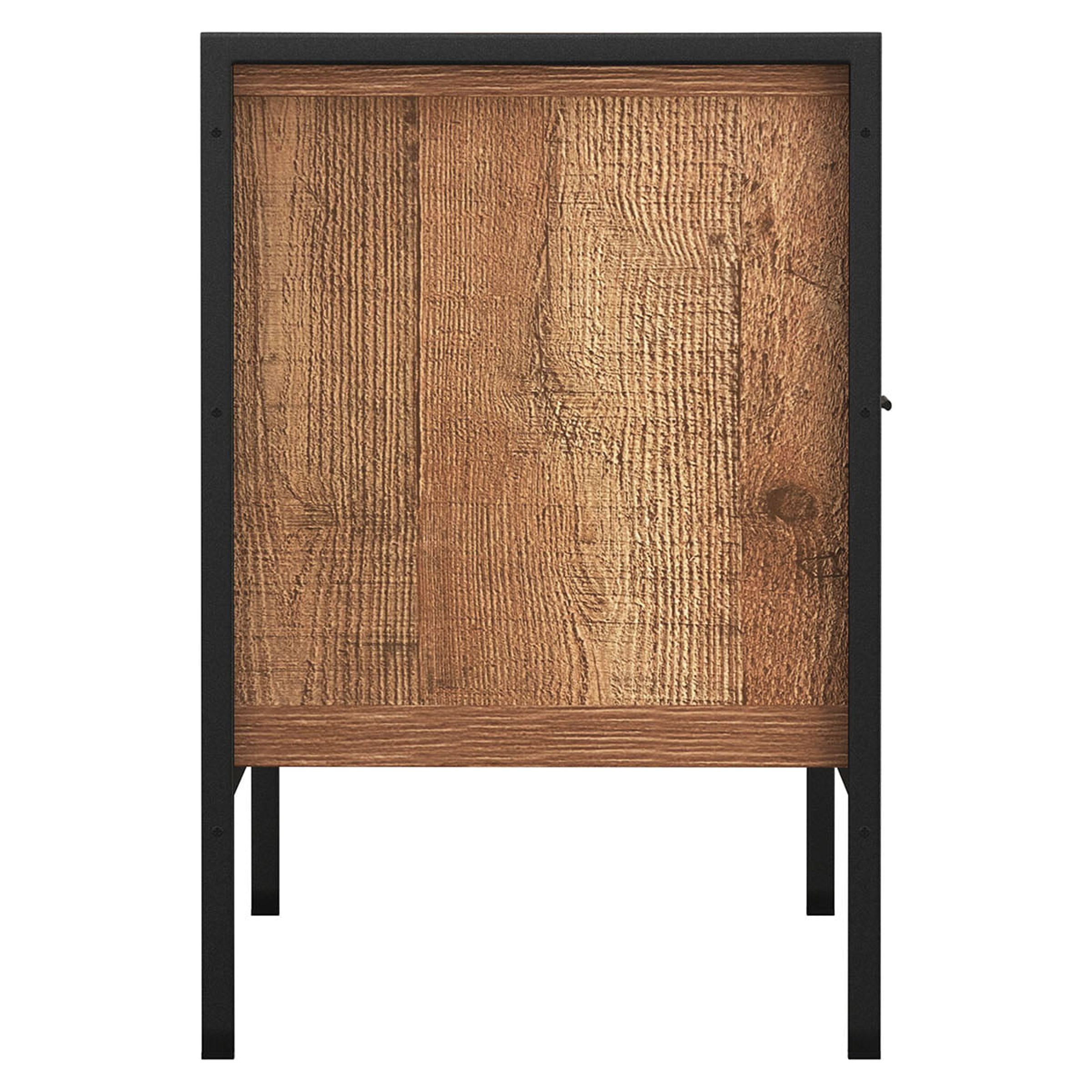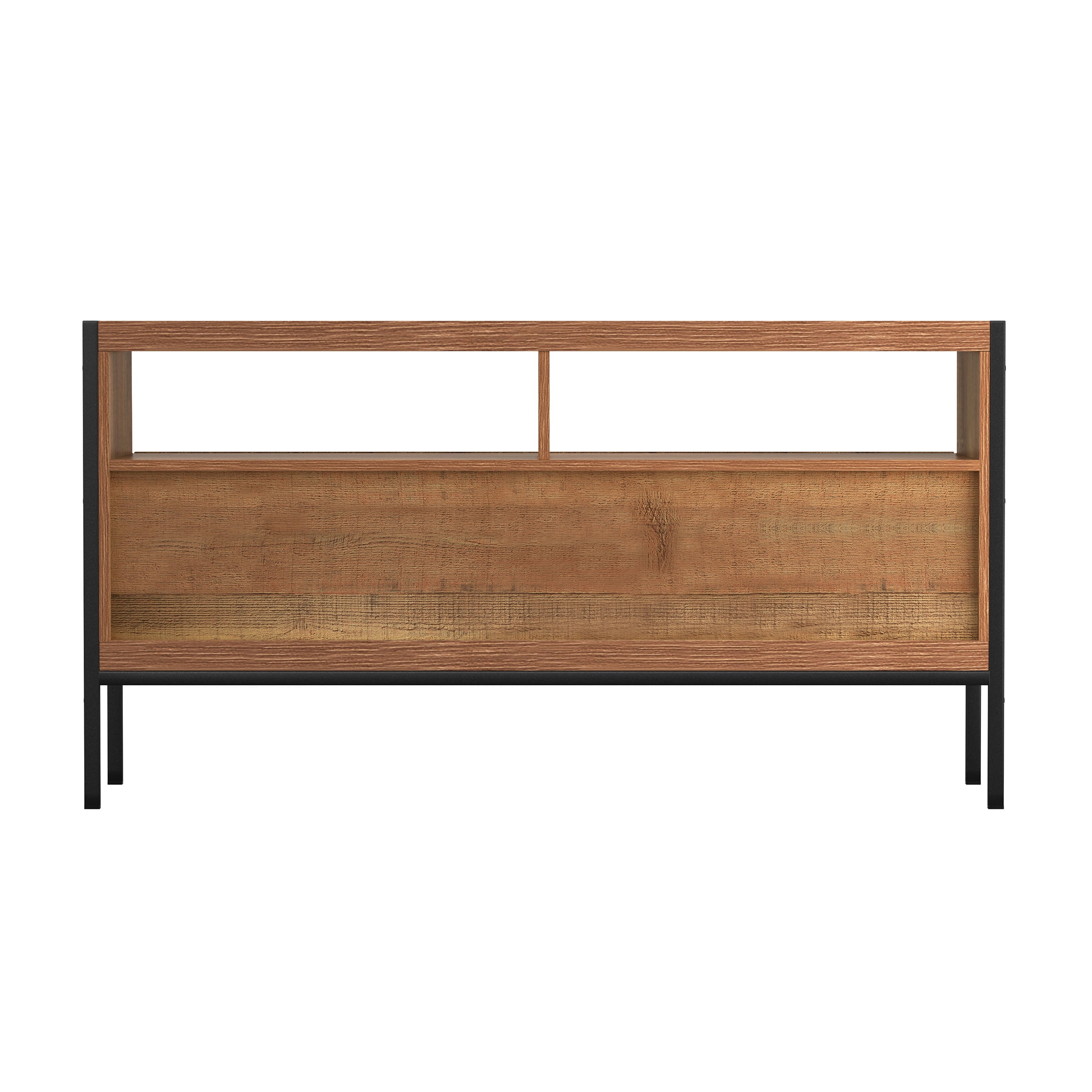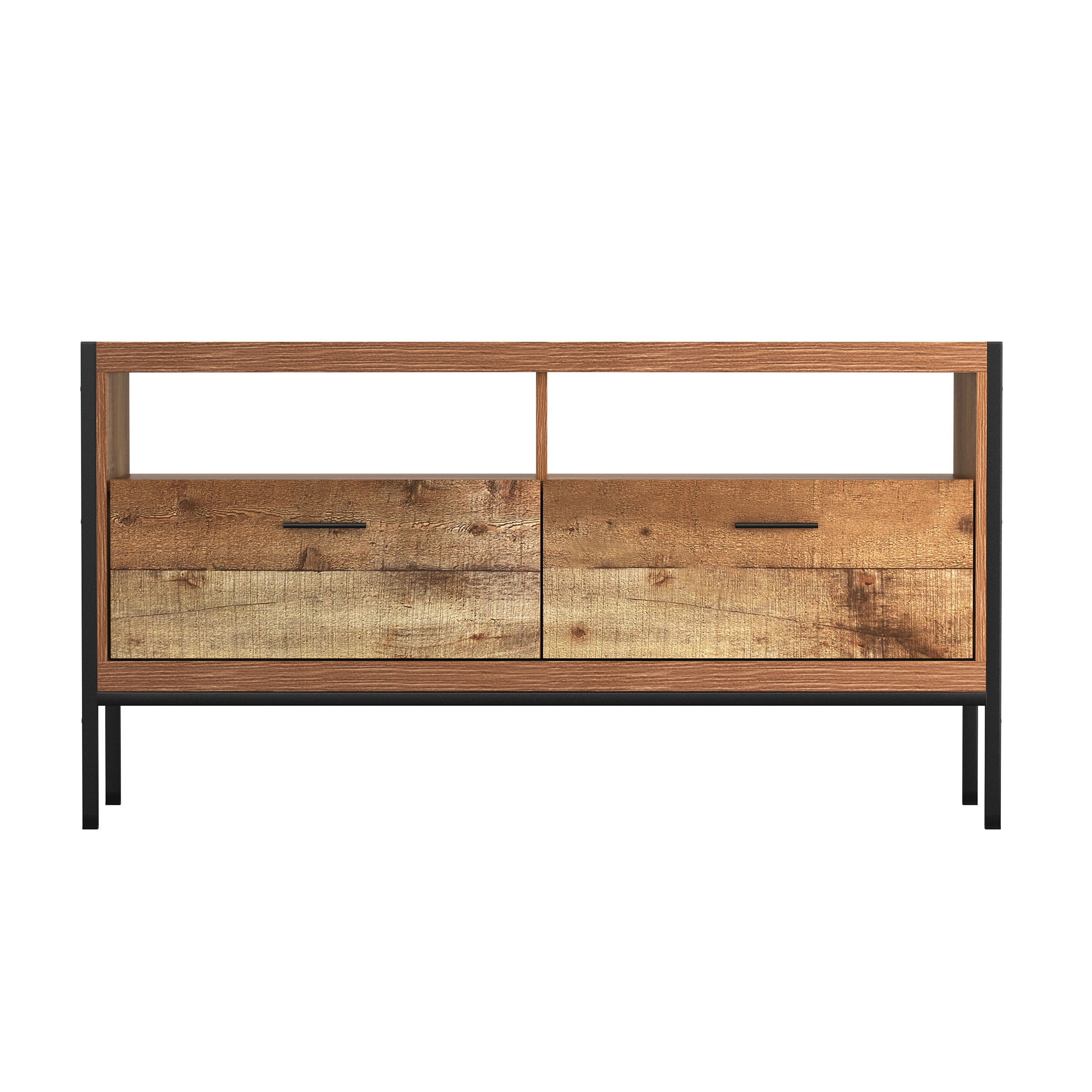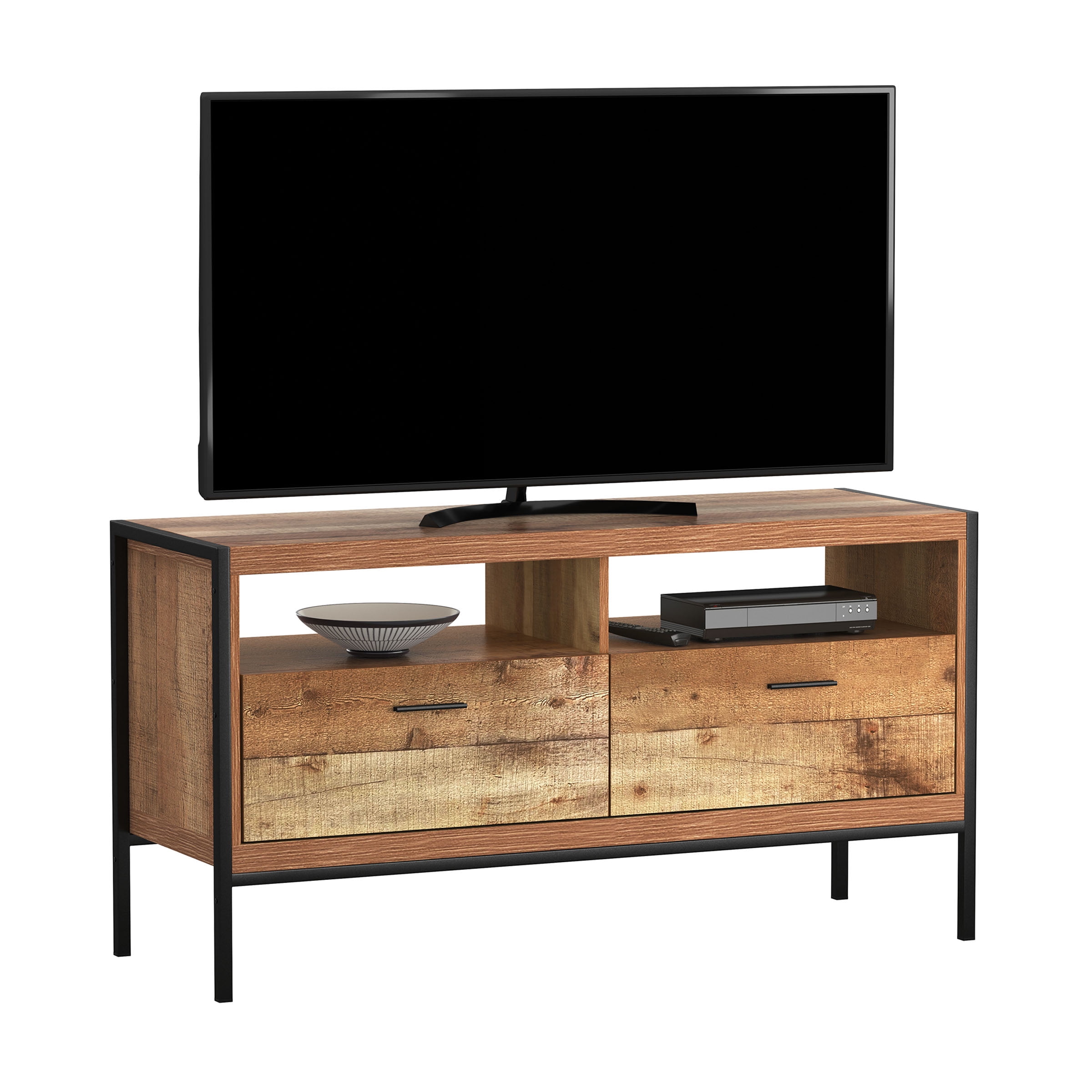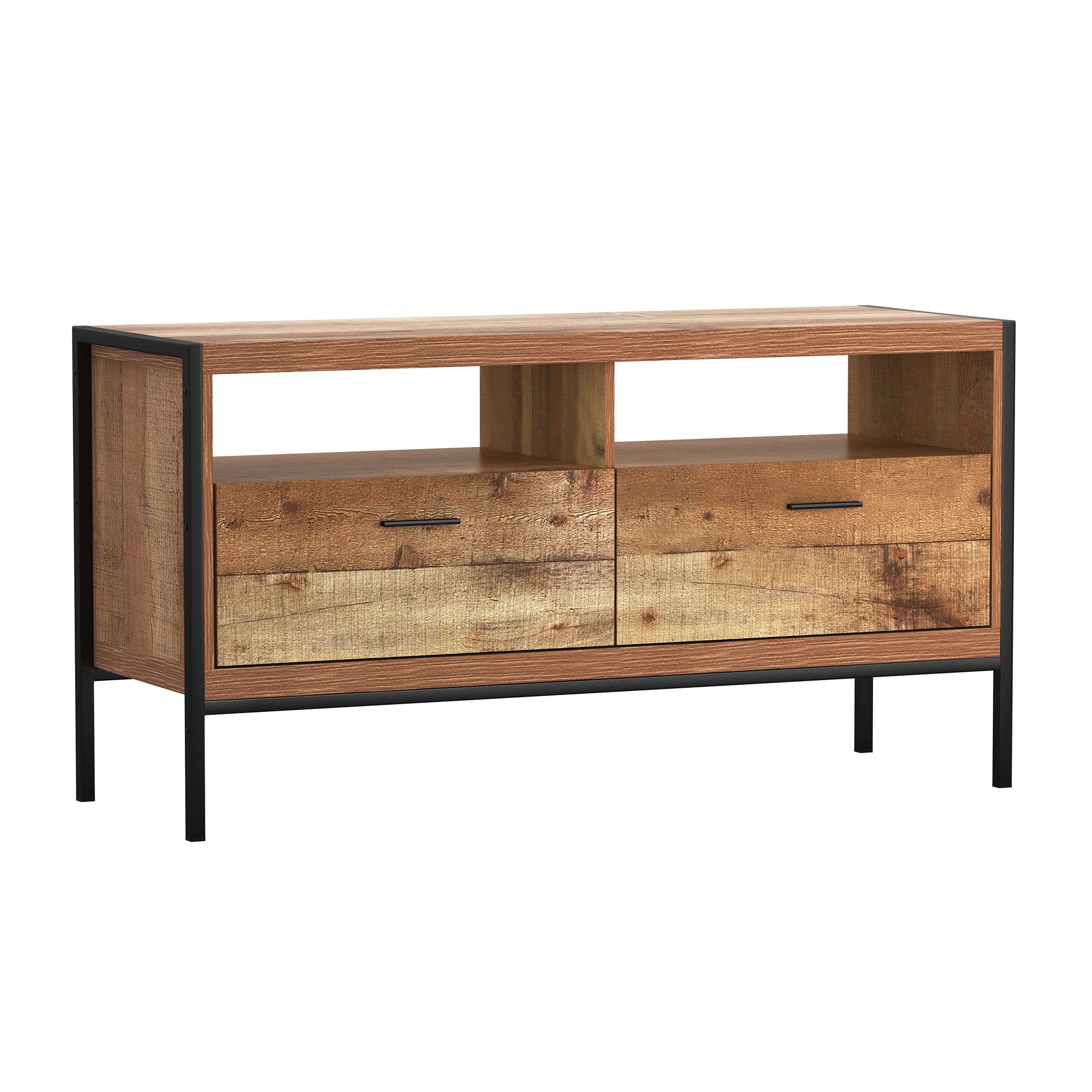 Supports TVs up to 50ā Two full-extension drawers with metal glides and sleek metal pulls Two open shelves for A/V equipment or decorative storage Sturdy, powder-coated tubular metal frame Raised legs for easy underneath cleaning Contemporary rustic style design with two-year warranty Weight Limits – Top: 88 lbs; Drawer: 6.6 lbs