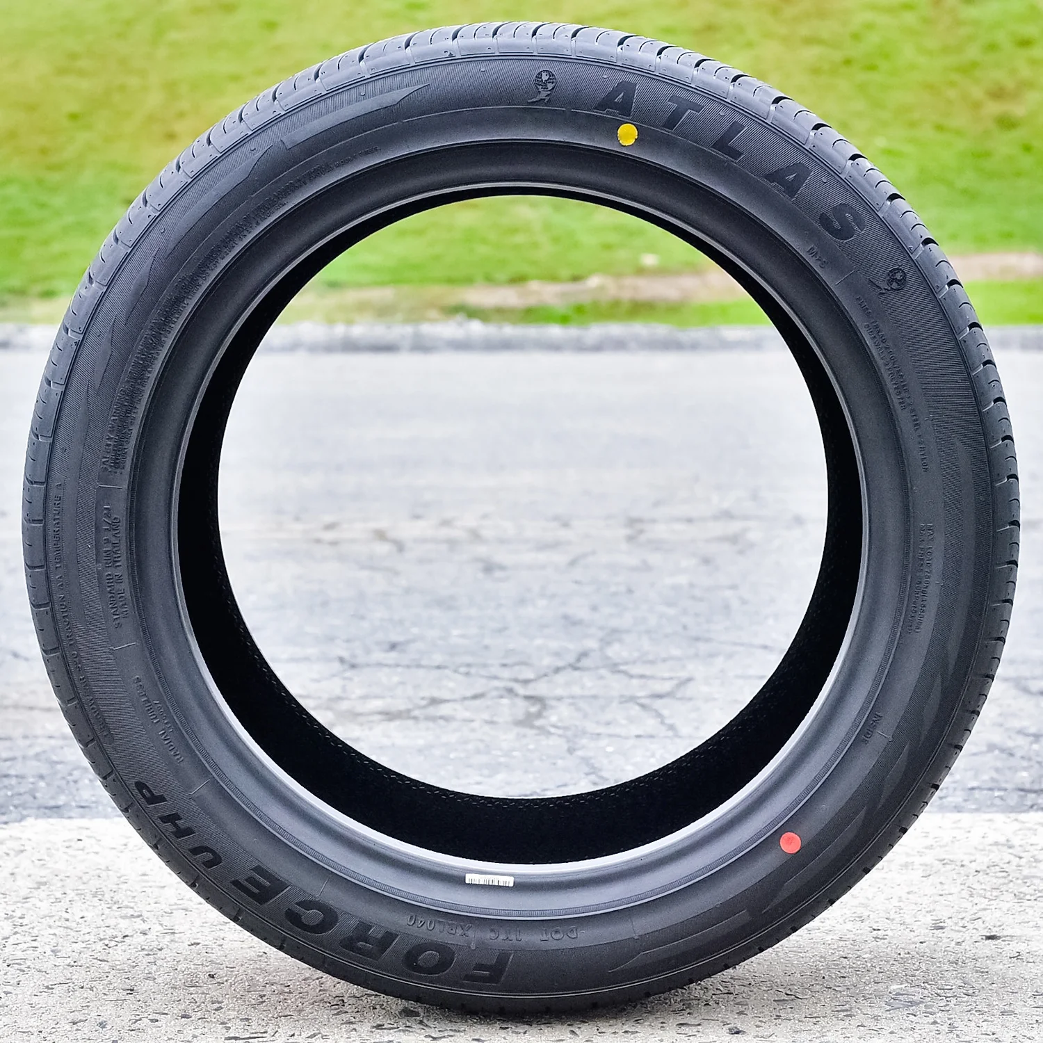 Atlas Tire Force UHP FEATURES AND BENEFITS Excellent all weather traction Longer lasting tread life Low road noise Superb high-speed stability OVERVIEW The Atlas Tire Force UHP is a performance and high performance, depending on the speed rating of the specific tire size, all season tire constructed for passenger and crossover vehicles and SUVs. This tire model has excellent all weather traction, and will perform well in winter weather. The asymmetric tread design helps grip the road surface firmly during on-road driving, which enhances the driving safety. The wide grooves in the tread pattern evacuate water and mud from under the tread and effectively prevent hydroplaning. The intricate siping design enhances its grip in light snow, and improves the cornering and braking ability. Even at high speed, this model does not lose its directional stability. It maintains its shape at any speed and does not deform under pressure. The asymmetric siping design of this performance model gives additional road grip and traction for maneuvering at high speeds. The center rib in the tread design offers good contact between the tire and the road increasing the steering precision, making it easier to handle. The Force UHP’s maximized road contact patch helps reduce the road noise heard in the cabin of the vehicle, enabling a comfortable driving experience. This also makes the tire resistant to irregular wear by equally distributing the driving force along the tread. This allows a slower wear ratio, which lengthens the tire’s tread life. Manufacturers recommend changing tires every 10 years. As long as tires are properly stored before they are sold, the year of their manufacture will not shorten their service life.
