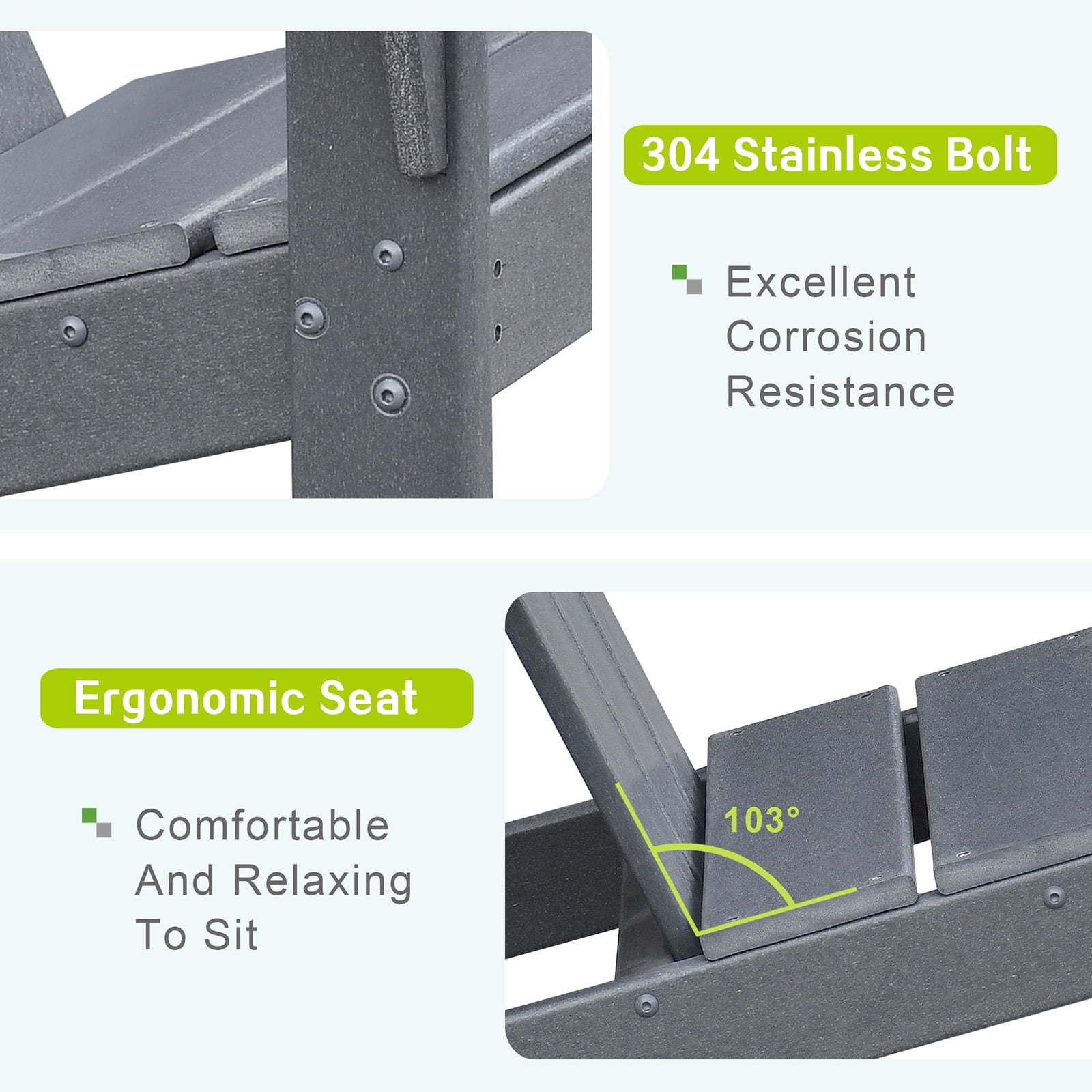 ATR ART to REAL Adirondack Chair is a perfect choice to sit back comfortably in the great outdoors and take in the beauty of your backyard. Made with solid, heavy-duty, marine-grade HDPE, the weather-resistant chair, makes it suitable for outdoor placement and use. The seats of the Adirondack chair are wide and flat, giving people enough space to rest and relax. The resin adirondack chair is made with excellent durability which is eco-friendly, anticorrosion, and not easily cracked, unfaded, or deformed. Its weather resistance allows it to withstand various weather conditions without being affected by sunlight, rain, or wind. HDPE Adirondack chair easy to maintain, can place your cup or mobile phone in the handle of a chair. Only needs washing with a brush with soft bristles and rinsing with clean water. If it is not very dirty, you can wipe it off with a wet rag. ☞ Click here to buy the Navy Blue/Dark Grey Folding Adirondack Chair if neededNow $109 $169 ☞ Click here to buy the Navy Blue/Dark Grey 3 Pcs Foldable Adirondack Sets if neededNow $229 $369 Feature : High-density polyethylene (HDPE) material, ensures superior strength and durability. 103° tilt angle for a deeper sitting position for comfortable seating. Never fade, splinter, crack, chip, peel, or rot when exposed to the elements. Easy to clean, easily wipes away water spots, stains, or dust. Easy to maintain, UV resistant, and non-cracking. Easy assembly, only 4 assembled modules, easily complete the installation. 304 stainless bolt, excellent corrosion resistance. Suit for outdoor, garden, porch, lawn, and firepit area chairs. Weight capacity of 380 pounds. Specifications : 1.Material: HDPE Resin 2. Color: Dark Grey 3.Adirondack Chair Size :(21.8 x 29.5 x 33)” / (80 x 84 x 33)cm (L x W x H) 4.Adirondack Chair Weight:31.5lbs(14.3kg) 5. Weight Capacity: Support up to 350 lbs What You Get : 1 x Adirondack Chair 1 x Instruction All the Hardware