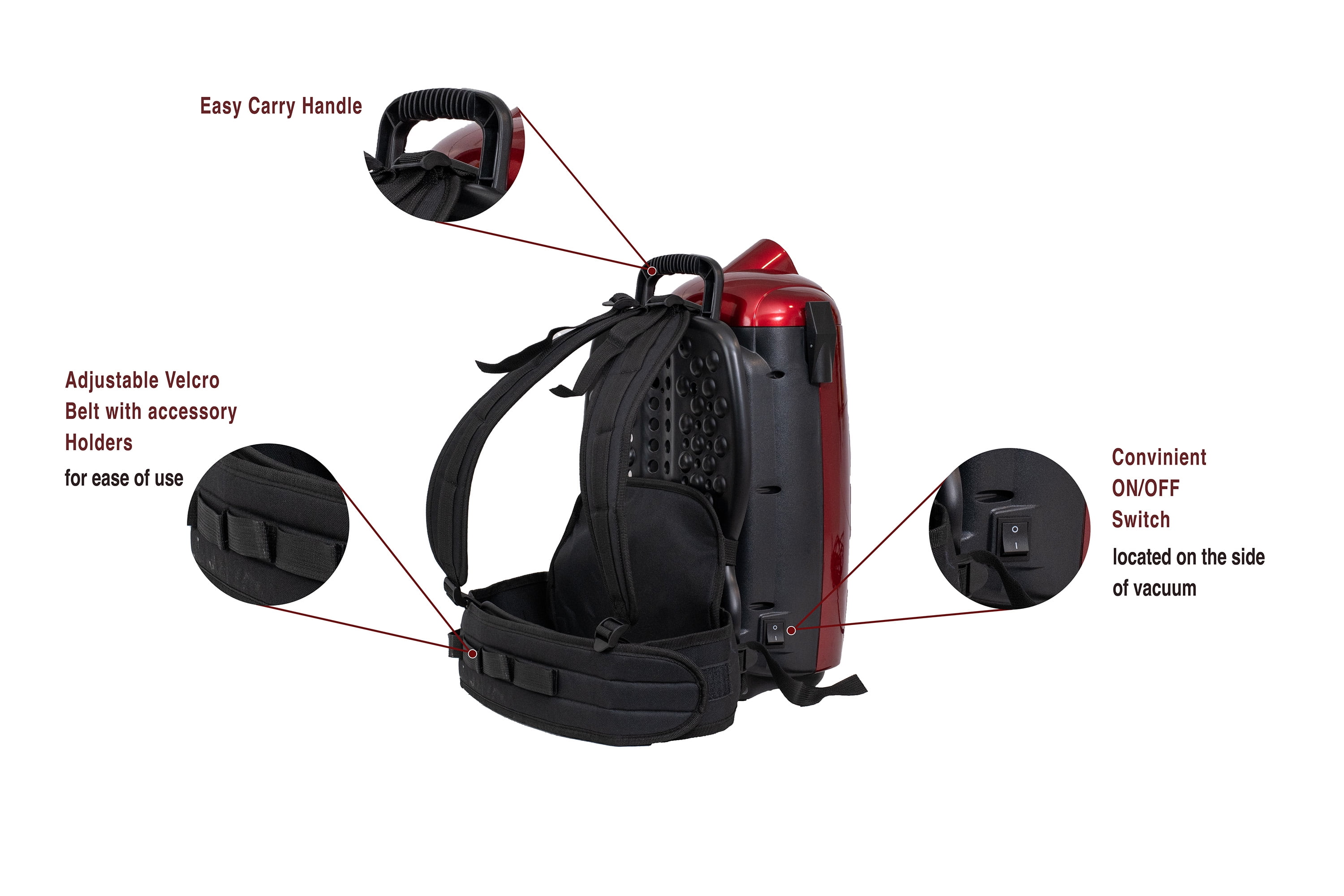 1,400 Watt motor with 106 CFM suction power Lightweight and low profile backpack design Multi-surface tools for carpets, hard surfaces, upholstery, and hard-to-reach areas 4-stage filtration system with HEPA bag Large hose opening to reduce clogs
