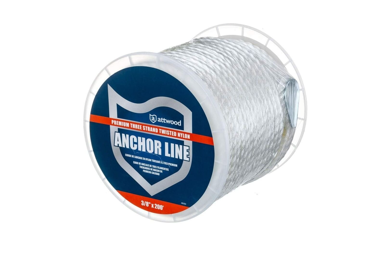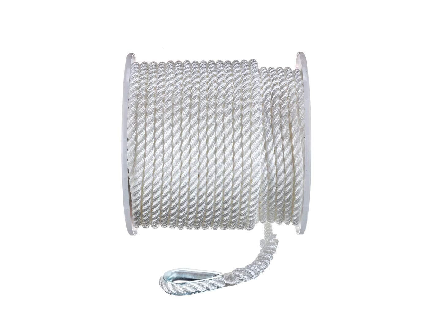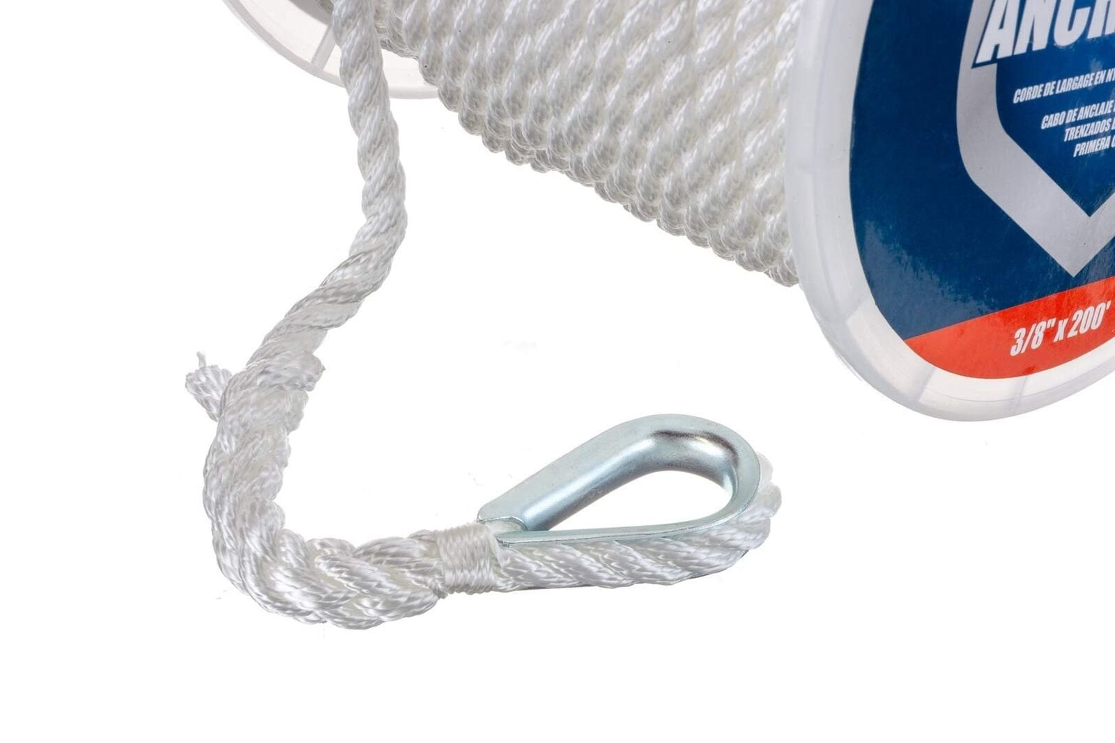Twisted nylon with thimble 3/8″ x 200′ 200′ white marine anchor rope is conveniently packaged on a spool Extremely strong rope designed to absorb sudden shock loads Durable metal thimble