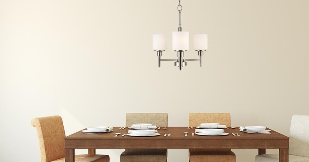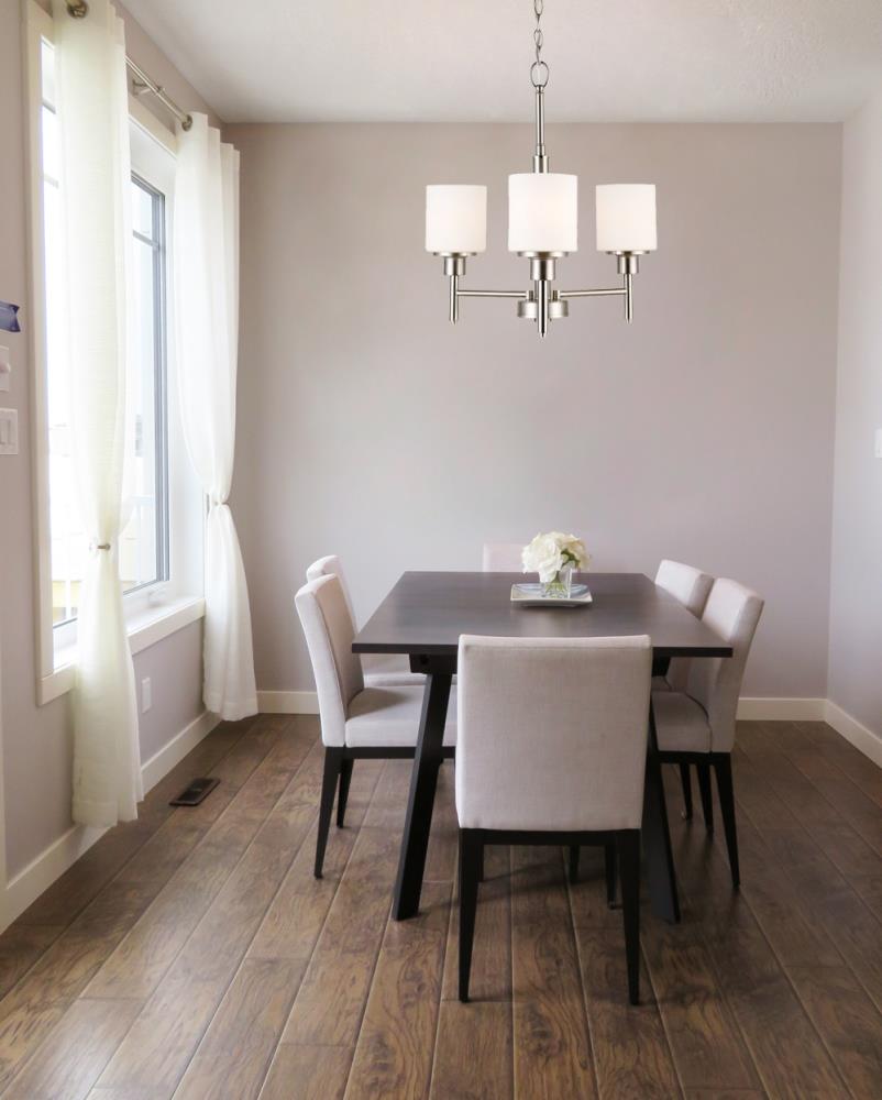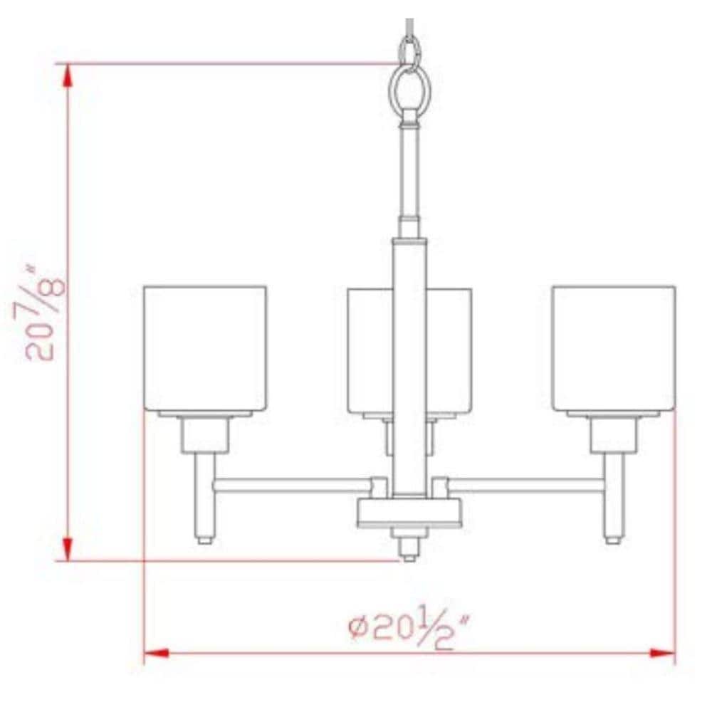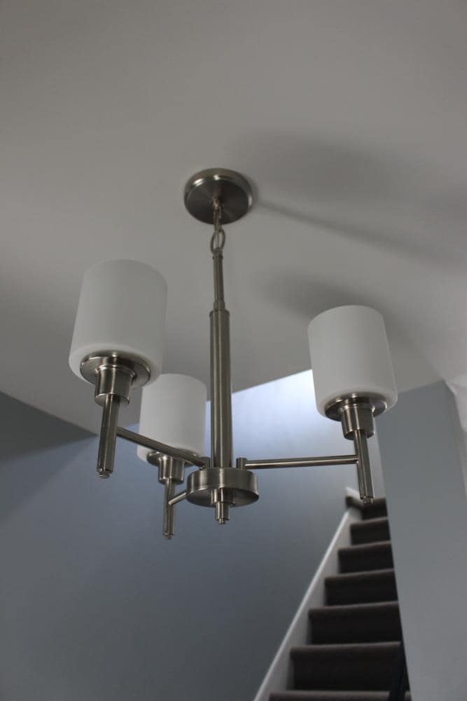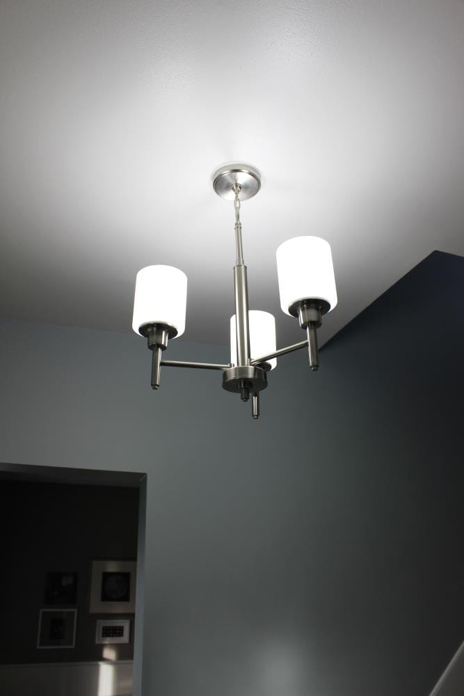 The Design House 556647 Aubrey 3-Light Chandelier adds a touch of elegance to any entryway, dining room, or foyer with its satin nickel finish and white frosted glass shades. Combining traditional and modern elements, this chandelier enhances various interior styles, providing a warm and inviting ambiance. Constructed from durable formed steel, the fixture is designed for indoor ceiling mount applications and offers easy installation. It includes 48 inches of chain and 60 inches of cord for adjustable hanging height. Measuring 20.90 inches in height and 20.5 inches in width, it accommodates three 60-watt medium base bulbs or LED equivalents (not included), ensuring ample illumination. Fully dimmable when used with a compatible dimmer switch (sold separately), this chandelier allows you to create the perfect lighting for any occasion. This product is cETL/ETL Listed for dry locations. Backed by a 10-year limited warranty, Design House ensures quality and reliability for years to come.