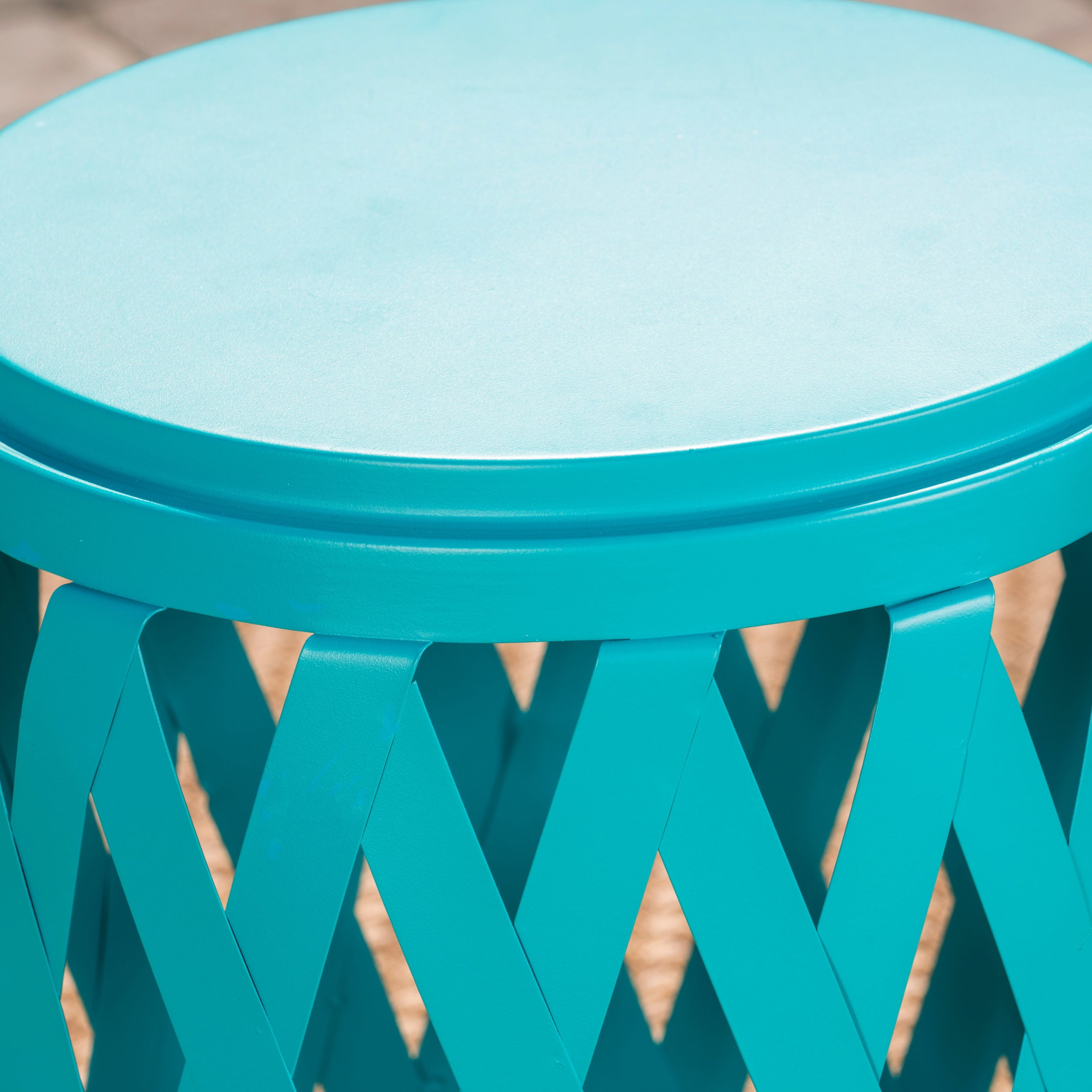 Aubriella Outdoor 14 Inch Diameter Iron Side Table, Teal Includes: One (1) Side Table Material: Iron Multiple Finish Options Hand-Crafted Details No Assembly Required Dimensions: 15.00 inches deep x 15.00 inches wide x 22.75 inches high Weight Capacity: 15.00 lbs