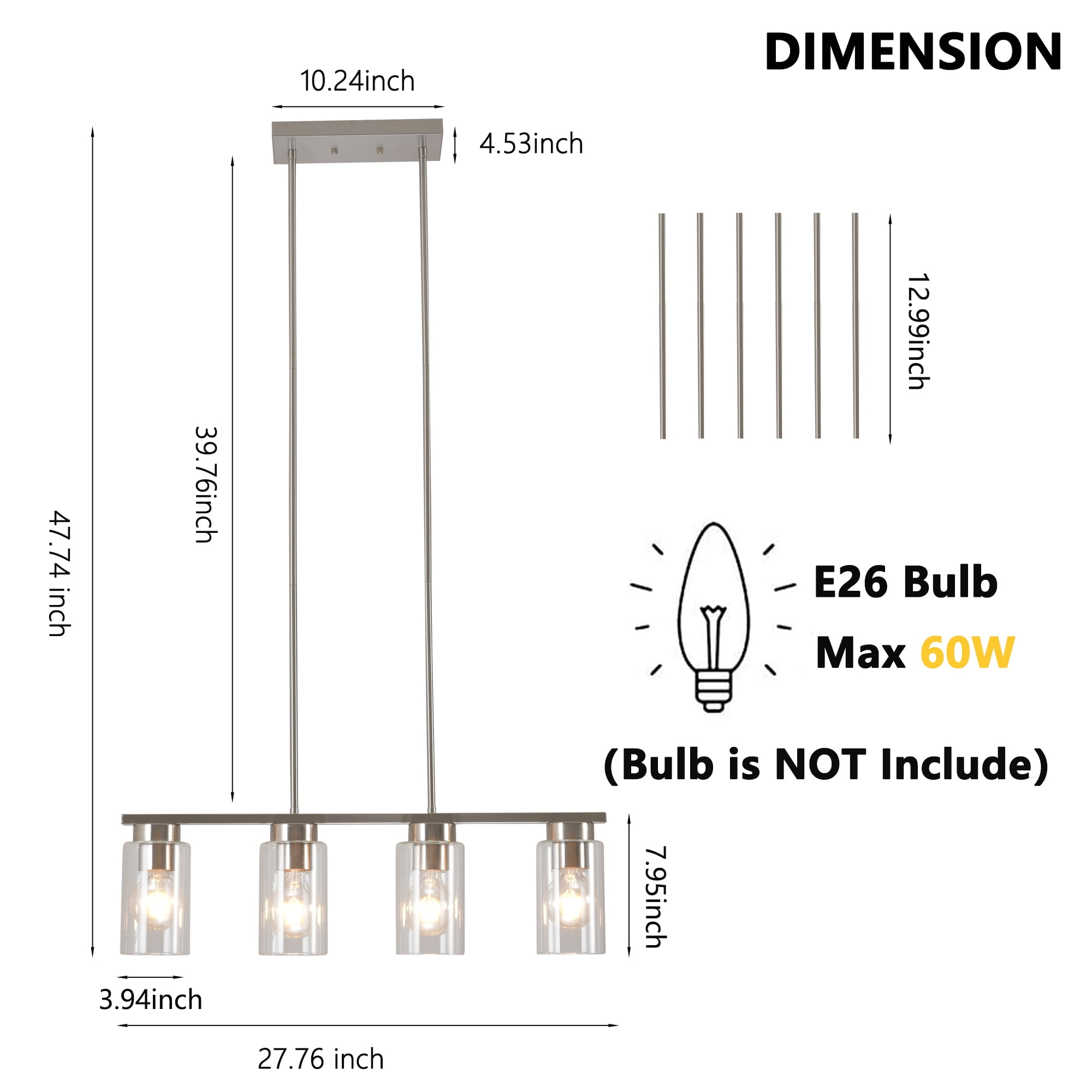 Features ✔Various E26 base bulbs compatible and dimmable bulb ✔E26 X 4 US standard base(Bulb No Include),60 watt max ✔Height adjustable: three heights available (12.99″/25.98″/38.97″) ✔Assembled dimensions:27.76″wide x 47.72″ high ✔4 Light pendant light fixture with clear glass lampshades ✔Easy & Quick installation of island pendant light for kitchen ✔Nickle Glass Chandeliers suitable for flat ceiling
