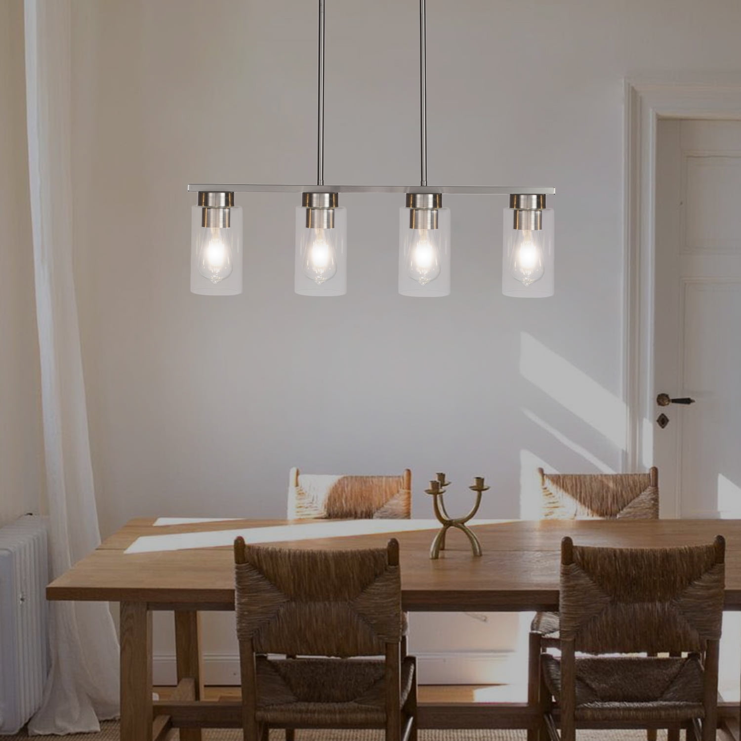 The kitchen island light fixtures with 4 glass cylinder shade and polished chrome finish, the glass shades of the linear pendant light brush nickel create a wonderful glow, bring an elegant and concise atmosphere to your home. It is definitely the best choice for your home lighting and decoration.This 4-Light island pendant light allows you to freely adjust the length of the rod to suit different ceiling heights according to your needs Specification: Material:Metal and Glass Color:Brushed Nickel Wattage:Max 60W Light Source:E26 Max 60W (Bulb Not Include) Light Bulb Type:CFL/LED/INCANDESCENT/HALOGEN (Compatible with dimmable bulb) Bulb base:Compatible with any type of E26 bulb Light Bulb Included:NO Number Of Lights:4 Power Source:Corded-electric Voltage:110-120 Volts Application environment:Dry locations Application Area:Kitchen; dining room; bedroom; living room; hallway; basement; farmhouse;coffee bar; restaurant; beauty salon; basement;study room; loft;library; powder room; dressing room Package contents: ✔Light fixture *1 ✔Lampshade *4 ✔Mounting accessories*1 set