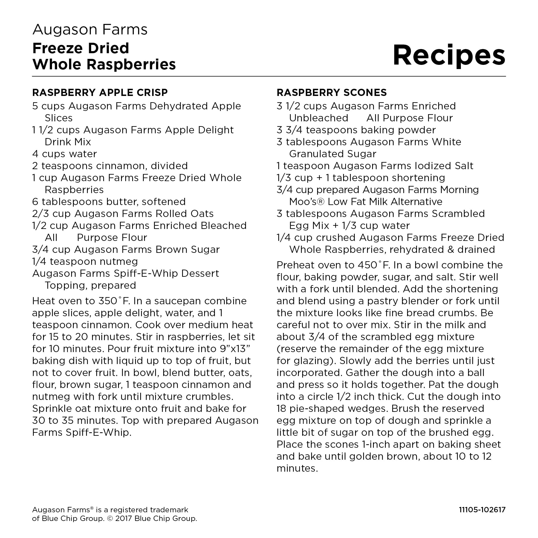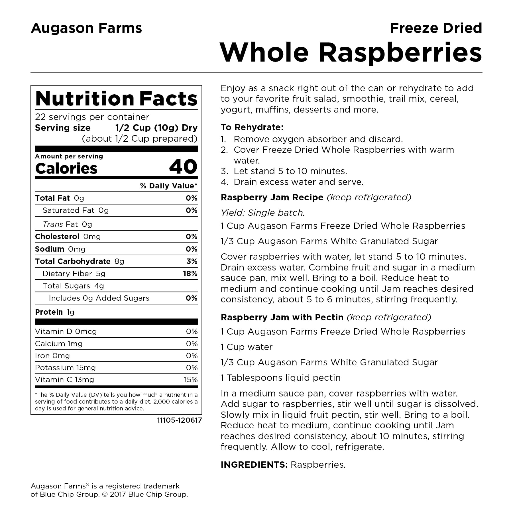 The Augason Farms Freeze Dried Whole Raspberries 8 oz No. 10 Can are a healthy and delicious snack, rich in Vitamin C. They enhance any recipe with tart, full-bodied raspberry flavor. Rehydrate them for use on breakfast cereal, in deserts and fruit dishes. Naturally, they lend themselves to everyday use as well as long term storage. this is a Certified Gluten Free and an all natural product that consists of 22 Servings and 880 Calories, with a shelf life of up to 30 years. All this convenience makes it perfect for Food Storage, Emergencies, Survival, Camping, and Everyday Use! For over 40 years we have refined our recipes and sourced the finest ingredients to create the highest quality, long-term freeze dried and dehydrated meal solutions in the market. While most emergency food storage companies contract their production to outside manufacturers, we produce and package all our food from beginning to end. That means we can promise the best quality and value in the market. Make the wise decision and let Augason Farms give you a peace of mind that’s as essential as it is delicious. Please discard oxygen absorber after opening. Best when stored in a cool dry place at temperatures between 55 and 70 Degrees F (ideal humidity 15%).