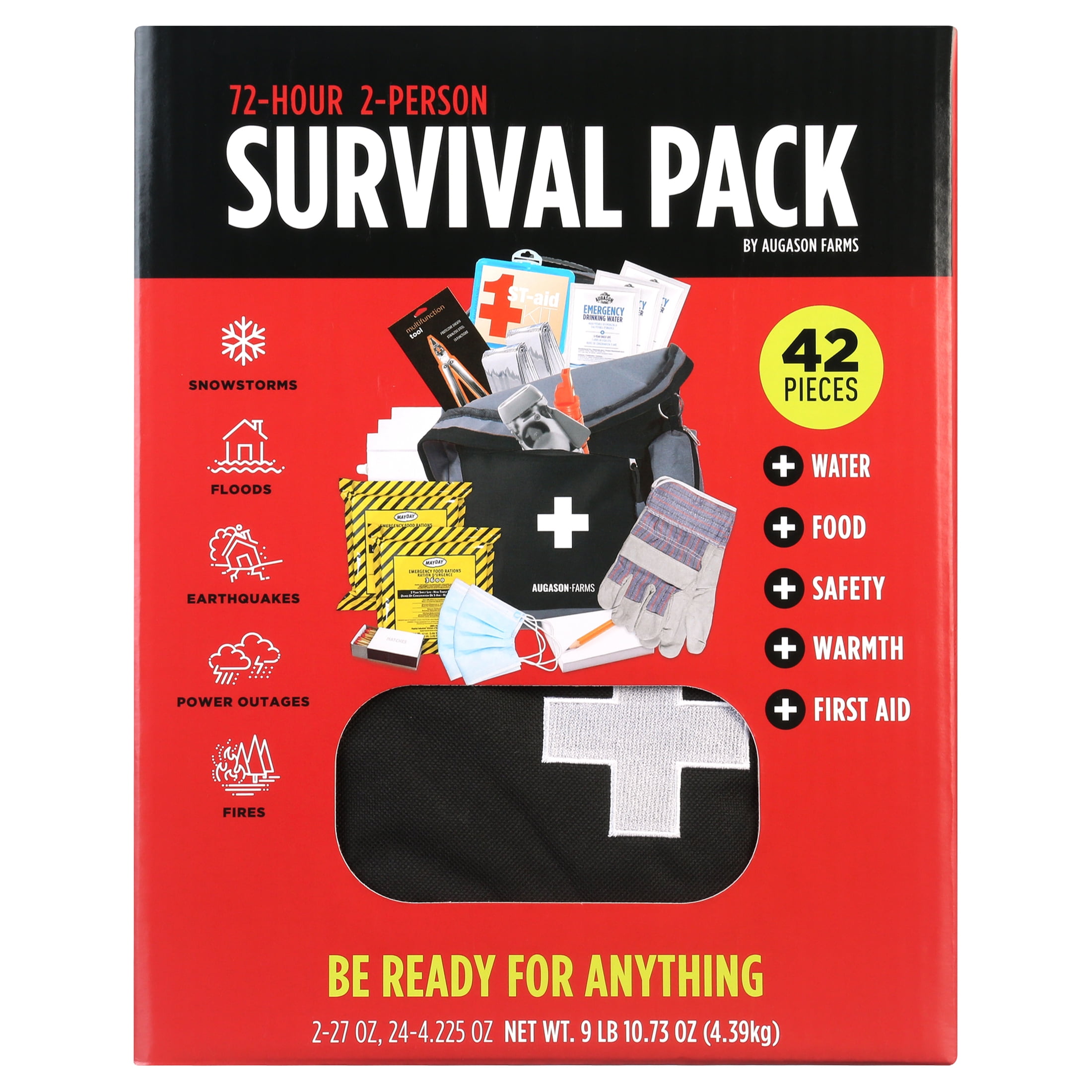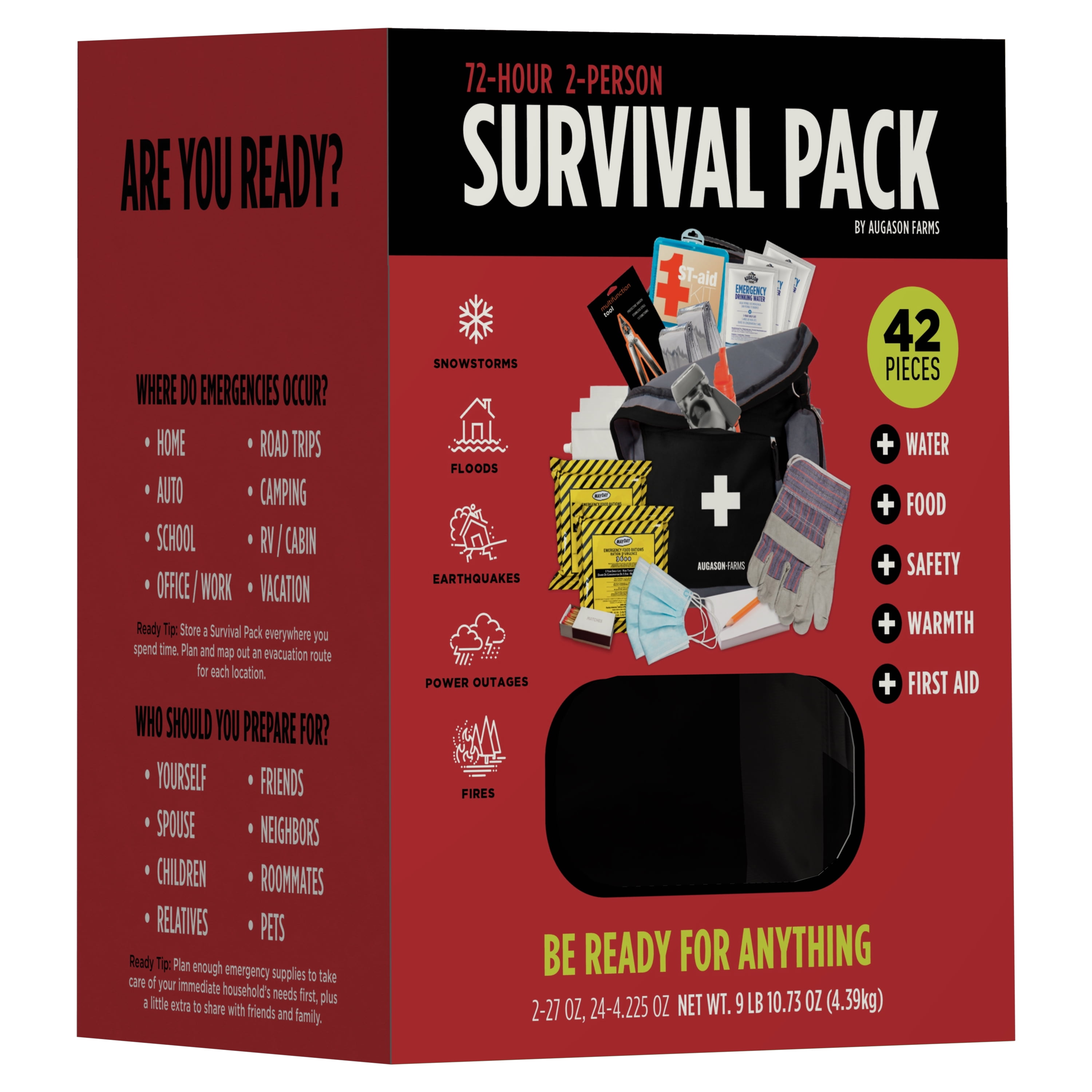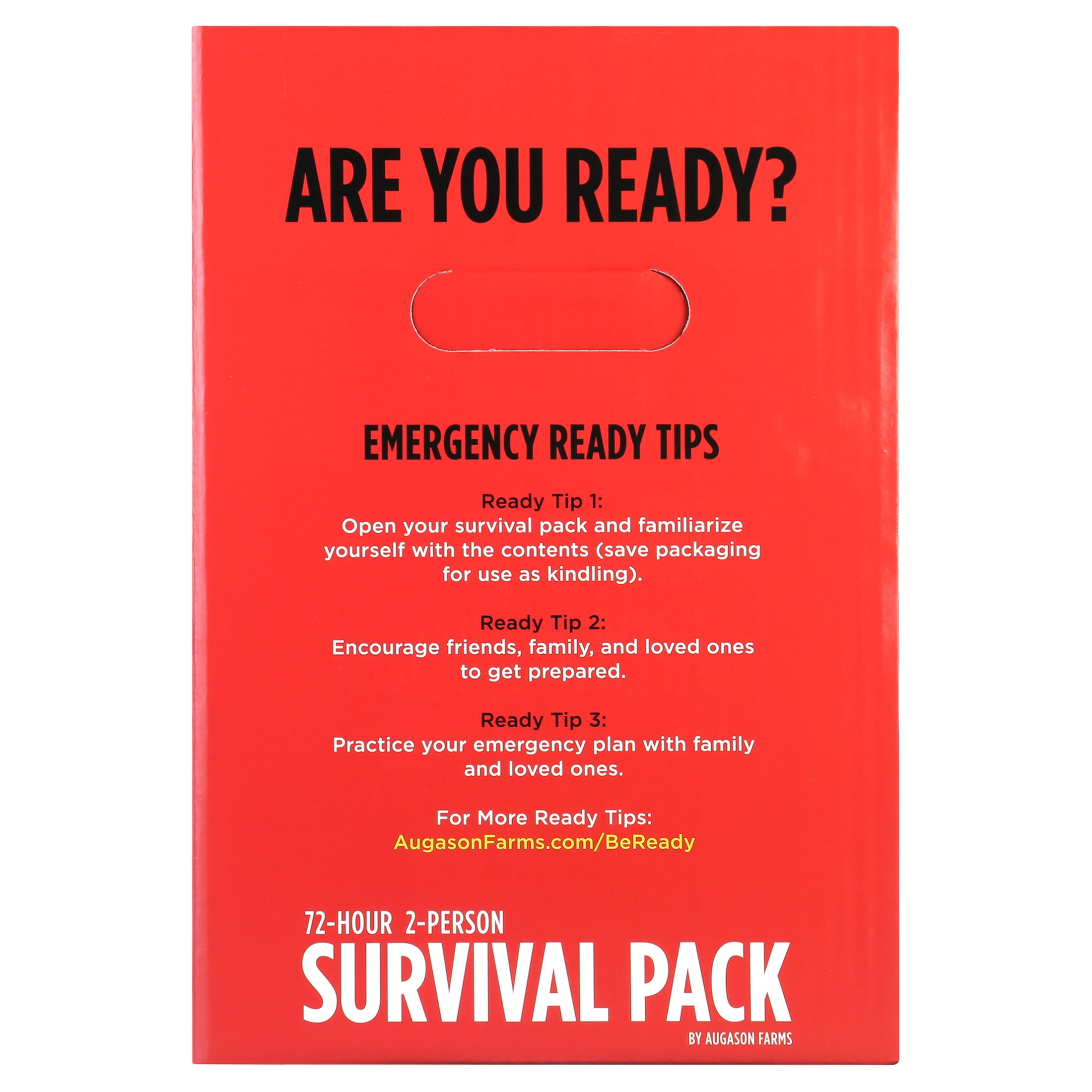 1,200 calories per person, per day 21g protein per person, per day Gear for warmth and safety Shelf life up to 5 years (based on individual storage conditions) Gear for warmth and safety Ready Tips printed on the Survival Pack box, plus additional preparedness tips and tools are available at augasonfarms.com/beReady Lightweight pack weighs under 15 pounds