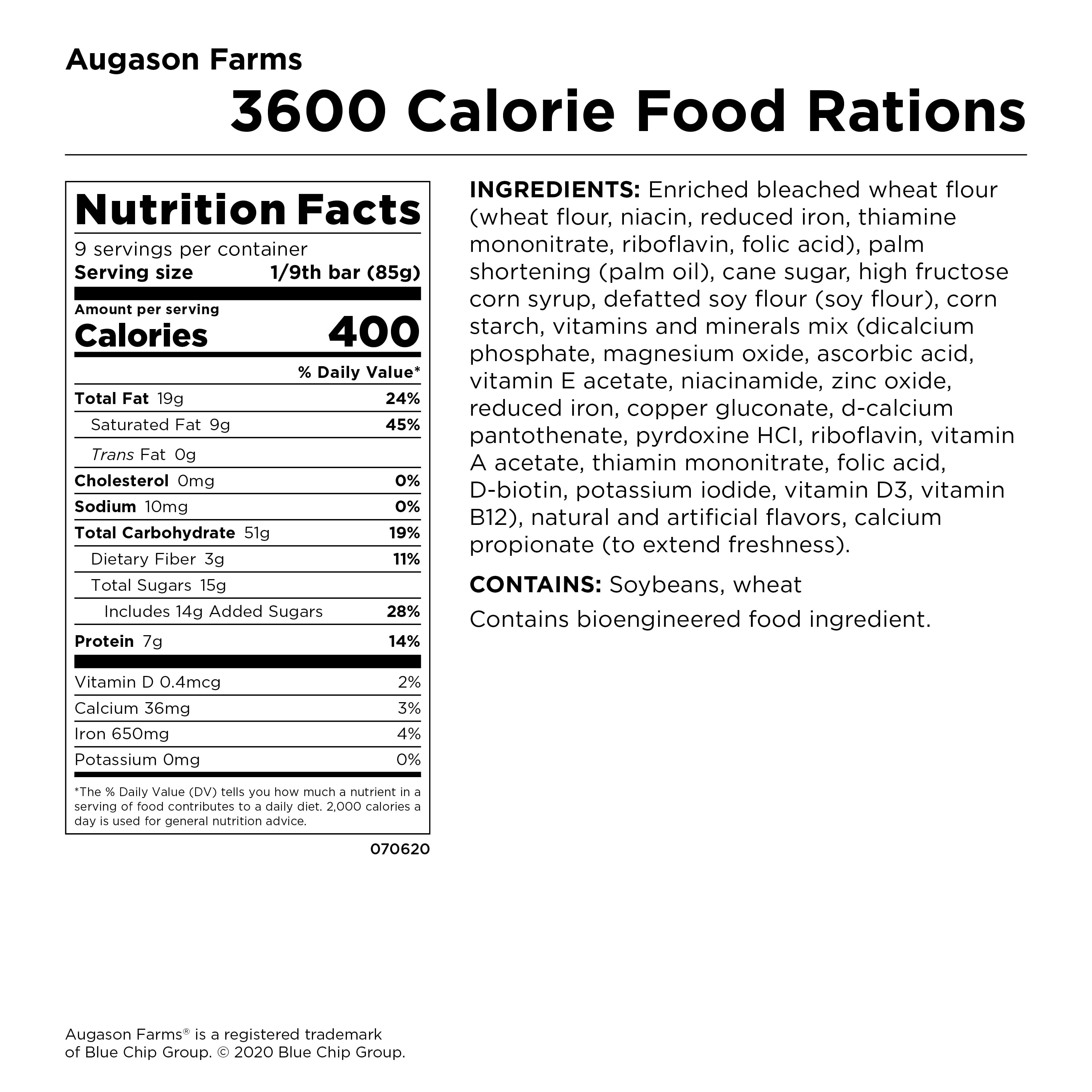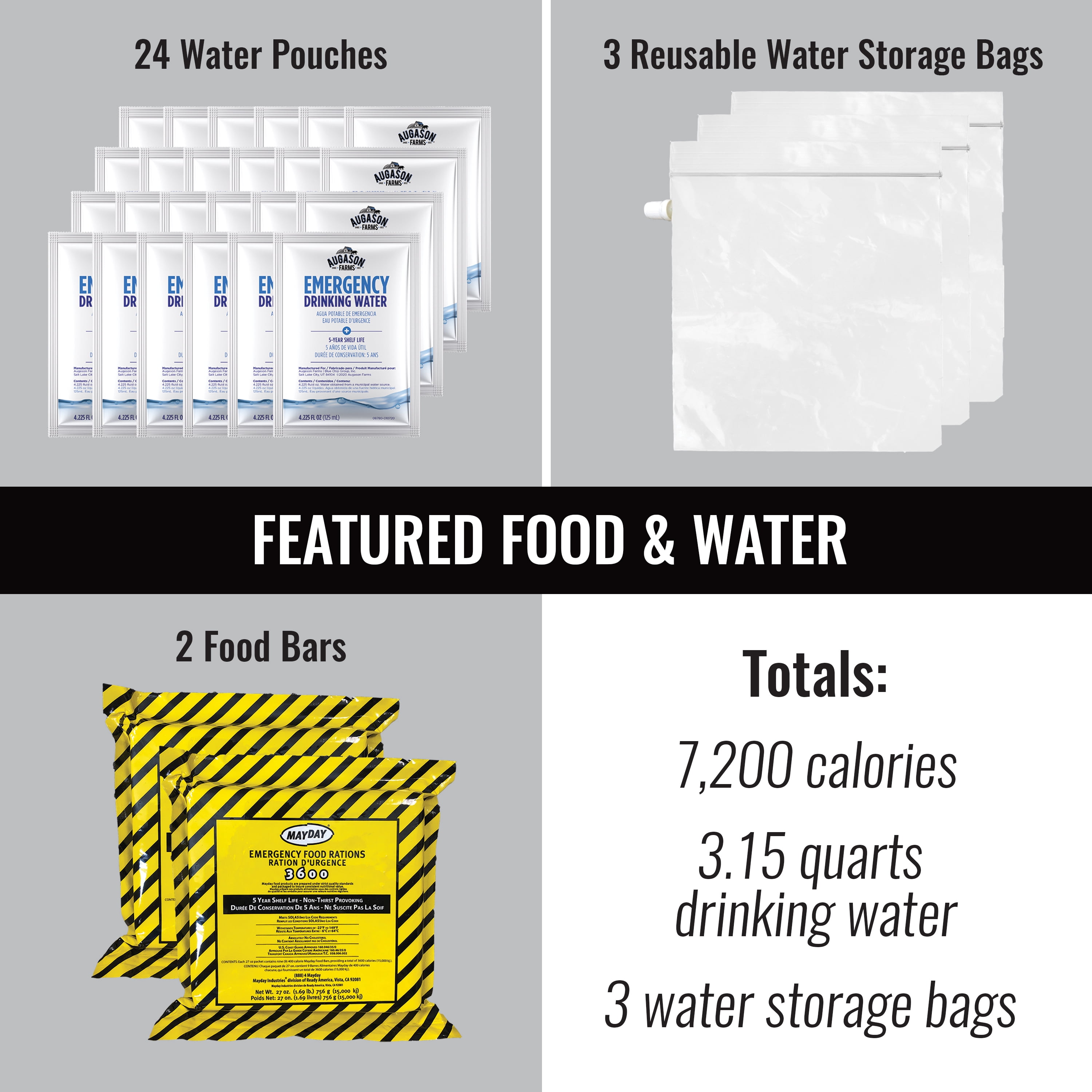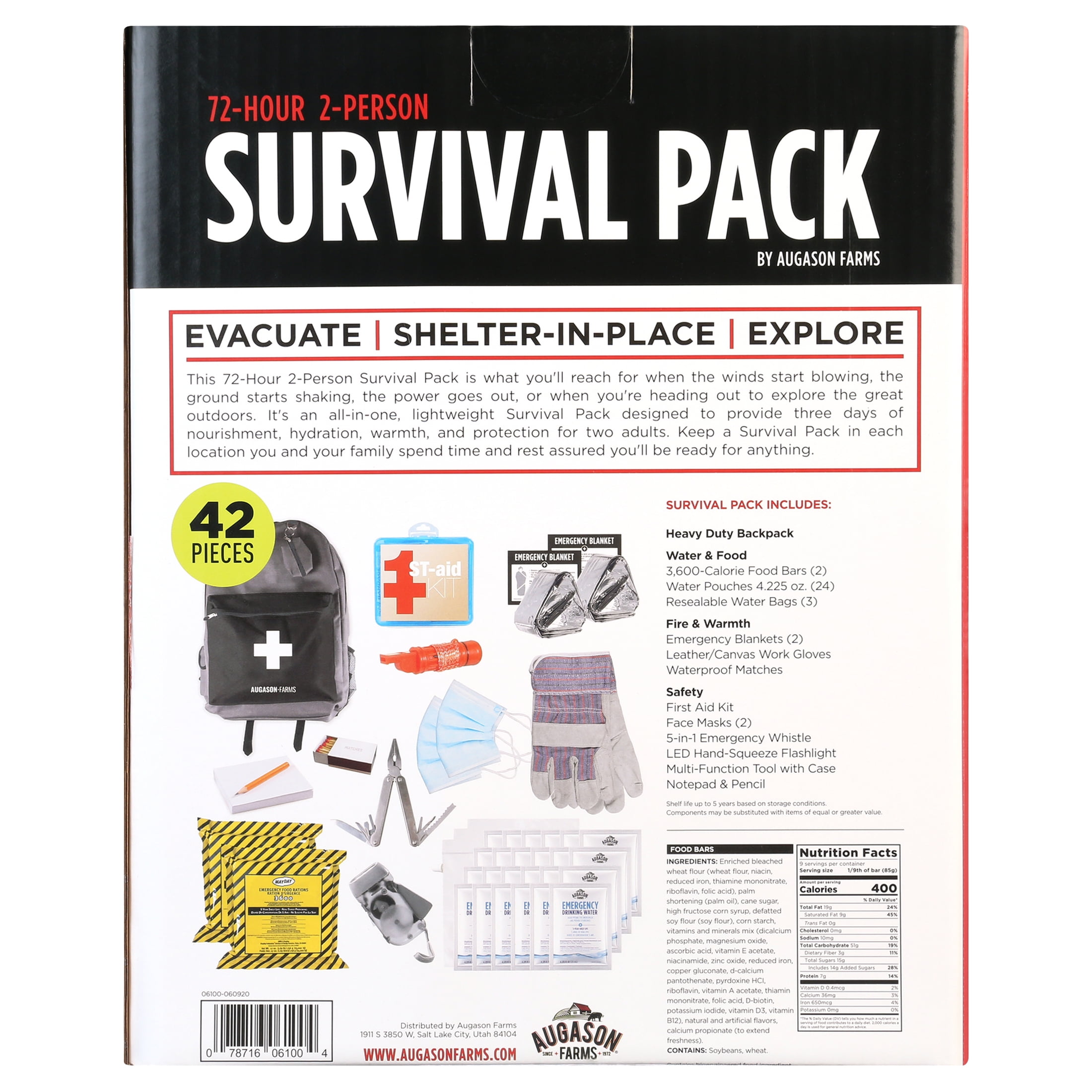 1,200 calories per person, per day 21g protein per person, per day Gear for warmth and safety Shelf life up to 5 years (based on individual storage conditions) Gear for warmth and safety Ready Tips printed on the Survival Pack box, plus additional preparedness tips and tools are available at augasonfarms.com/beReady Lightweight pack weighs under 15 pounds