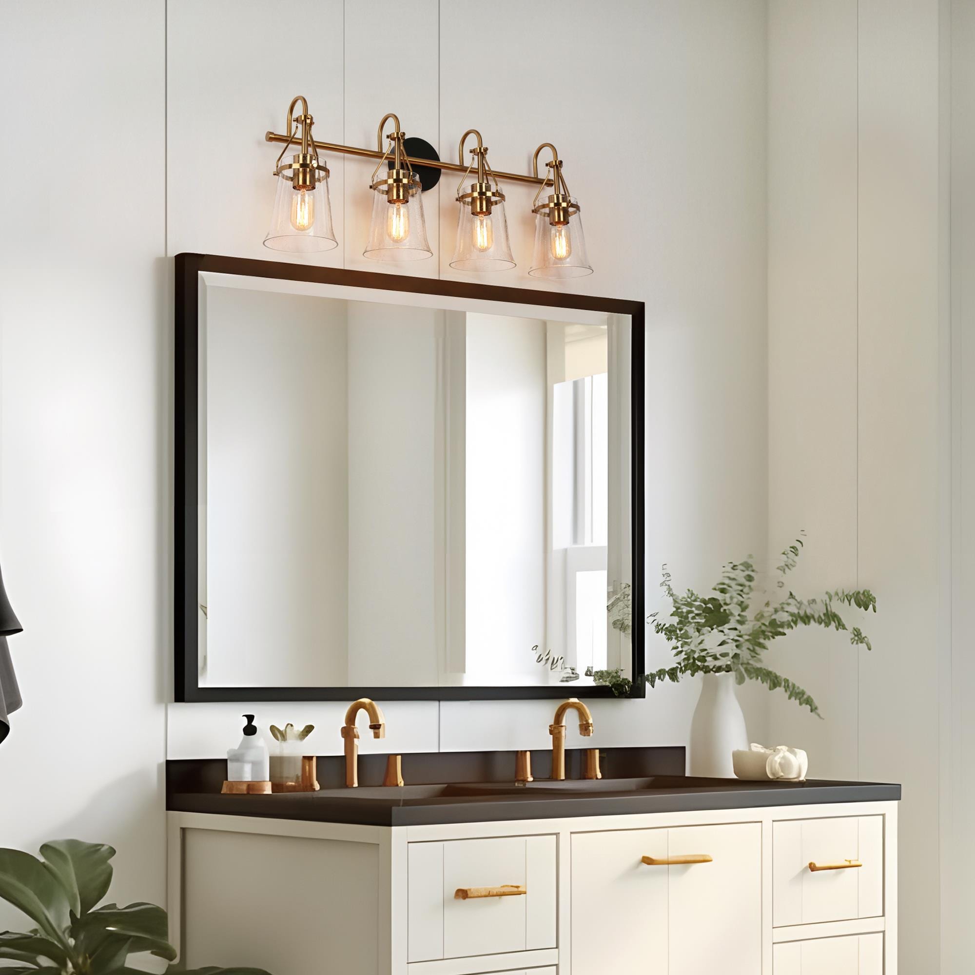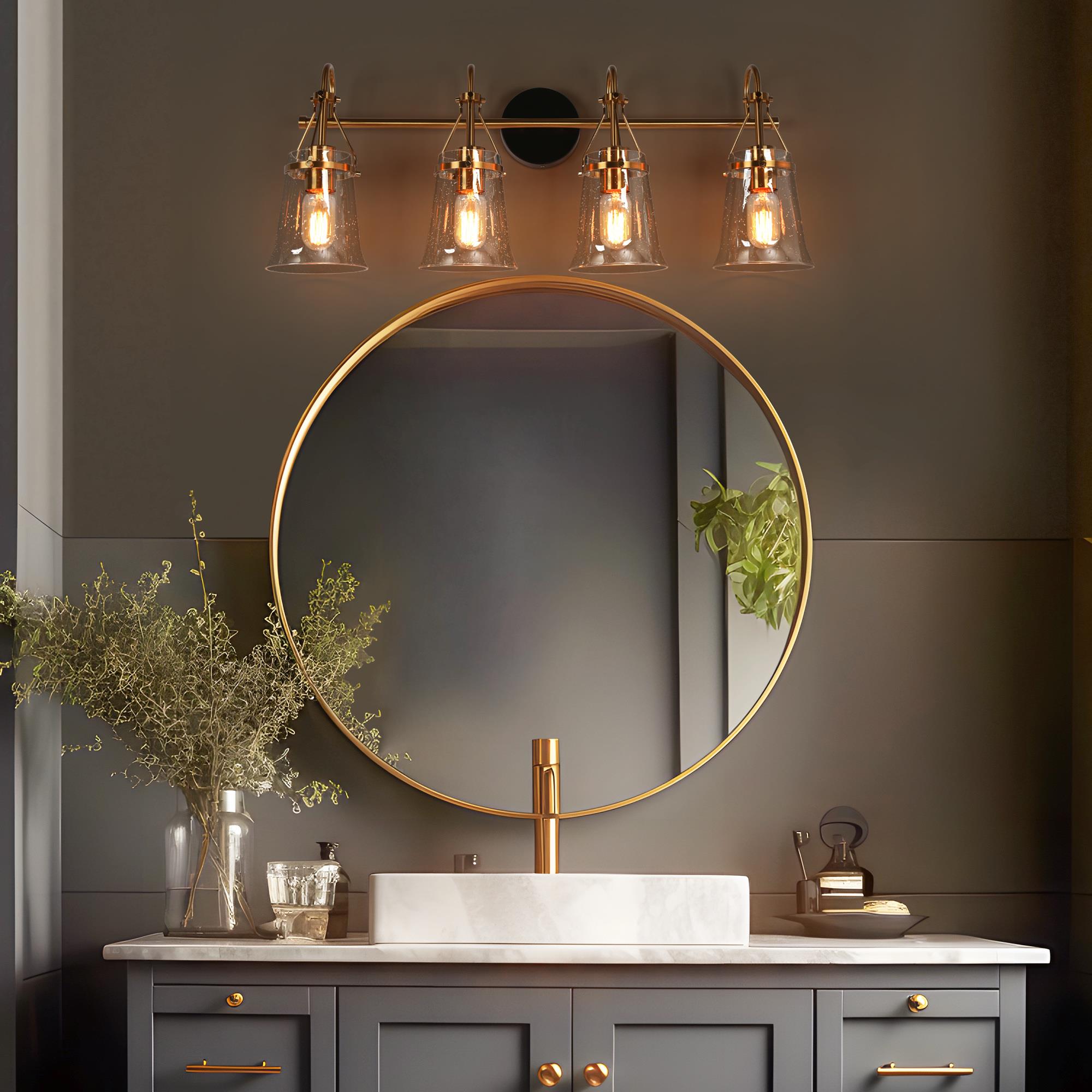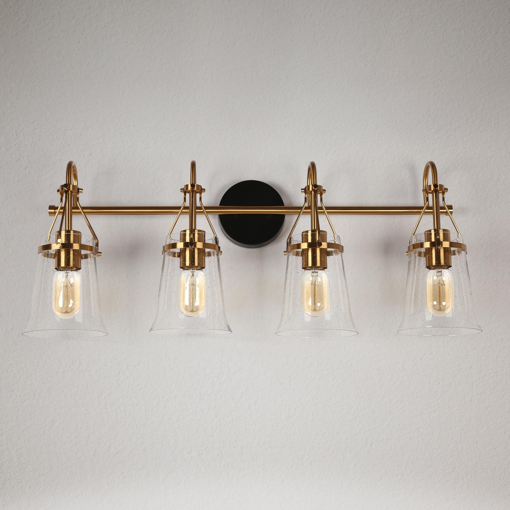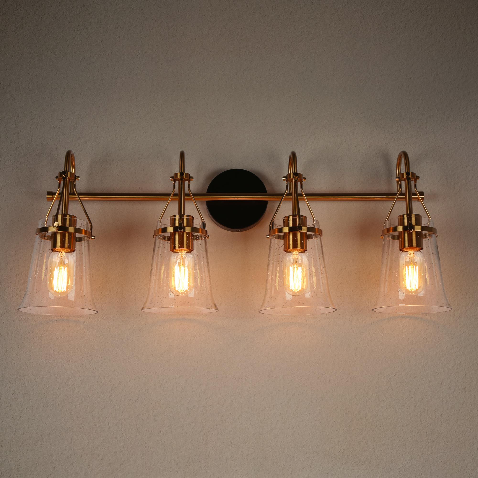 Upgrade your bathroom with our LNC Auisre collection Polished Brass Modern 4-light Bathroom Vanity Light. With its stylish combination of matte black and polished electroplated gold brass finishes, this vanity light bar adds a touch of contemporary elegance to your space. The four bell-shaped clear seeded glass shades mounted on a tapered bar create a visually striking design. For maximum energy efficiency and a soft, warm glow, we recommend using LED light bulbs. Illuminate your entire bathroom with this stunning and functional vanity light, and elevate your home decor to a new level of style and sophistication. Shop now and transform your bathroom into a modern oasis!