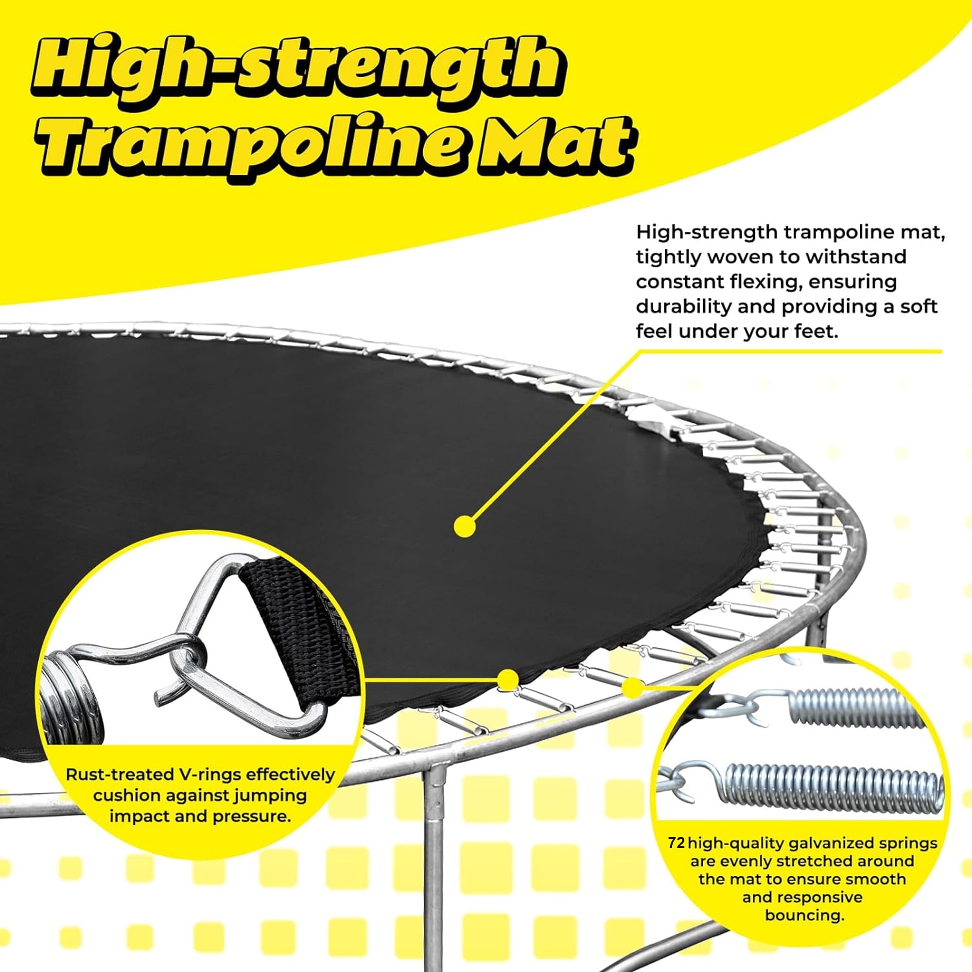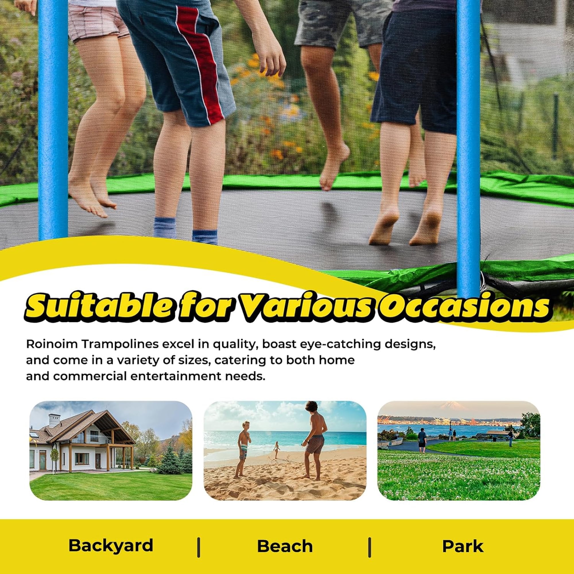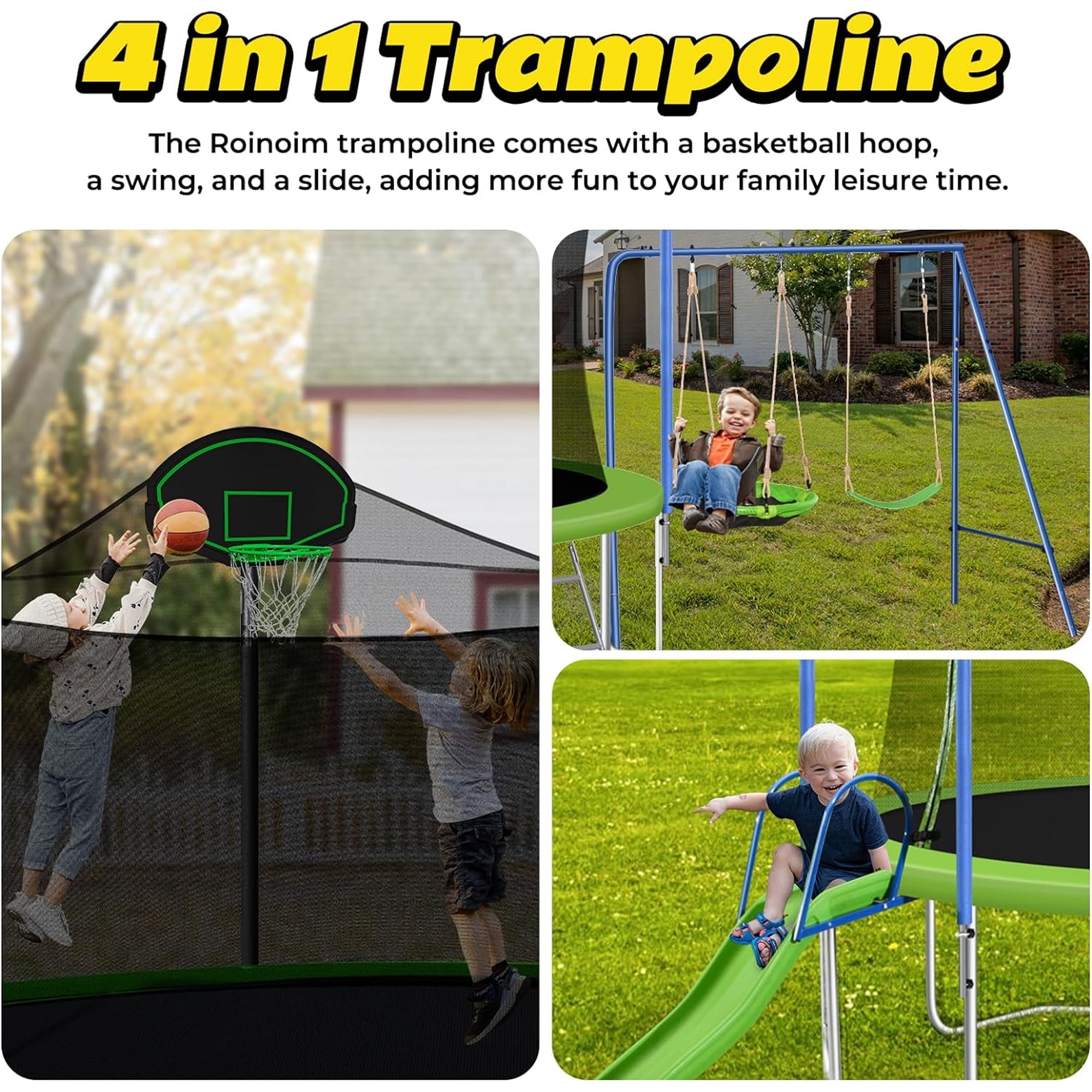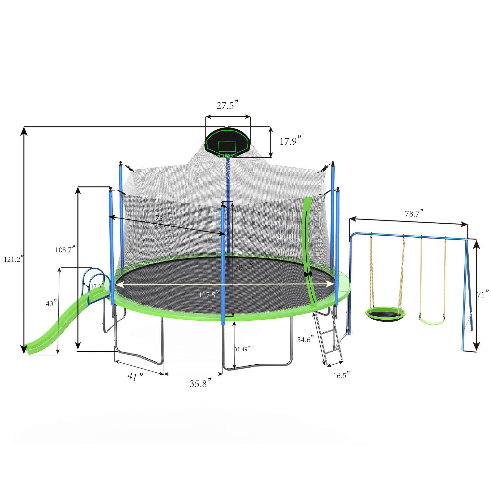 Features 3 IN 1 TRAMPOLINE – This 12FT trampoline with enclosures for kids adults is uniquely designed with 2 swings, a slide and basketball hoop. Game changer for kids to have multiple entertainment with this special trampoline. PREMIUM BOUNCING EXPERIENCE – Aukfa outdoor backyard trampoline with slide provides a high-quality bounce thanks to the 72 galvanized springs evenly distributed around the mat, paired with a high-strength mat that can handle constant flexing. This design offers both durability and a gentle landing for your feet. DURABLE AND STABLE CONSTRUCTION – The trampoline’s heavy gauge galvanized steel frame forms 6 W-shaped legs, providing a stable base for the jumping zone. The joins are press-fitted onto each frame piece to reduce noise and movement, enhancing the product’s longevity and reducing wear and tear. TRAMPOLINES WITH BASKETBALL HOOP – Jumping becomes even more entertaining with an included basketball hoop, keeping your kids busy and active all day long. There is a triangle net around the backboard to keep the ball from flying off the trampoline. With our trampoline, it’s not just about jumping—it’s also about scoring! ASSEMBLE EASILY – All accessories included. We recommend two or more people for assembly, please read the user manual carefully, we provide clear assembly sequences to make the process easier and reduce construction time. Please feel free to contact our customer service if you have any questions. Specifications Type: Backyard; Above Ground; Kids/Adults Trampoline with Slide and Swing Frame Material: Heavy Gauge Galvanized Steel, Plastic Frame Size: 12 Feet Number of Packages: 2 Jump Surface Material: PVC; Mesh Number of Entrances: 1 Zipper Closure: YES Number of Legs: 6 Springs Count: 72 pcs Slide: Yes Basketball Hoop: Yes Safety Net Enclosure Fasten Location: Outer Enclosure Padded Safety Poles: YES Anchor Kit Included: YES Safety Pad Included: YES Pad Material: Foam User Manual: AK_AK-SR01M15012-G0_PUM_VY-031224