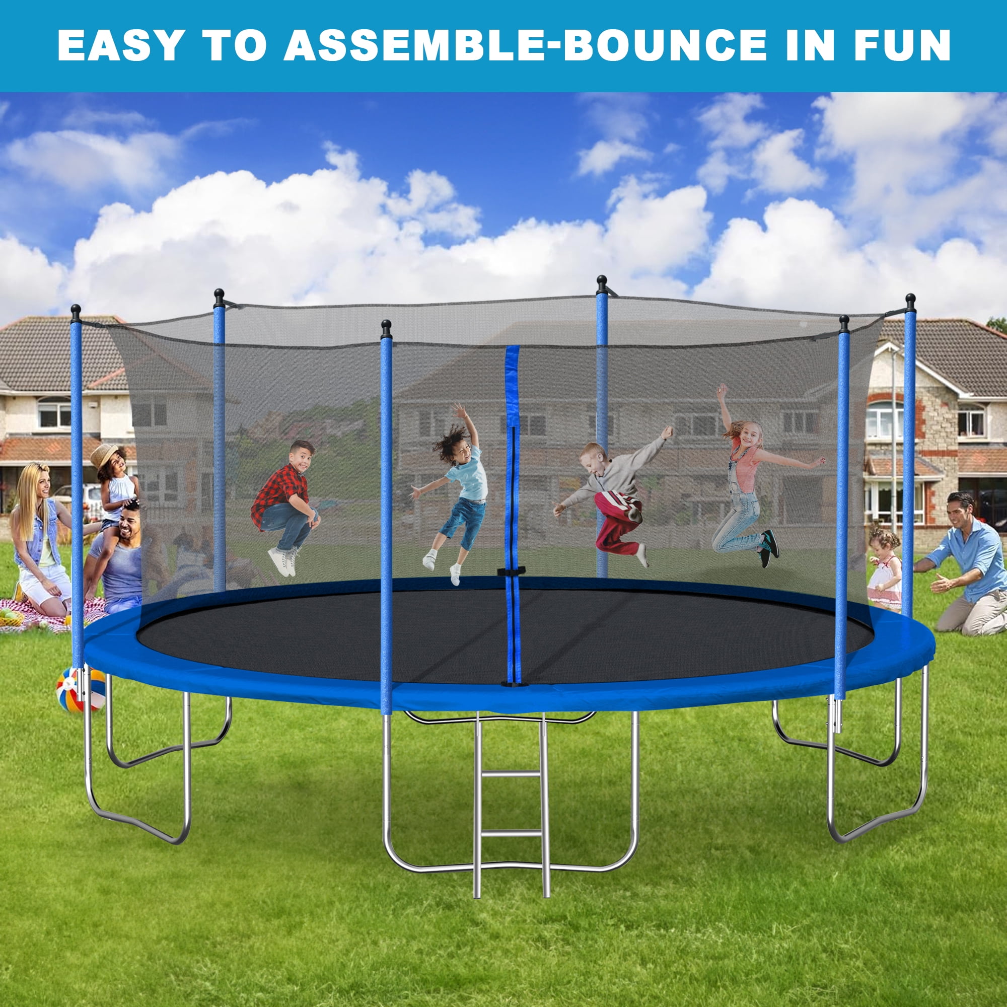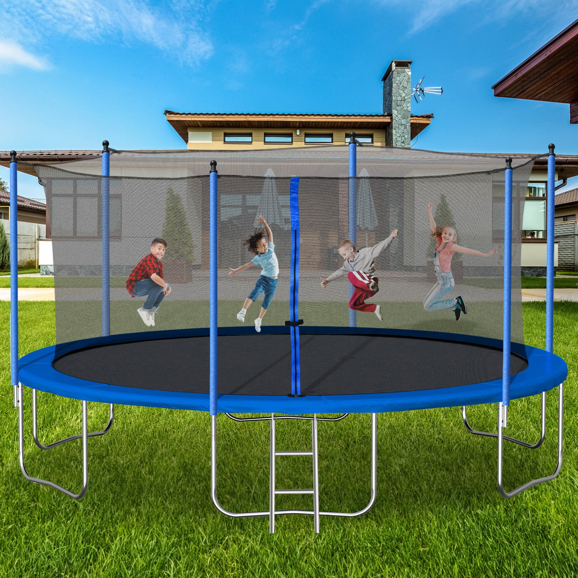 Aukfa 14FT Trampoline with Safety Enclosure Net for Kids Adults, Outdoor Trampoline with Ladder for Backyard, Blue