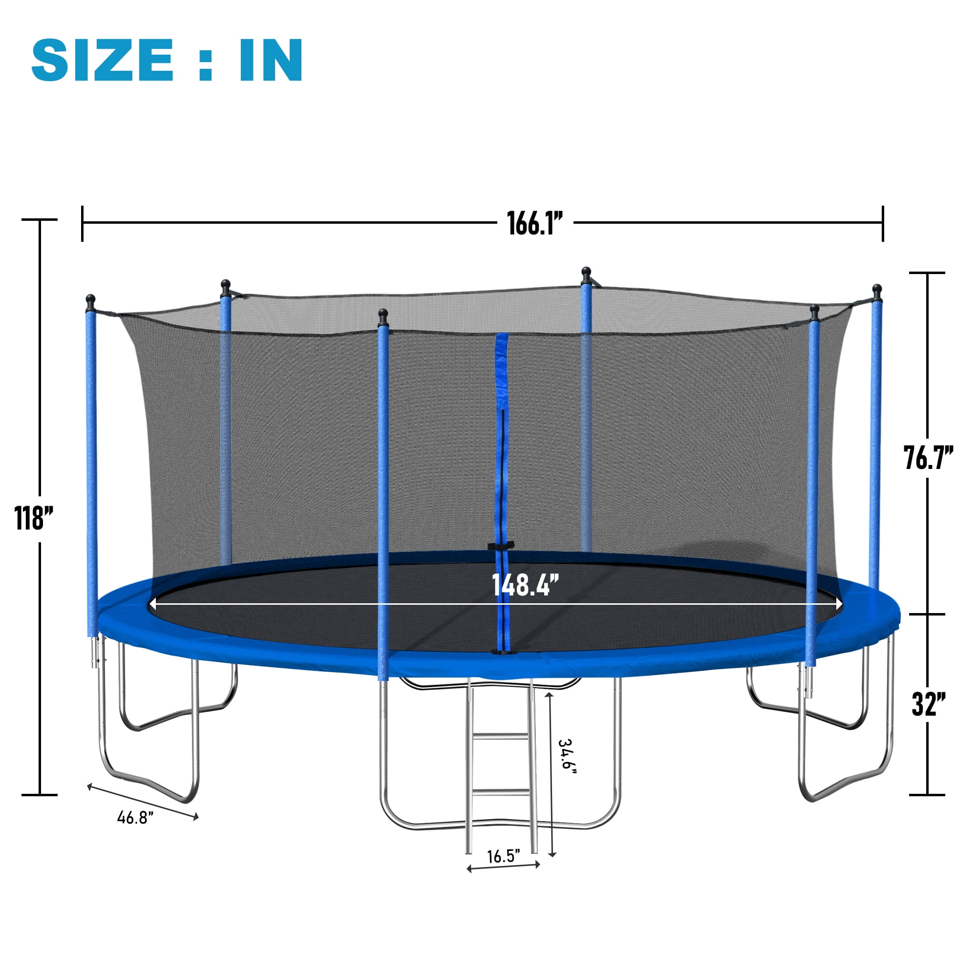 Features 360-DEGREE SAFELY SYSTEM – This 14FT trampoline with enclosures for kids adults features a comprehensive safety net securely attached to the jumping mat all around, reducing the risk of an arm or leg falling through. Full enclosure with a zipper door surely lends you peace in mind, the rust-resistant steel 3-step ladder helps you get onto your trampoline quickly and safely. PREMIUM BOUNCING EXPERIENCE – Aukfa outdoor trampoline provides a high-quality bounce thanks to the 72 galvanized springs evenly distributed around the mat, paired with a high-strength mat that can handle constant flexing. This design offers both durability and a gentle landing for your feet. DURABLE AND STABLE CONSTRUCTION – The trampoline’s heavy gauge galvanized steel frame forms 6 W-shaped legs, providing a stable base for the jumping zone. The joins are press-fitted onto each frame piece to reduce noise and movement, enhancing the product’s longevity and reducing wear and tear. SAFETY PROTECTION – The backyard trampoline design increases the length of the zipper, making it easier for users to enter and exit, increasing the number of buckles for the zipper, and increasing the user’s safety factor during use. The foam sleeve ensures that the child will hit the frame Will not be injured. ASSEMBLE EASILY – All accessories included. We recommend two or more people for assembly, please read the user manual carefully, we provide clear assembly sequences to make the process easier and reduce construction time. Please feel free to contact our customer service if you have any questions. Weight & Dimensions Assembled: 166.1″L x 166.1″W x 108.3″H Overall Product Weight: 106.16 LBS Frame Size: 14 Feet Number of Packages: 1 Specifications Type: Backyard; Above Ground; Kids/Adults Trampoline Frame Material: Heavy Gauge Galvanized Steel Jump Surface Material: PVC; Mesh Ladder Included: YES Safety Net Enclosure: YES Number of Entrances: 1 Zipper Closure: YES Number of Legs: 6 Springless Trampoline: No Springs Count: 72 pcs Basketball Hoop: No Safety Net Enclosure Fasten Location: Outer Enclosure Padded Safety Poles: YES Weather Cover Included: No Anchor Kit Included: YES Storage Bag Included: No Safety Pad Included: YES Pad Material: Foam Handlebar Included: No Overall Shape: Round Age Group: 3 to 4 Years; 5 to 6 Years; 7 to 8 Years; 9 to 10 Years; 11 to 12 Years; 13+ Years Foldable: No Detachable Legs: No Warranty Length: 1 Year User Manual: AK_AK-SR01M15013-B0_PUM_VY-031224