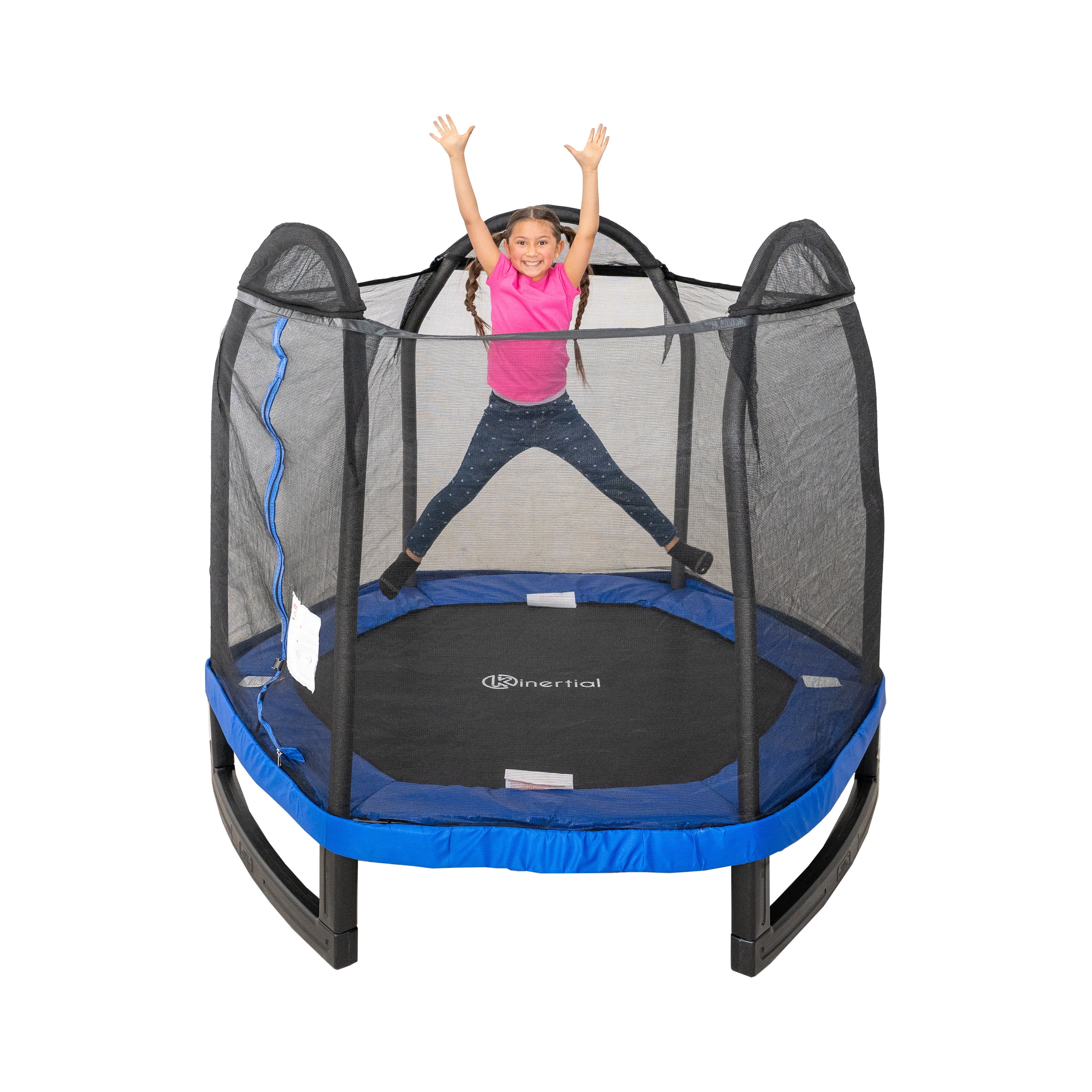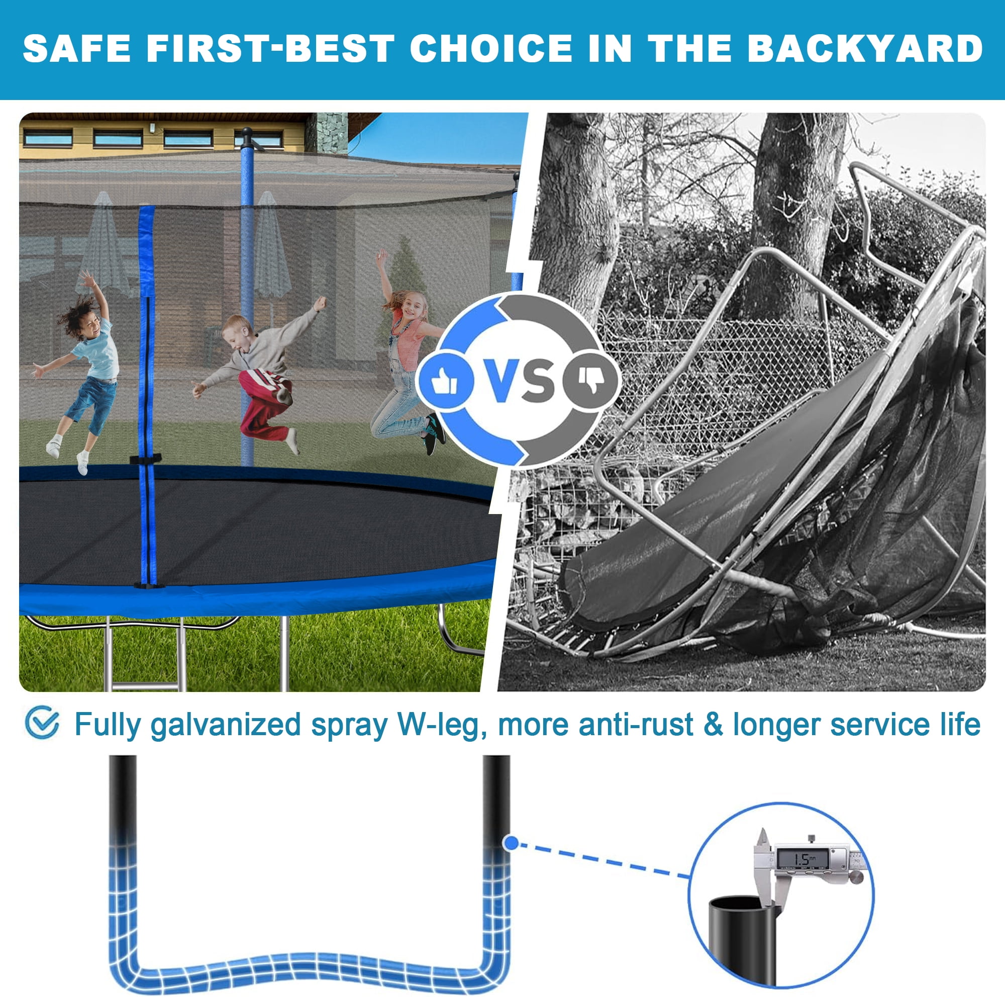 The Aukfa AK-ST01-007 14FT trampoline with enclosures offers an exceptional level of safety with its Safe Seal System. This recreational outdoor trampoline boasts a high-strength mat woven together to withstand constant flexing. Its durable construction ensures a comfortable surface for jumping. With 72 galvanized springs evenly stretched around the mat, users can enjoy a smooth and highly responsive bounce, enhancing the overall bouncing experience. This 14FT above ground trampoline made of heavy gauge galvanized steel frame and 6 W-shaped legs provide a stable base for the jumping zone. The press-fitted joins between frame pieces minimize frame noise and movement, reducing wear and tear and ensuring long-lasting durability. The full enclosure features a zipper door for effortless entry and added peace of mind.