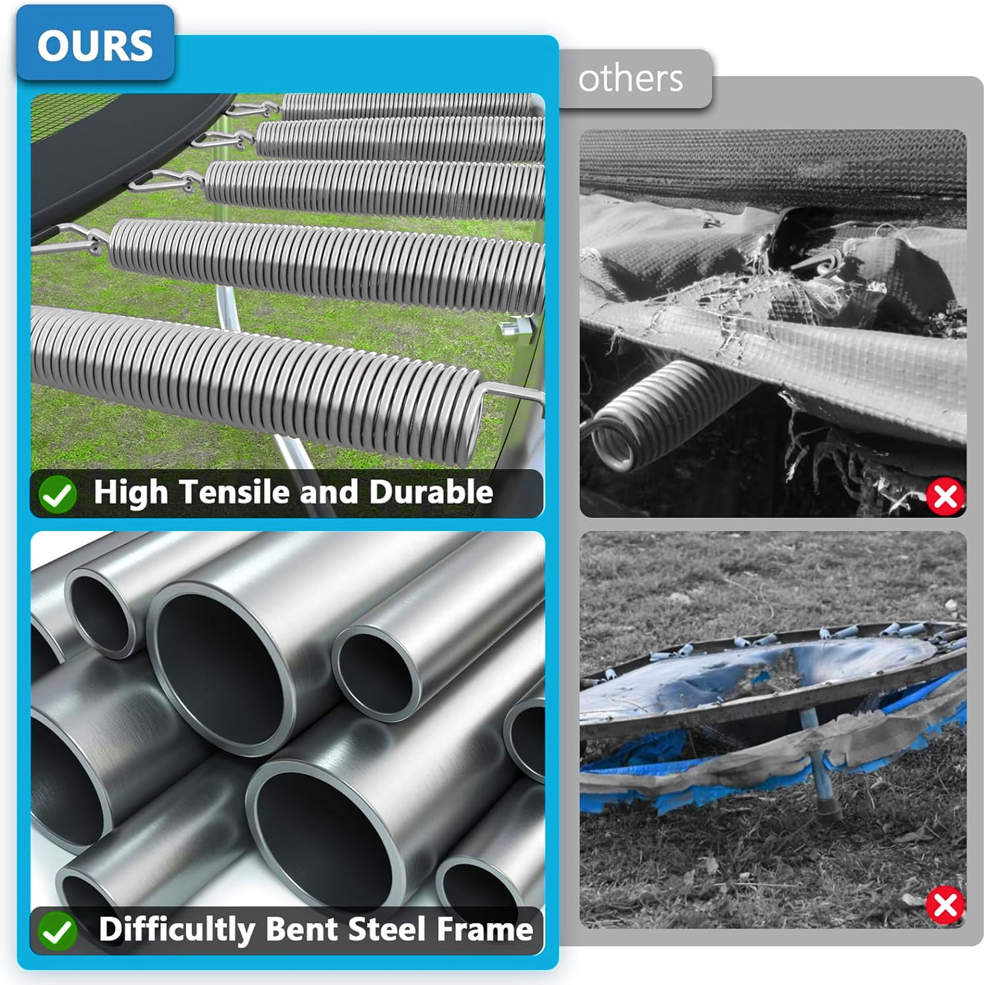 The Aukfa AK-ST01-006 16FT trampoline with enclosures offers an exceptional level of safety with its Safely System. The 360-degree safety net, securely attached to the jumping mat, effectively reduces the risk of limbs falling through, making it an ideal choice for kids, adults. Additionally, it features a backboard, allowing you to play basketball on it. For an unparalleled bouncing experience, this outdoor trampoline boasts a high-strength mat woven together to withstand constant flexing. Its durable construction ensures a comfortable surface for jumping. There are 180 galvanized springs evenly stretched around the mat. This provides users with a smooth and highly responsive bounce, enhancing the overall bouncing experience. The heavy gauge galvanized steel frame and 6 W-shaped legs provide a stable base for the jumping zone. It comes equipped with a rust-resistant steel 2-step ladder, allowing users to easily and safely access the trampoline. The full enclosure features a zipper door for effortless entry and added peace of mind.