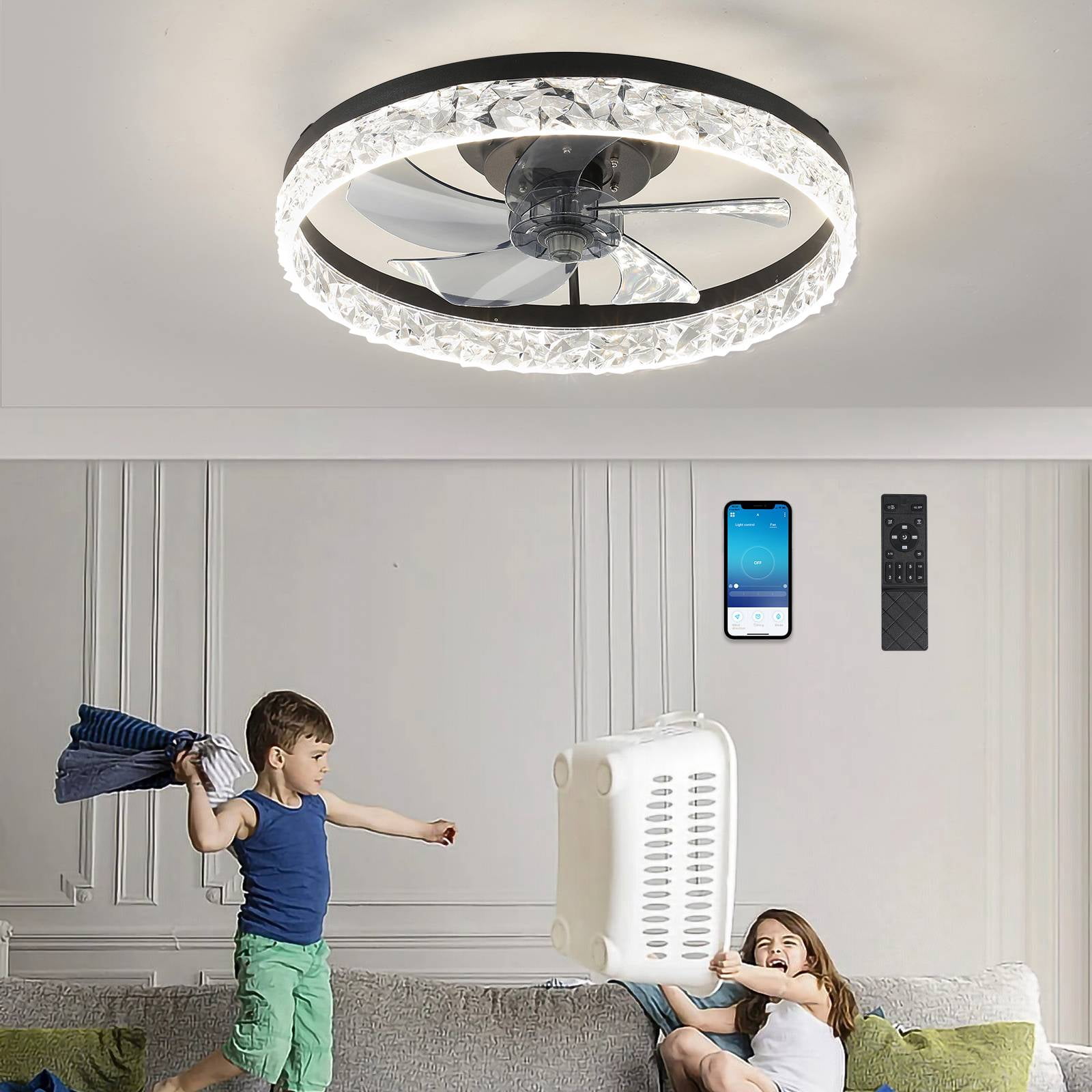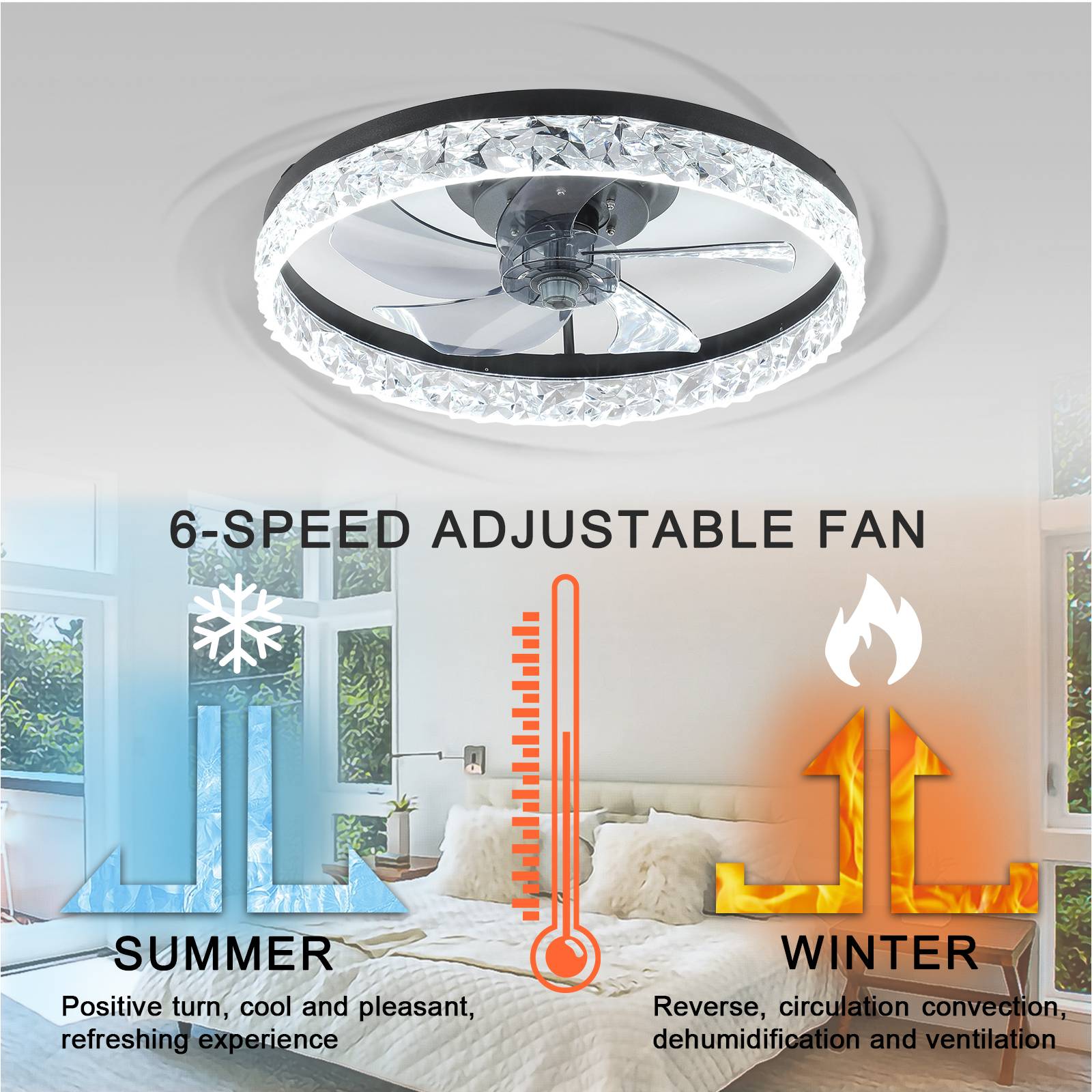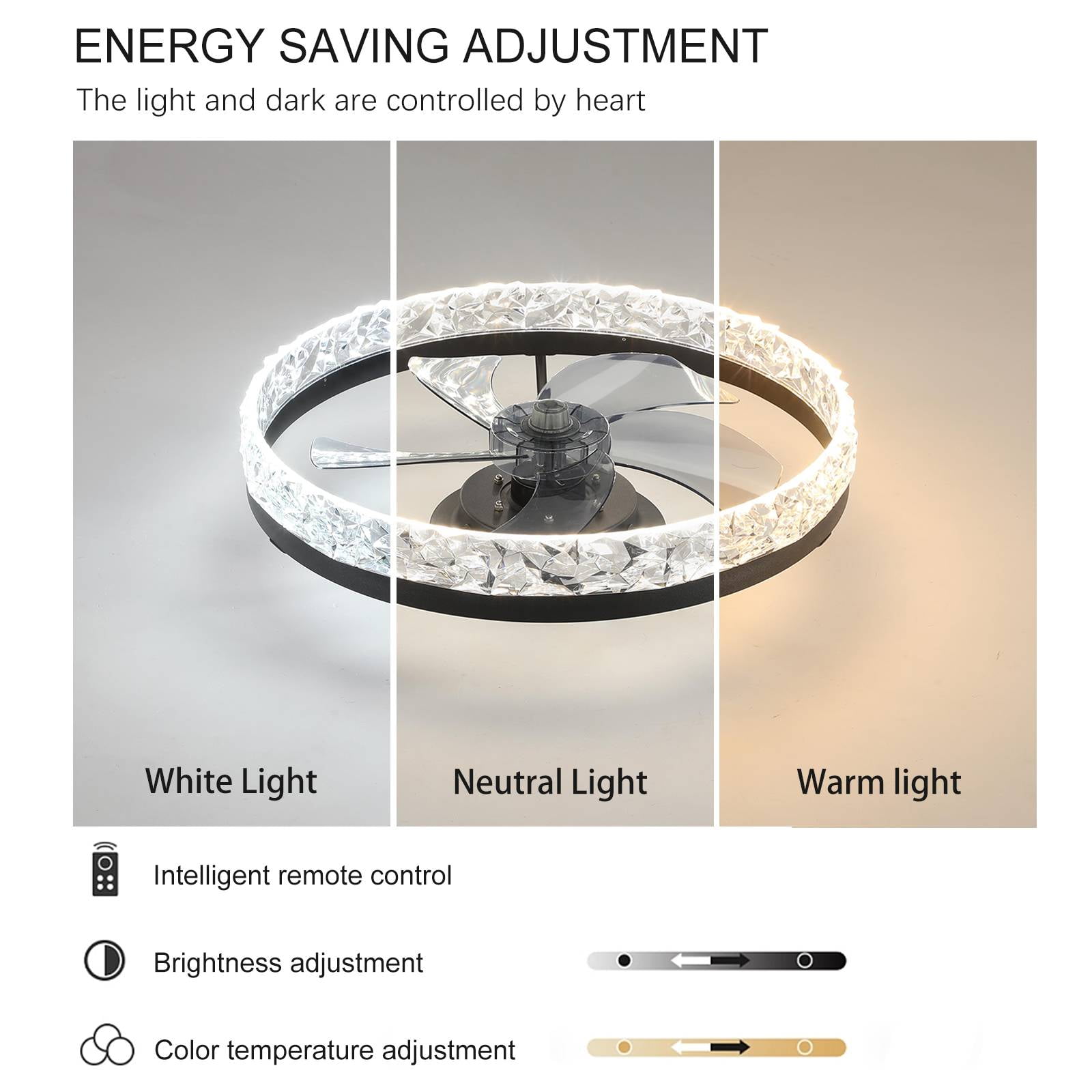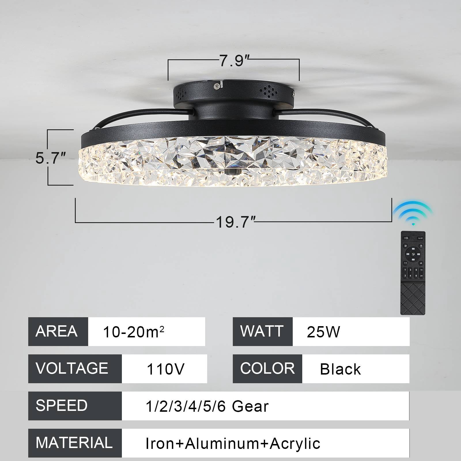 FEATURES: Adjustable Lighting: This flush-mount ceiling fan is equipped with adjustable LED lighting, allowing the brightness to vary from bright to dim, and the color to switch between warm yellow and pure white. It is operated through a remote control, and all settings are automatically saved when the light is turned off, making it ideal for mood-setting and energy-saving. Multi-Functional Speeds and Timer: Equipped with multiple speed options, this enclosed flush-mount ceiling fan has 6 wind speeds to meet different needs and includes a timer function (2 hours). It is suitable for use at specific times to avoid wasting electricity and adds convenience to users. Reversible Motor for All Seasons: The fan features an efficient DC motor and is equipped with 5 blades, ensuring smooth operation with no noise, which will not disturb sleep. The reversible motor design makes it suitable for all seasons, as it can change direction during winter to assist in circulating warm air indoors. Easy to Clean and Maintain: This fan’s unique enclosed design and invisible blades effectively guide air to every corner of the room, facilitating better air circulation. Moreover, this design makes cleaning and maintenance extremely simple and quick. Wide Applications: This ceiling fan with lights is especially suitable for places with limited space. If your living space is not large, then this fan with lights will be a perfect fit for you. It can be widely used in kitchens, bedrooms, living rooms, offices, children’s rooms, and many other settings, being both practical and stylish. PRODUCT INFORMATION Product Size: 19.70 x 19.70x 5.70 inch Product Weight: 5.20lb Product Package Size: 20.90 x 20.90 x 6.90 inch Product Package Weight: 8.10lb SPECIFICATION Fan Type: Bladeless Canopy: Yes Compatible Room Size: Small rooms (up to 8 X 10); Medium rooms (up to 12X14) Fan Body Finish: White Fan Body Material: ABS Light Kit Included: Yes Blades Included: Yes Blade Finish: White Blade Pitch: 10 degrees Blade Material: Plastic Number of Blades Accommodated: 5 Dry, Damp, or Wet Location Listed: Dry What is Dry, Damp, or Wet Location Listed?: This indicates whether the fixture is safe to use in dry locations, damp locations (moist environments), or wet locations (direct exposure to water). Compatible Fan Control: Remote Shade Included: Yes Shade Finish: White Shade Material: Acrylic Number of Speeds: 6 DC Motor: Yes Reversible Motor: Yes Maximum RPM: Low-Speed Airflow: 890CFM Maximum Airflow: 1260CFM Airflow Efficiency: 33 Low Noise: Yes Plug-In: No Fan Motor Wattage: 38 Watt Compatible Ceiling Fan Parts: Light Kit; Light Bulb; Remote Control Light Kit Type: Integrated Number of Lights: 1 Dimmable: Yes Integrated LED: Yes Integrated LED Color Temperature: 6500K Integrated LED Brightness (Lumens): 3500lm integrated LED Wattage: 59 Watt Integrated LED Rated Lifespan: 20000 hours Integrated LED Color Rendering Index (CRI): 85 What is Integrated LED?: This indicates that an LED light is built into the fixture. Integrated LED lights are more energy-efficient and can last up to 50,000 hours. They cannot be replaced by the customer. Smart Enabled: Yes Control Systems: Mobile App; Remote Control Smart Lighting Functions: Timer; Soft Light Start; Dimmable; Tunable White Maximum Wattage (Per Bulb): 58 Watt Independent Light: Yes Downlight: Yes Supplier Intended and Approved Use: Residential Use Voltage: 110 Volt Fan Control Parts Included: Remote Control Removable Blades: Yes Adjustable Length: No Product Care: Wipe Clean With a Dry Cloth Package Information 1 X Ceiling Fan 1x User Manual: AK_AK-HLC1M09002-K0_PUM_VY-071023
