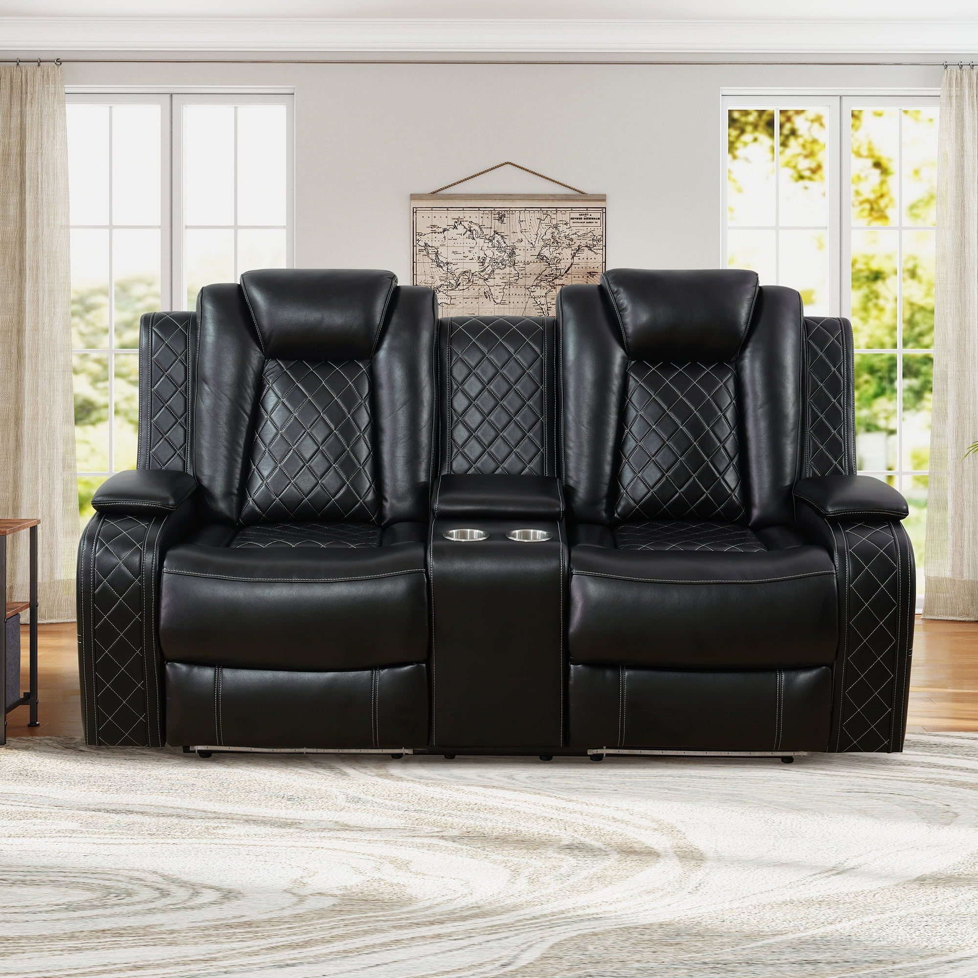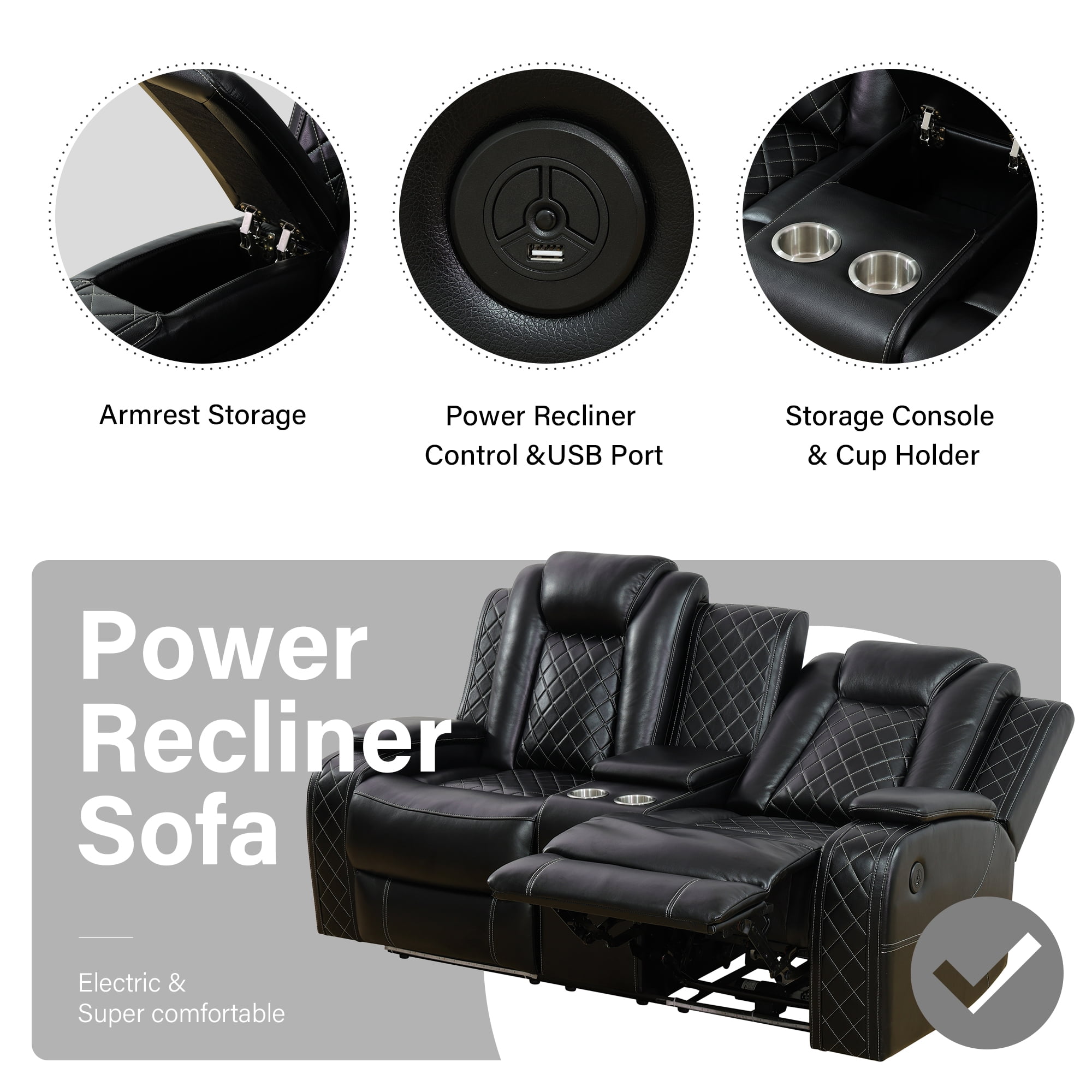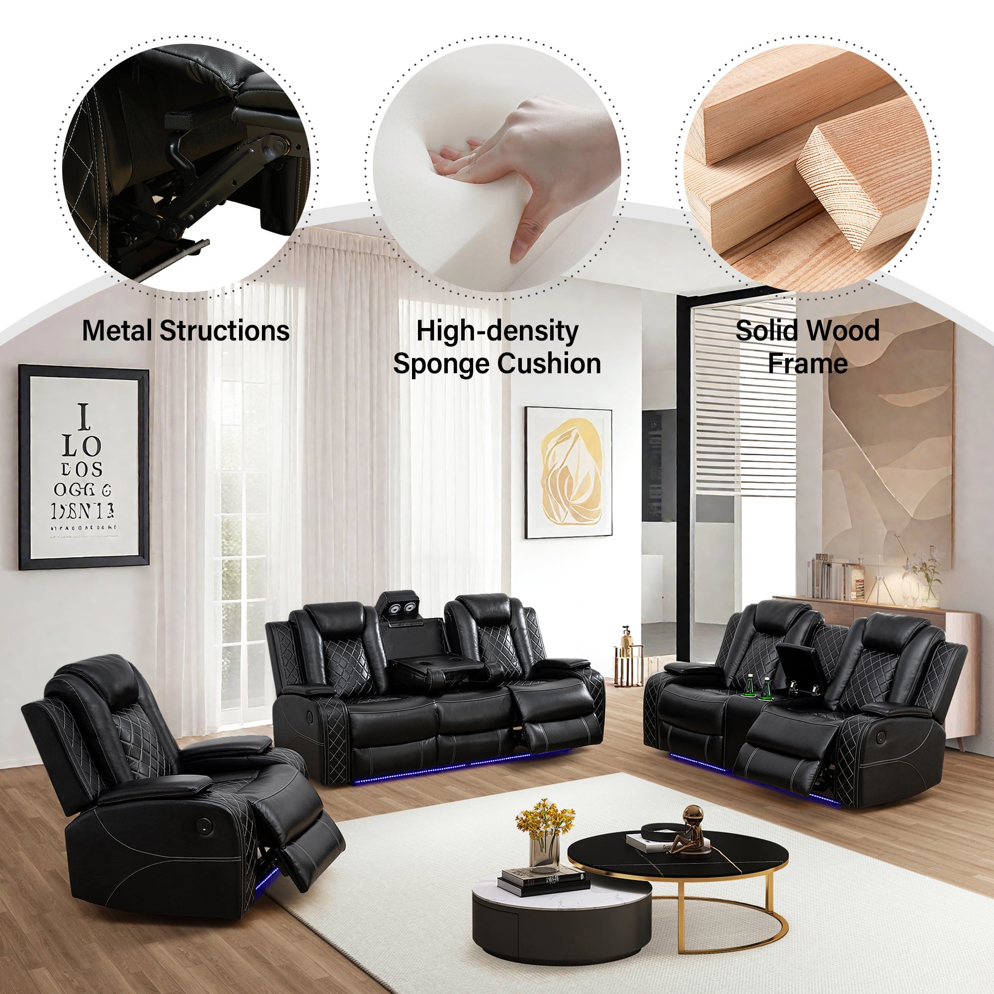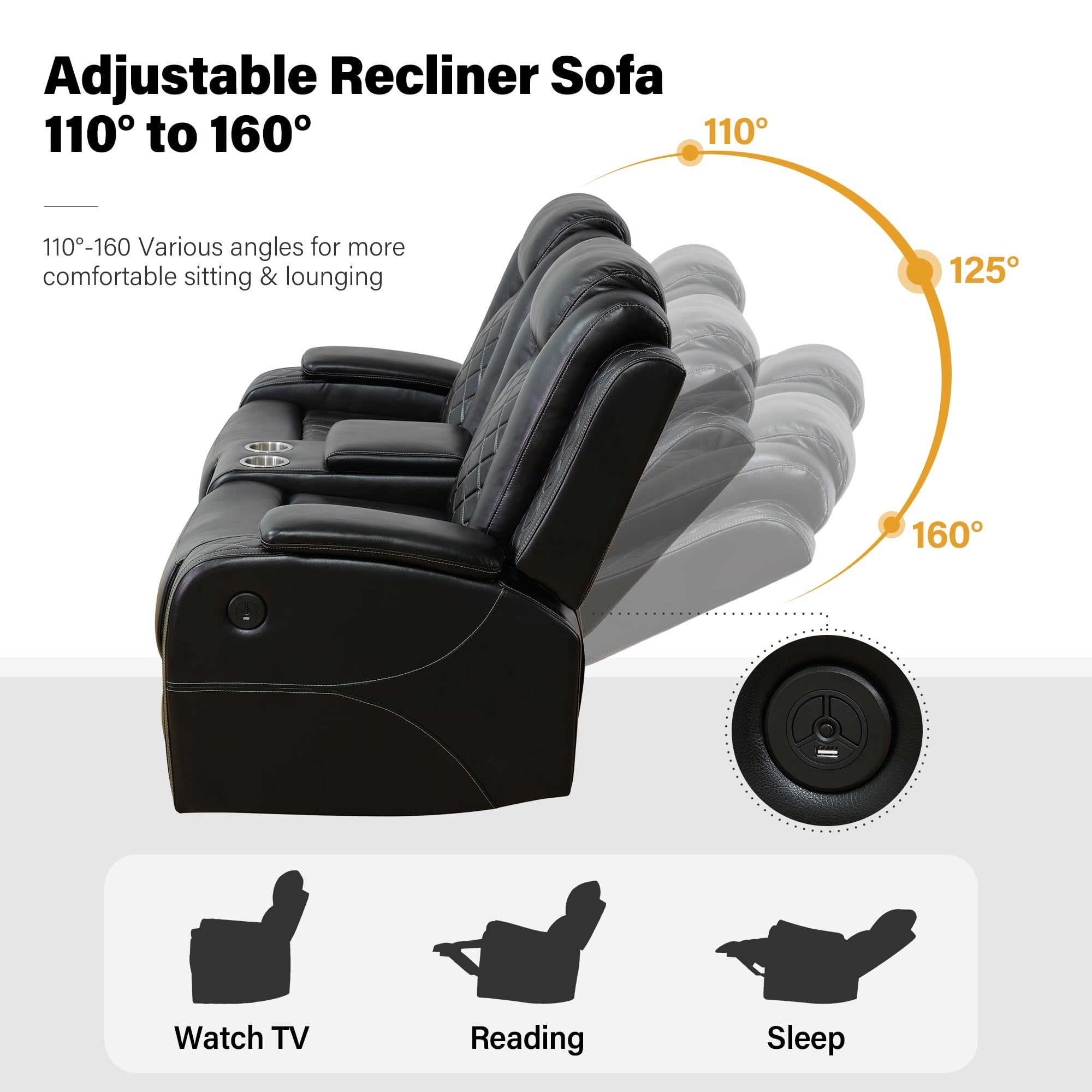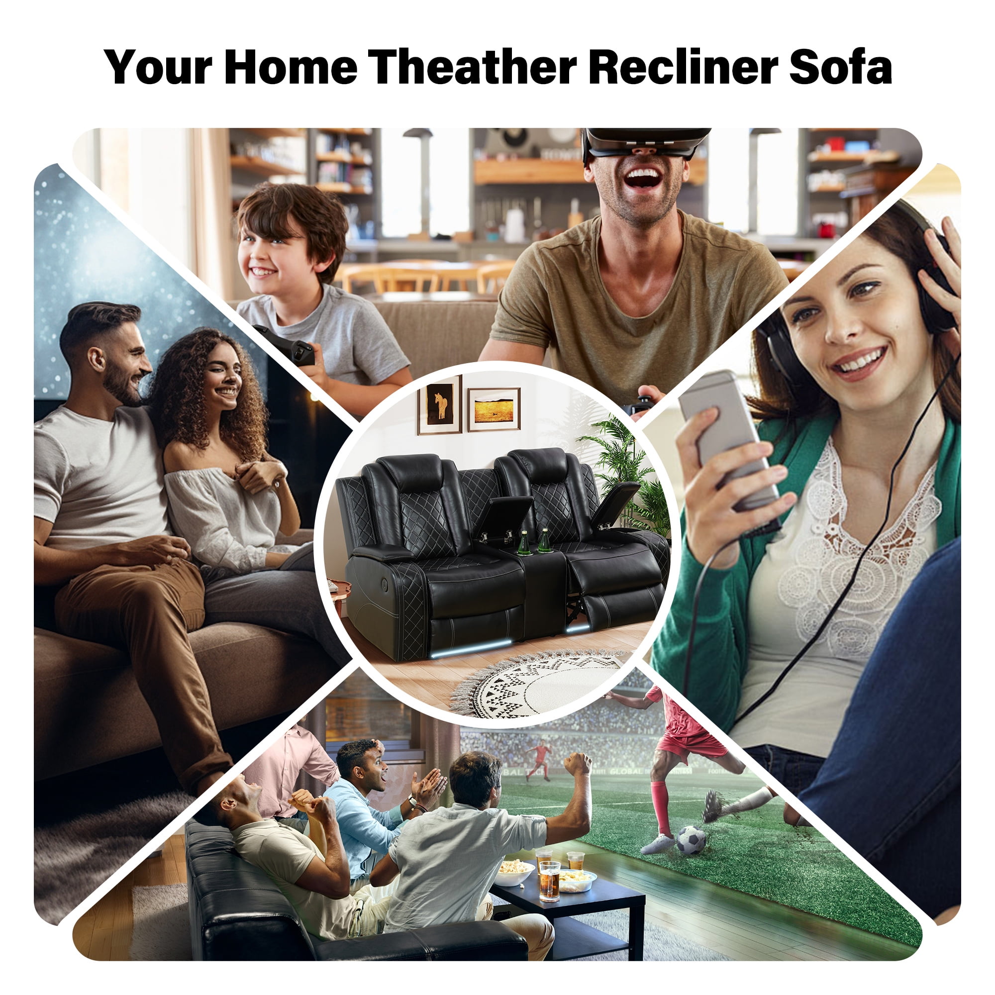 Comfortable & Durable: Experience lasting comfort with the Aukfa recliner sofa’s breathable faux leather upholstery, designed for effortless cleaning. High-density foam seats and plush cotton-filled backs provide cloud-like support, while the solid wood frame ensures years of sturdy reliability. A perfect balance of softness and resilience for daily use. p>Convenient Design: Stay organized with hidden storage compartments and dual USB ports for on-the-go charging. The loveseat’s center console includes cup holders and a storage bin, while the 3-seater recliner features a flip-over table for snacks or work essentials – smart solutions that adapt to your lifestyle. Ergonomic Adjustable Recliner: Customize your comfort with a manually adjustable backrest (115°-160°) and 66″ extended leg rest. The ergonomic design supports natural posture whether sitting upright for work or reclining fully to unwind, offering targeted relief for tired muscles. Wireless Charging & Reading Light: (Triple recliner Only) Charge devices wirelessly without cable clutter. The integrated reading light provides gentle illumination for books or tablets, creating a cozy ambiance for nighttime relaxation. Home Theater Recline: Elevate movie nights with ambient LED floor lighting. One-touch buttons adjust the cinematic glow to match your mood, while plush reclining seats immerse you in every scene. Your living room, transformed into a personal theater.