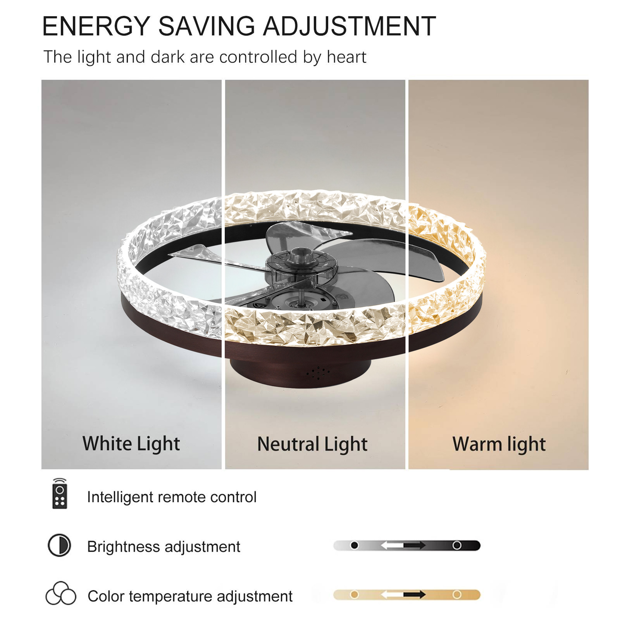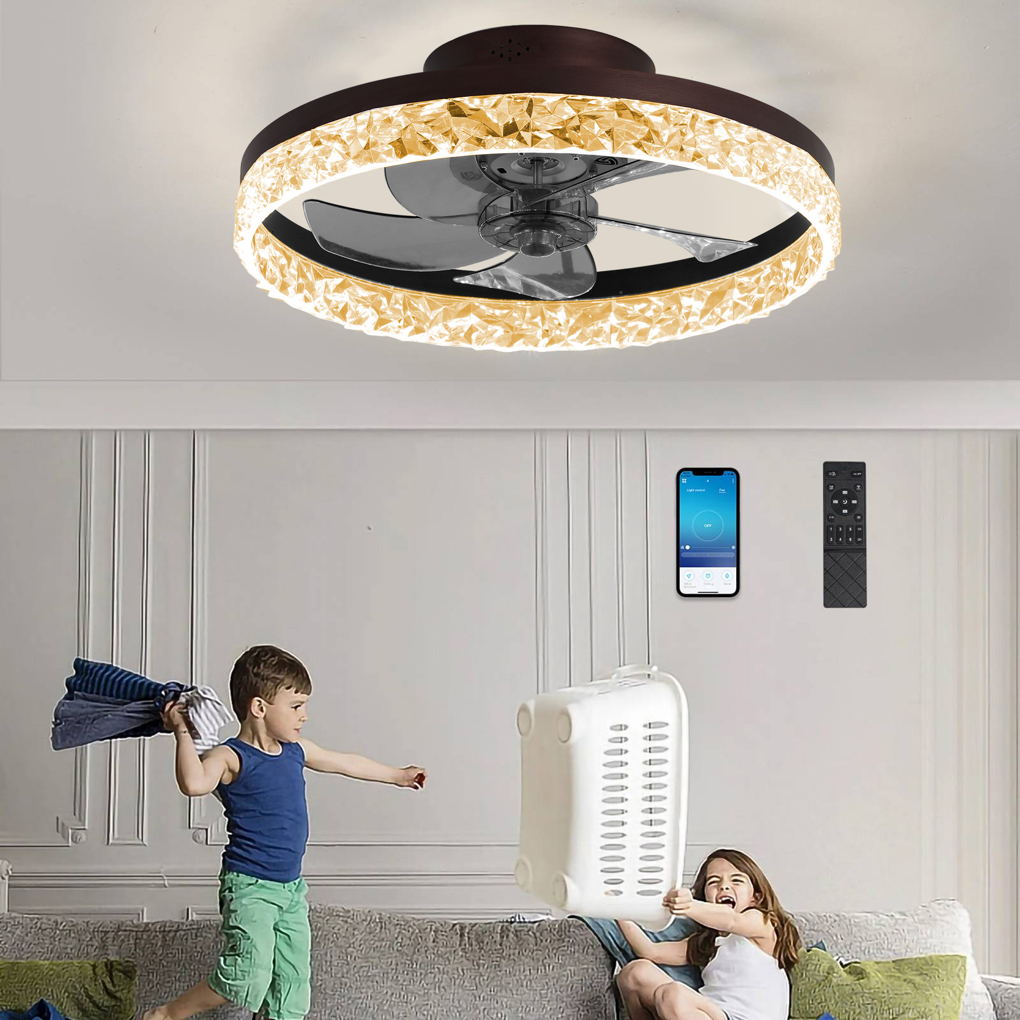 FEATURES Adjustable Lighting- This flush-mount ceiling fan is equipped with adjustable LED lighting, allowing the brightness to vary from bright to dim, and the color to switch between warm yellow and pure white. It is operated through a remote control, and all settings are automatically saved when the light is turned off, making it ideal for mood-setting and energy-saving. Multi-Functional Speeds and Timer – Equipped with multiple speed options, this enclosed flush-mount ceiling fan has 6 wind speeds to meet different needs and includes a timer function (2 hours). It is suitable for use at specific times to avoid wasting electricity and adds convenience to users. Reversible Motor for All Seasons – The fan features an efficient DC motor and is equipped with 5 blades, ensuring smooth operation with no noise, which will not disturb sleep. The reversible motor design makes it suitable for all seasons, as it can change direction during winter to assist in circulating warm air indoors. Easy to Clean and Maintain – This fan’s unique enclosed design and invisible blades effectively guide air to every corner of the room, facilitating better air circulation. Moreover, this design makes cleaning and maintenance extremely simple and quick. Wide Applications – This ceiling fan with lights is especially suitable for places with limited space. If your living space is not large, then this fan with lights will be a perfect fit for you. It can be widely used in kitchens, bedrooms, living rooms, offices, children’s rooms, and many other settings, being both practical and stylish. PRODUCT INFORMATION Product Size: 19.70 x 19.70x 5.70 inch Product Weight: 5.20lb SPECIFICATION Fan Type: Bladeless Canopy: Yes Fan Body Material: ABS Light Kit Included: Yes Blades Included: Yes Blade Pitch: 10 degrees Blade Material: Plastic Number of Blades Accommodated: 5 Compatible Fan Control: Remote Shade Material: Acrylic Number of Speeds: 6 DC Motor: Yes Reversible Motor: Yes Maximum RPM: 1253 Low-Speed Airflow: 890CFM Maximum Airflow: 1260CFM Airflow Efficiency: 33 Low Noise: Yes Plug-In: No Fan Motor Wattage: 38 Watt Compatible Ceiling Fan Parts: Light Kit; Light Bulb; Remote Control Light Kit Type: Integrated Dimmable: Yes Integrated LED: Yes Integrated LED Color Temperature: 6500K Integrated LED Brightness (Lumens): 3500lm integrated LED Wattage: 59 Watt Integrated LED Rated Lifespan: 20000 hours Integrated LED Color Rendering Index (CRI): 85 Smart Enabled: Yes Control Systems: Mobile App; Remote Control Smart Lighting Functions: Timer; Soft Light Start; Dimmable; Tunable White Maximum Wattage (Per Bulb): 58 Watt Independent Light: Yes Downlight: Yes Supplier Intended and Approved Use: Residential Use Voltage: 110 Volt Fan Control Parts Included: Remote Control Removable Blades: Yes Adjustable Length: No 1 x User Manual: AK_AK-HLC1M09002-Y0_PUM_VY-051424 Remote Control Manual1