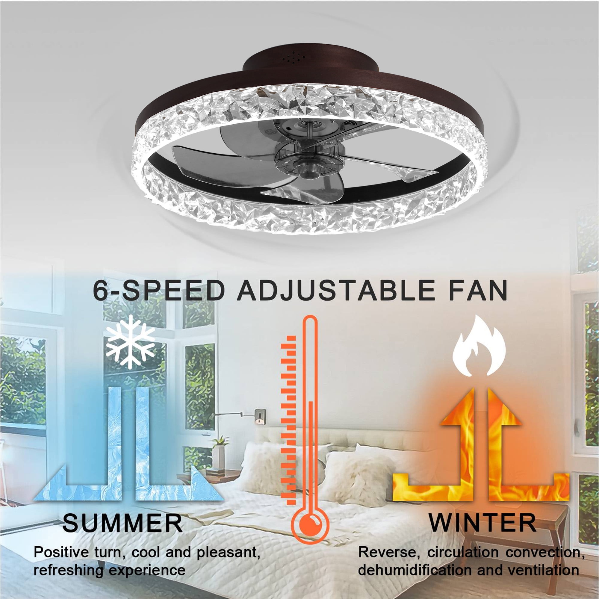 Upgrade your space with the Aukfa AK-HCF1-004 flush-mount ceiling fan with lights and remote. Its dimmable LED lights and adjustable color temperature provide versatile lighting options, all controlled by a handy remote. Enjoy whisper-quiet operation and six wind speeds for ultimate comfort, along with a timer for energy efficiency. The enclosed design with invisible blades ensures even air distribution and easy cleaning. Perfect for any room, this low profile ceiling fan with light adds style and convenience to your home.