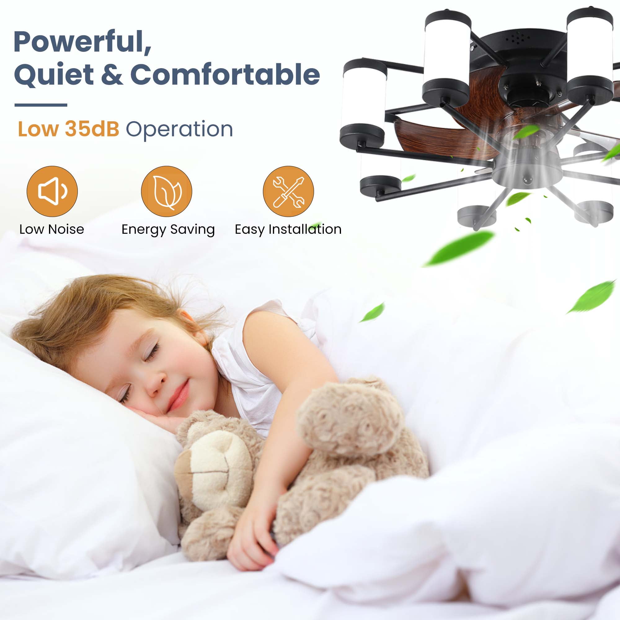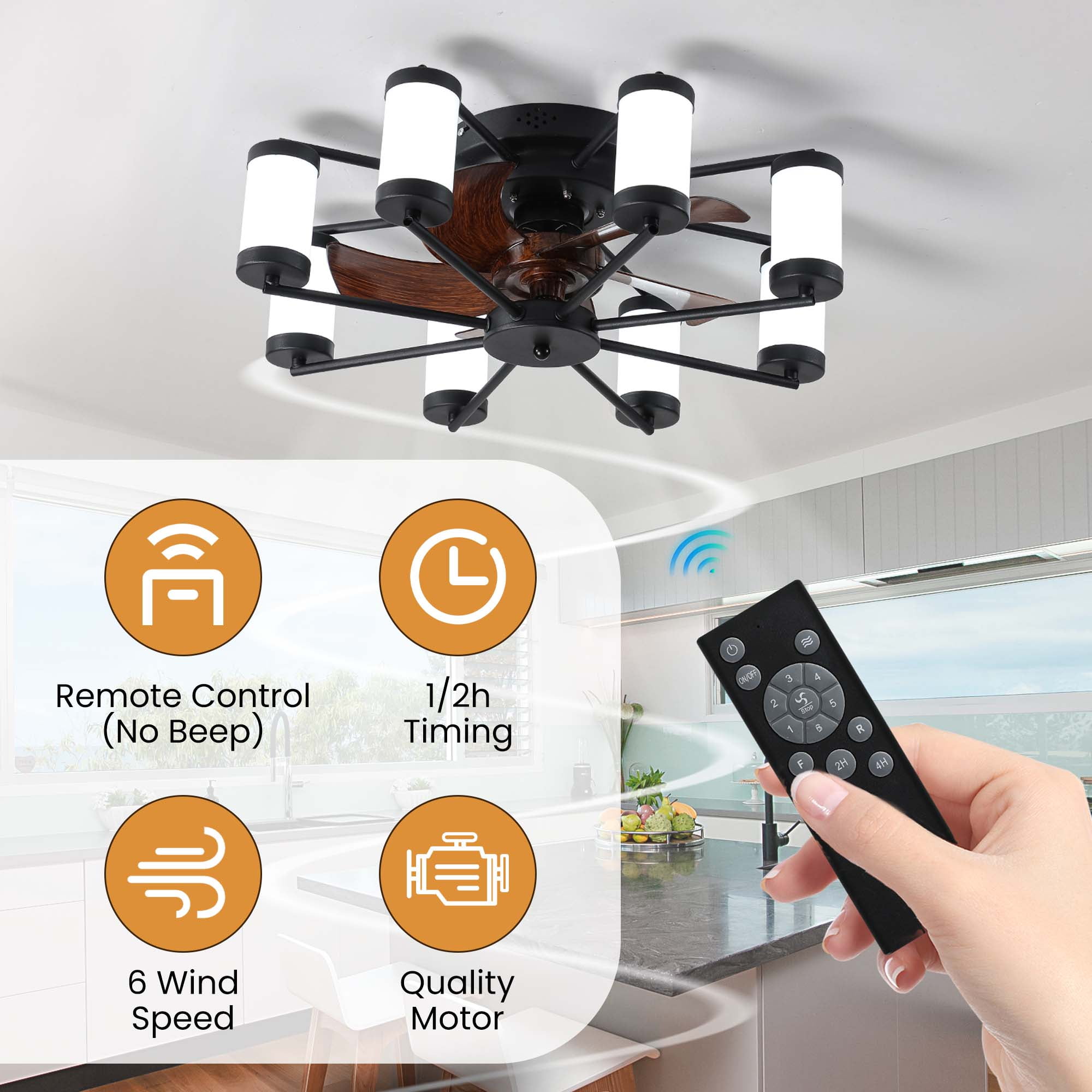 Features HIGH-QUALITY MATERIAL – This fan is meticulously crafted using durable ABS blades and a robust iron LED light frame, ensuring exceptional longevity and reliability. The high-quality materials guarantee a durable and reliable performance, making it a long-lasting investment for customers. VERSATILE REMOTE CONTROL – Included with the fan is a versatile remote control that enables separate control of the fan and LED light. With a simple press of a button, users can effortlessly turn the fan and light on or off, change the LED light color, adjust the fan speed, and even set convenient timing functions. This user-friendly and versatile remote control enhances the overall user experience. REVERSIBLE MOTOR FOR EFFICIENT AIRFLOW – Equipped with a reversible motor, this fan offers a distinctive feature. When the fan rotates clockwise, it generates a refreshing cool airflow, while rotating it counterclockwise creates an upward airflow that redistributes warm air toward the ceiling. This ingenious feature promotes energy efficiency and helps maintain a comfortable environment. ENERGY-EFFICIENT DC MOTOR – The fan utilizes an energy-efficient DC motor, making it a cost-effective choice. Compared to conventional AC fan motors, the DC motor operates with up to 70% higher efficiency, significantly reducing energy consumption and utility costs. This environmentally-friendly feature aligns with Amazon’s commitment to sustainability and energy efficiency. STYLISH DESIGN – The fan showcases an exquisite design that seamlessly combines the sleek appearance of the 21.7″ diameter ABS blades with the elegant iron LED light frame. Its modern and stylish aesthetic makes it a coveted addition to any space, effortlessly enhancing the overall decor and ambiance. Weights & Dimensions Product Size: 21.70 x 21.70x 7.50 inch Product Weight: 6.7lb Product Package Size: 22.80 x 22.80 x 8.90 inch Product Package Weight: 10.1lb Specifications Fan Type: Bladeless Compatible Room Size: Small rooms (up to 8 X 10); Medium rooms (up to 12X14) Blade Material: ABS Light Kit Included: Yes Blades Included: Yes Blade Pitch: 10 degrees Blade Material: Plastic Number of Blades Accommodated: 5 Number of Speeds: 6 DC Motor: Yes Reversible Motor: Yes Low Noise: Yes Plug-In: No Watt Equivalence: 28W Compatible Ceiling Fan Parts: Light Kit; Light Bulb; Remote Control Light Kit Type: Integrated Number of Lights: 8 Dimmable: Yes Independent Light: Yes Supplier Intended and Approved Use: Residential Use Voltage: 110 Volt Fan Control Parts Included: Remote Control Removable Blades: Yes Adjustable Length: No Product Care: Wipe Clean With a Dry Cloth Package Information 1 x Ceiling Fan Kit 1x Remote Control 1 x User Manual: AK_AK-HLC1M09010-K0_PUM_VY-072523 Notice Manual measurement has been used, there may be some reasonable error. Items may slightly differ from photo in terms of color due to the lighting or your monitor’s display.