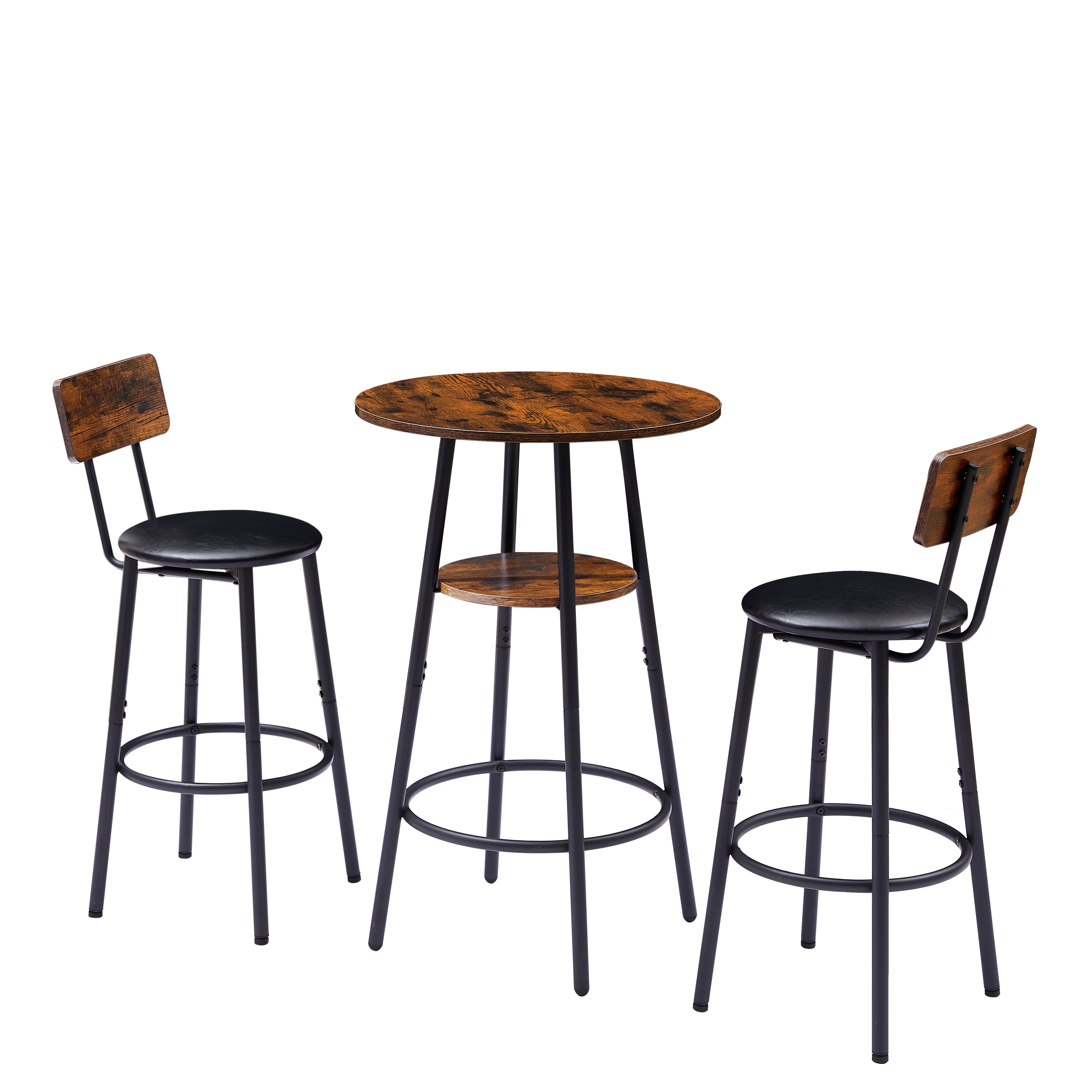 AUKFA 3-Piece Bar Table Set, Pub Dining Table & PU Upholstered Stools with Backrest for Kitchen Small Space, Rustic Brown
