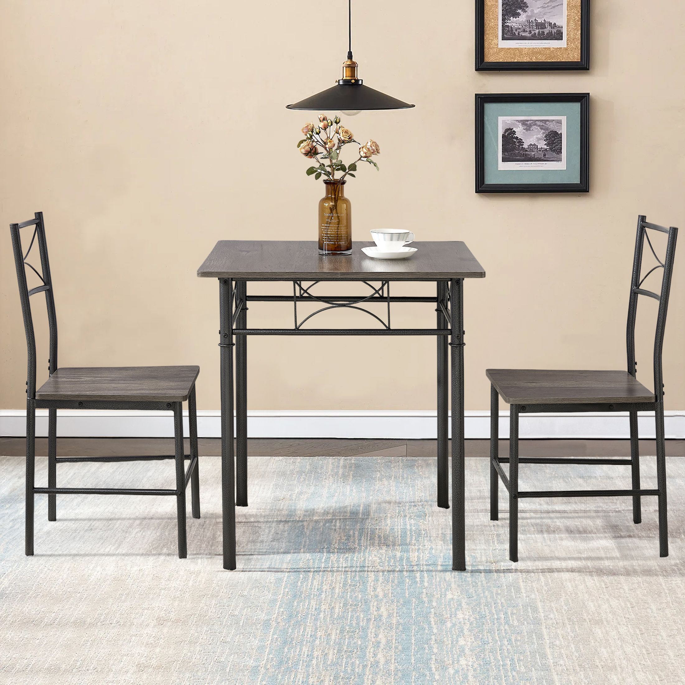 Aukfa 3-Piece Modern Dining Table Set, Square Table and 2 Chairs with Steel Frame – Gray