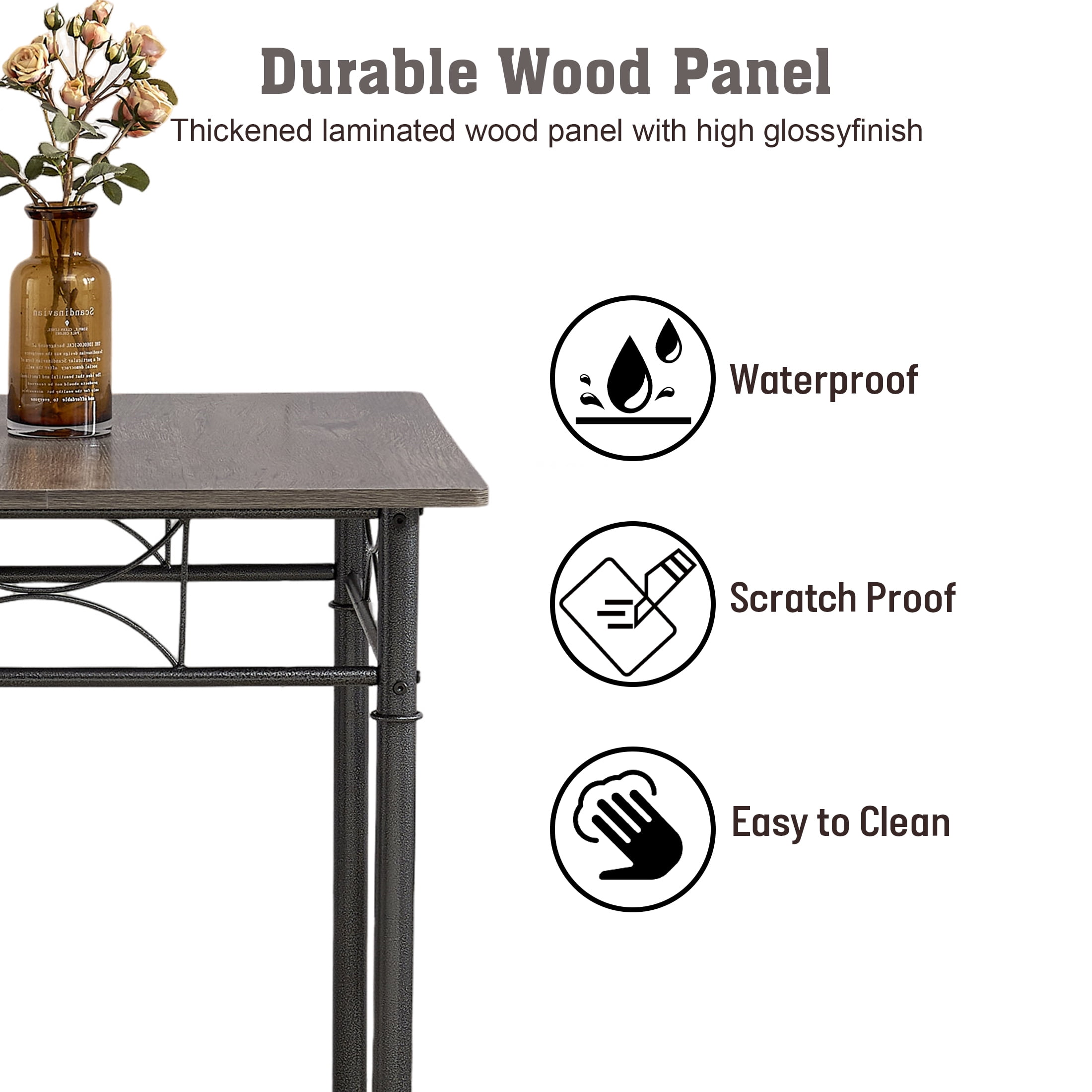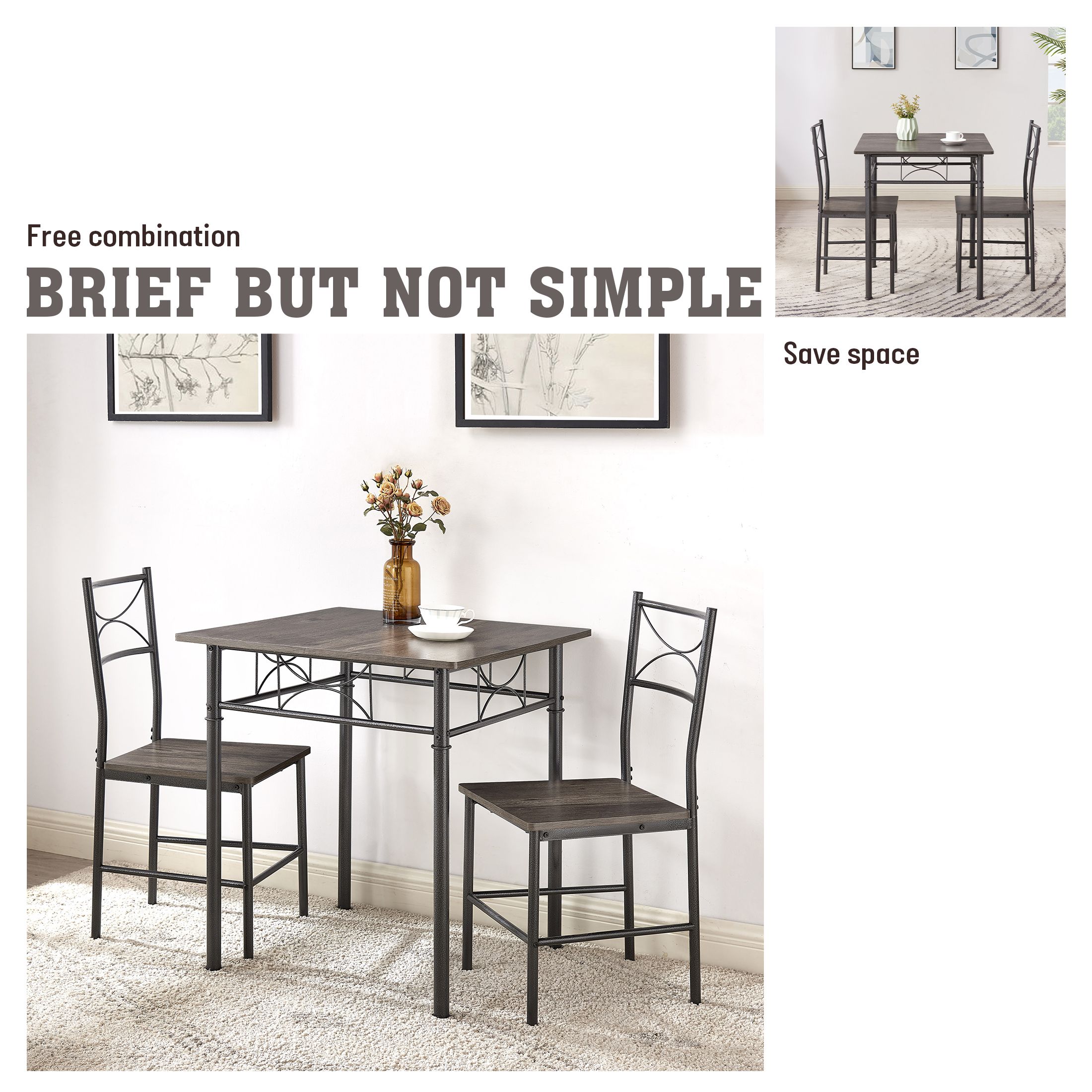 Features DURABLE AND STURDY – Made of high quality particleboard wood and sturdy steel supporting frames ,this dining table set is extremely sturdy and durable for a long lifespan.Retro brown tabletop with black-finished legs add a stylish classical upscale feel to any living space. VERSATILITY DESIGN – Suitable for kitchen dining room restaurant, also could be used as a office desk,study desk,writing desk.it is a good choice for decorating your home perfectly and enjoying food with family or friends in your leisure time. Featuring ergonomic curved backrest,The bottom of the chair has a non-slip cover for safety, space-saving design.The chairs will give you a comfortable seating experience. Smooth table & chair finished let you easily wipe them clean.Packed with detailed instructions, labeled accessories and installation tools, which makes assembly simply. Specifications Table Dimensions: 27.5″D x 27.5″W x 30″H Chair: 15.1″D x 15.6″W x 33.8″H Number of Chairs Included: 2 Material: Metal; Wood Warranty Length : Ten Months User Manual: AK_AK-HK02M09002-K1_PUM_VY-072624
