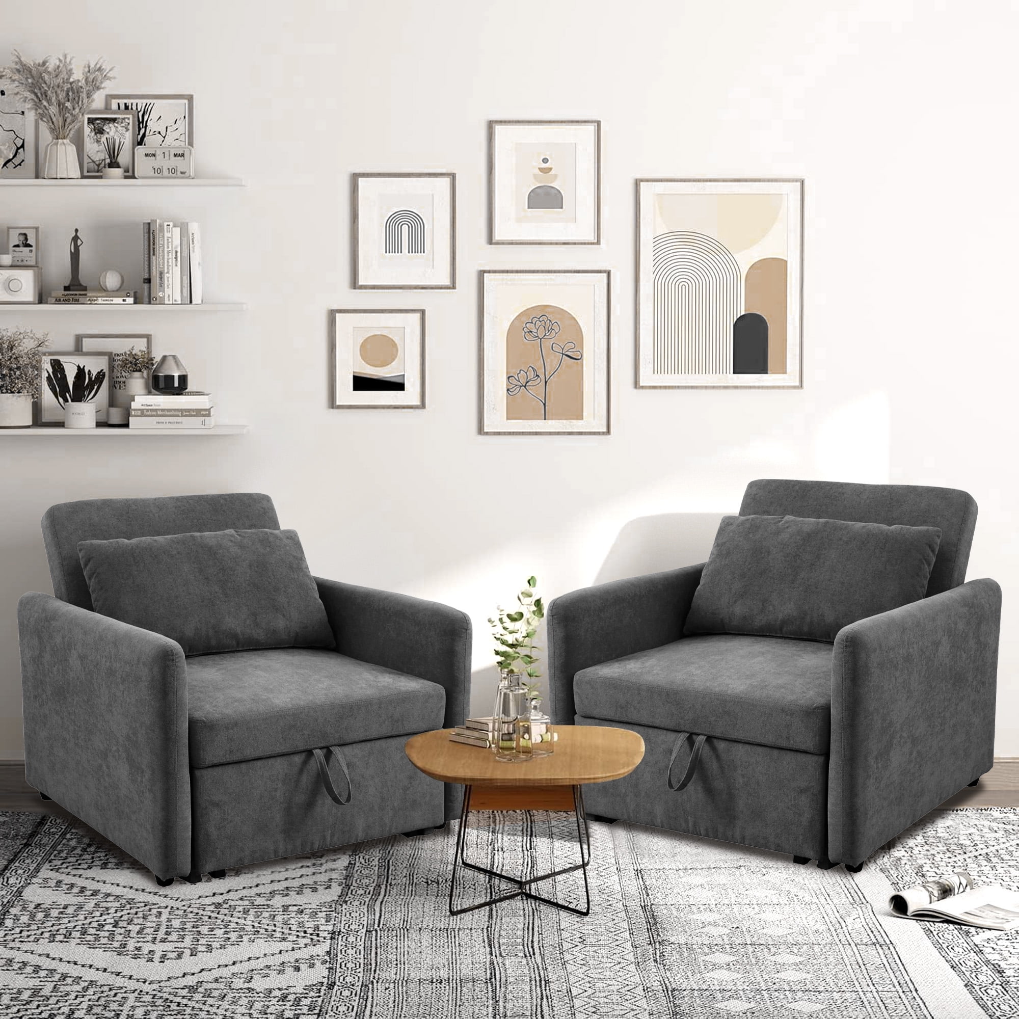 COMFORT REDEFINED – Sink into the plush embrace of the AK-FS02-027 3-in-1 sleeper chair bed’s generously cushioned seat and backrest. Crafted with premium materials, its ergonomic design provides exceptional support, making it a luxurious seating option for hours of relaxation. Whether you’re catching up on your favorite book, watching a movie, or engaging in conversations, this chair offers an unparalleled level of comfort. perfect for your dorm, apartment, and home office. 3 IN 1 CONVERTIBLE DESIGN – Tired of sacrificing space for extra bedding? With our 3-in-1 sleeper chair bed, versatility is the name of the game. Effortlessly transform this stylish chair into a comfortable lounger with a simple adjustment. And when overnight guests arrive, watch as it converts into a cozy bed that ensures a peaceful night’s sleep. The hassle of accommodating visitors is now a thing of the past. QUALITY MEETS DURABILITY – Crafted with precision and attention to detail, this sleeper chair bed is built to last. The sturdy frame and high-quality upholstery not only provide comfort but also ensure long-term durability. The fabric used is resistant to lint and wear, maintaining the chair’s elegant appearance even after prolonged use. 3-LEVEL ADJUSTABLE BACKREST – The backrest of the sofa chair can be adjusted at three angles of 108°, 145° and 180°, which can better adapt to your different needs at different times. Whether you want to read on the couch / play games on the recliner/nap on the sofa bed, this is the ideal choice for you. WORRY-FREE PURCHASE – Sincerity, friendliness and responsibility are our service philosophy. We offer you a 12-month warranty and lifetime technical support. If you have any questions, please don’t hesitate to contact us. CONVENIENT & WIDE APPLICATIONS – Simple to operate, the bottom sofa has wheels that can be easily pulled out to create a bed. Sofa chair dimensions: 37″D x 36″ W x 33.5″H. Sofa bed dimensions: 75″D x 36″W x 17″H. SPECIFICATION: PRODUCT INFORMATION Overall: 37″D x 36″ W x 33.5″H Open size – sleeper: 75″D x 36″W x 17″H. Back Cushion: 16”H Seat Width: 26” Seat Depth: 29” Seat High: 17” Leg High: 1” Minimum Door Width: 31” Product Weight: 102.5 lbs Cross Weight: 113.9 lbs Carton Size: 48”L x 29.5” W x 23”H Features Product Type: Sleeper Chair Bed Seating Capacity: 1 Detachable Mattress Included: No Frame Material: Metal Weight Capacity: 330 lb Sleeper Size: Twin Upholstery Material: Lint Upholstery Color: Gray Fill Material: Foam Toss Pillows Included: Yes Supplier Intended and Approved Use: Residential Use Leg Material: Metal Leg Color: Black Arms Included: Yes Back Type: Tight back Back Fill Material: Foam Cushion Construction: Foam Arm Type: Square Arms Product Care: Wipe clean with a dry cloth Assembly Level of Assembly: Partial Assembly Adult Assembly Required: Yes Suggested Number of People for Assembly/Install: 2 Additional Tools Required (Not Included): All Tools Included Warranty Product Warranty: Yes Full or Limited Warranty: Limited Warranty Length: One Year