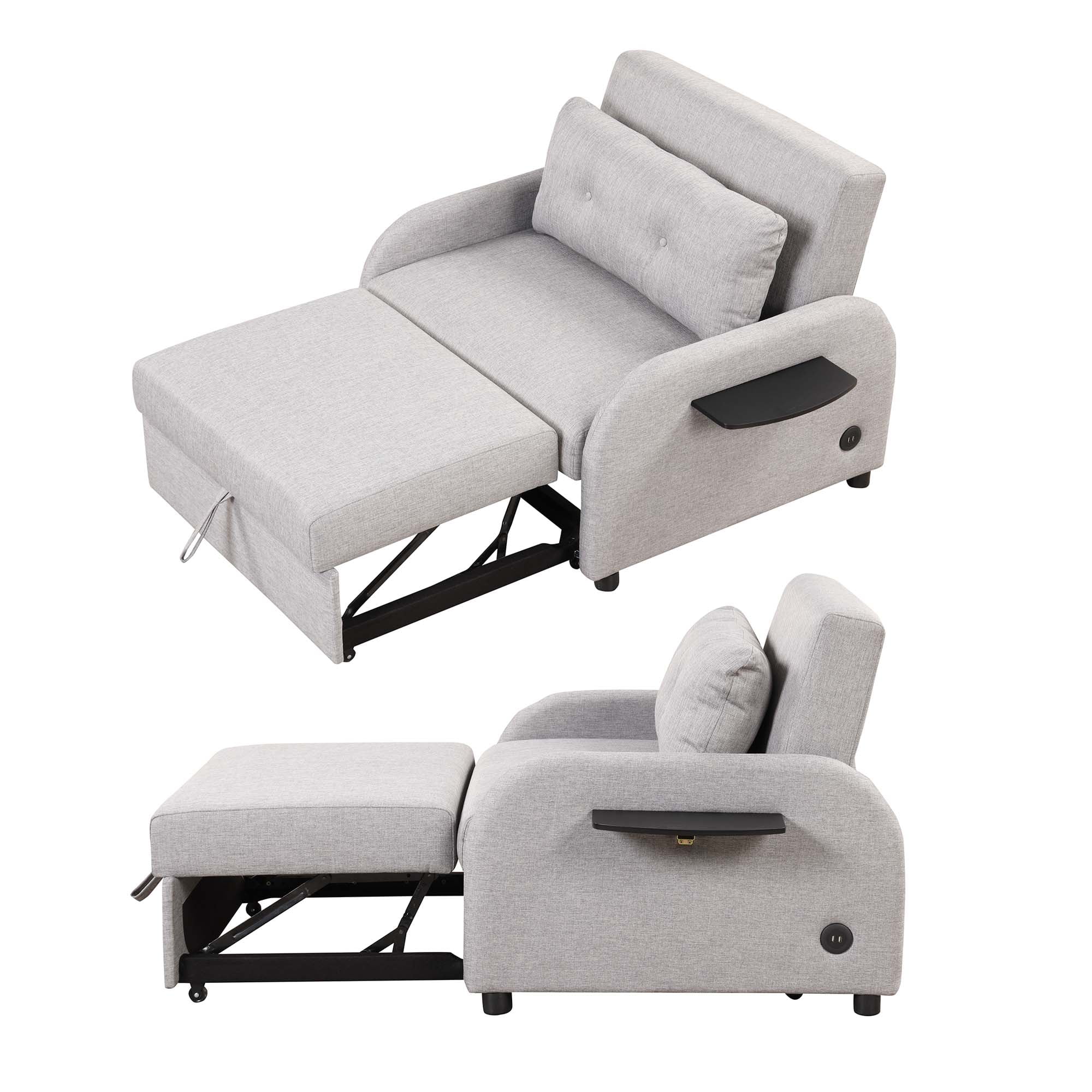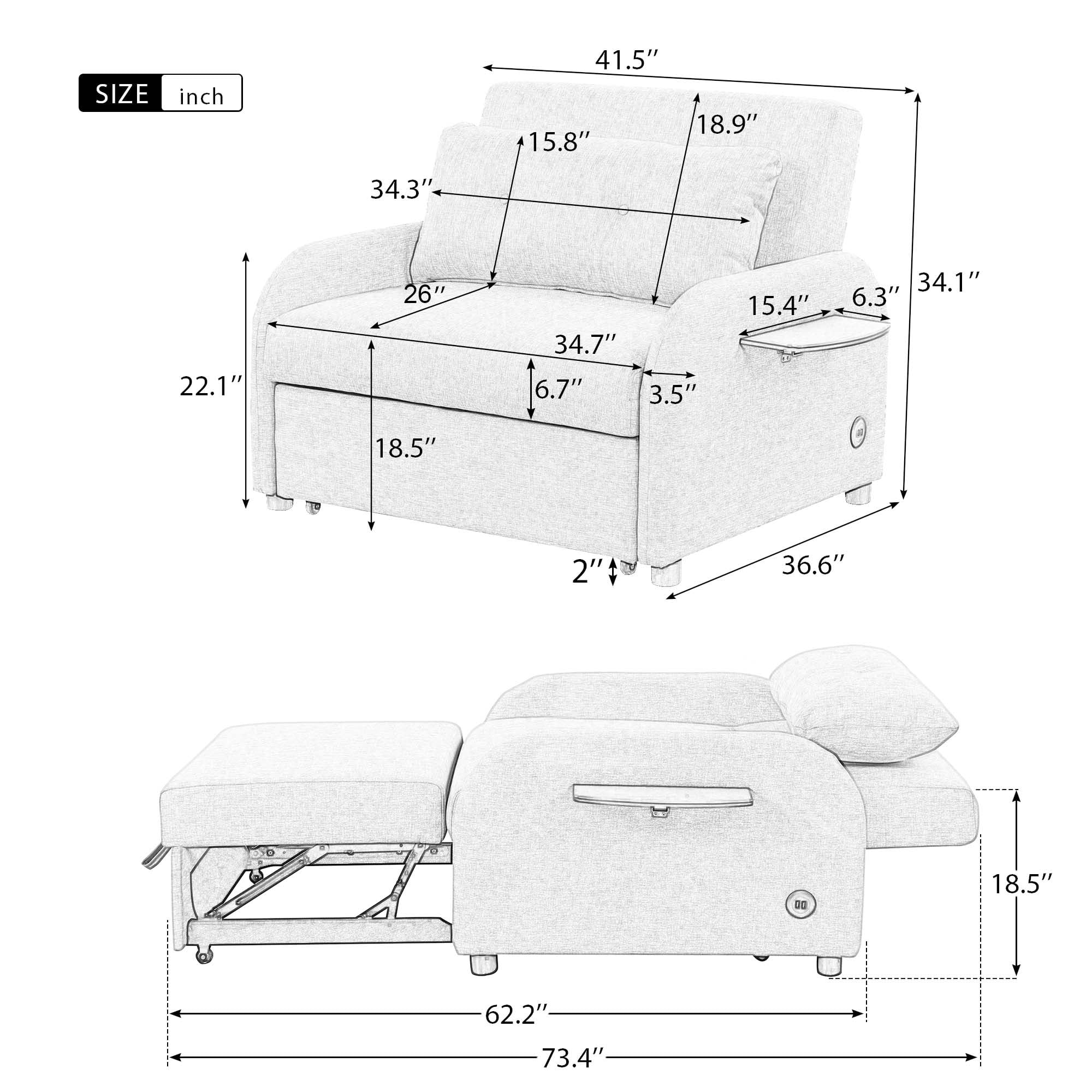 Features 3-IN-1 CONVERTIBLE SOFA BED – This oversize convertible sleeper chair with USB Port can be easily converted into an armchair, chaise, recliner and bed, which greatly saves indoor space and is suitable for dormitories, flats, studios, offices and other small rooms. Simply pull out the hidden upholstery and enjoy sitting, lying and sleeping without changing the position. STRONG AND DURABLE STRUCTURE – Robust and enduring in structure, this pull-out sofa chair bed features a high-quality steel frame capable of supporting up to 250 pounds. When the futon couch is fully extended, the bottom frame shelf provides steadfast stability, ensuring a secure experience without any wobbling. Crafted from breathable and wear-resistant linen fabric, it resists pilling, thereby extending its service life. The inclusion of high-density foam strikes a perfect balance between comfort and exceptional support. 3 LEVELS ADJUSTABLE BACKREST – This convertible sofa bed chair is equipped with a three-level regulator, allowing you to effortlessly adjust the angles to 105°, 145°, and 180°. This adjustable backrest design adapts seamlessly to various scenarios, whether you prefer sitting down to read or reclining for a comfortable rest. It’s your ideal choice for flexible and personalized seating options. USB CHARGER AND WING TABLES – The built-in USB ports in the chair bed sleeper allows you to conveniently charge phones, tablets, or laptops without extra adapters, you can enjoy leisure or work activities on the sofa chair. The two sides folding small wings table offers a convenient surface for placing snacks, drinks, or electronic devices. EASY TO CONVERSION – The tail of this single sofa bed is pulled out in a drawer type, the equipped portable handle with the assistance of the bottom pulley device to quickly complete the bed transformation. The reclining sofa can also be used as a temporary bed when someone comes to your home for a sleepover. Weight & Dimensions Sofa Chair Size: 36.6″D x 41.5″W x 34.1″H Open size – sleeper: 73.4″L x 34.7″W x 18.5″H Backrest Height: 18.9”H Seat Width: 34.7” Seat Depth: 26” Seat High: 18.5” Product Weight: 115 lbs Specifications Product Type: Convertible Sleeper Chair/ Pull Out Sofa Bed Seating Capacity: 1 Frame Material: Metal, Hardwood Weight Capacity: 250 lb Sleeper Size: Twin Upholstery Material: Linen Back Type: Upholstered Back Storage Included: No Toss Pillows Included: Yes Fill Material: Foam Seat Construction: Wood; Spring; Foam Supplier Intended and Approved Use: Residential Use Leg Material: Plastic Leg Color: Black Position Lock: Yes Cushion Construction: Foam Product Care: Wipe clean with dry cloth Assembly Required: Yes Package Information 1 x Sofa Chair 1 x Pillow 4 x Wheels 1 x User Manual: AK_AK-HLS0FL2002-K0_PUM_VY-121323 Notes Manual measurement has been used, there may be some reasonable error. All the pictures are taken by actual samples, slight chromatic aberration may occur due to lighting or display.