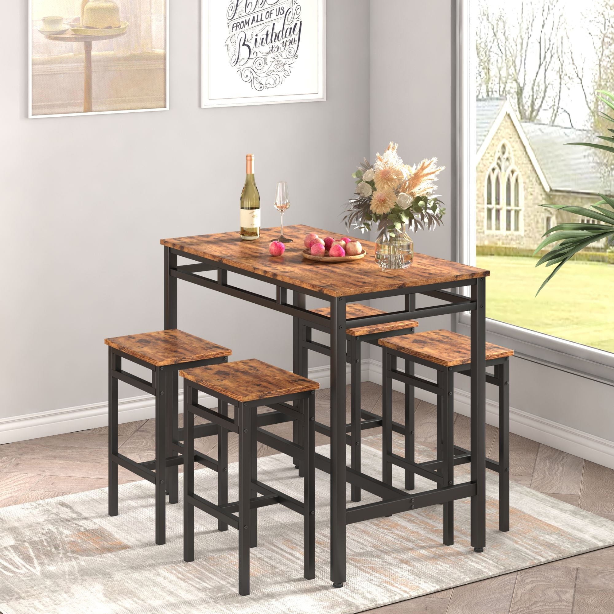 Features 5 PIECE BAR TABLE SETS – This kitchen table set for 4 includes 1 counter height pub table and 4 bar stools. Rustic wood grain and high-quality black metal frame create a minimalist industrial style that blends perfectly with any home decor. Suitable for dining area, kitchen, breakfast nook, home bar, and more. INDUSTRIAL STYLE – Two-tone construction of rustic wood and dark steel makes a distinct statement in a modern setting. The dining room table set’s simple design and size seamlessly accent your kitchen or other dining areas. STABLE AND STURDY CONSTRUCTION – Aukfa pub table and chairs set are made of high-quality thick particleboard and sturdy black metal structures, making them solid and durable. The footrest rack allows you to rest your feet. The adjustable foot pads adapt to uneven floor heights and prevent scratches. Bar tabletop can hold up to 350 lb, and each bar stool can hold up to 350 lb. SPACE-SAVING DESIGN – The breakfast bar table set for 4 features a compact design that allows you to make the most of your home’s spare corner or living area to create your own bar or bistro area. 4 chairs can be placed under the table when not in use, which will not obstruct your passage, while maintaining a clean and beautiful appearance. Perfect for small space. ASSEMBLY AND SHIPPING – Table Size: 43.3″L x 23.6″W x 35.4″H, Stool Size: 11″D x 15″W x 23.6″H. Shipped in 1 box from the US. All parts and accessories are labeled and come with detailed instructions to help you through the assembly process. Please feel free to contact us with any questions about this kitchen bistro set. Weight & Dimensions Bar Table Size: 43.3″L x 23.6″W x 35.4″H Chair Size: 11″D x 15″W x 23.6″H Chair Seat Height – Floor to Seat: 23.6” H Overall Product Weight: 59.44 LBS Number of packages: 1 Specifications Product Type: Bar Table Set for 4 Table: Yes Chairs: Yes Number of Chairs Included: 4 Number of People Set Accommodates: 4 Tabletop Shape: Rectangular Tabletop Material: Particleboard Table Base Material: Metal Seating Material: Particleboard Table Base Type: Four Legs Each Chair Weight Capacity: 350 lbs Table Weight Capacity: 350 lbs Supplier Intended and Approved Use: Residential Use; Non Residential Use Back Style: Backless Imported: Yes Durability: Waterproof PACKAGE INFORMATION 1 x Table 4 x Chairs 1 x User Manual: AK_AK-HK02WPB004-N3_PUM_VY-120823 Notes Manual measurement has been used, there may be some reasonable error. All the pictures are taken by actual samples, slight chromatic aberration may occur due to lighting or display.