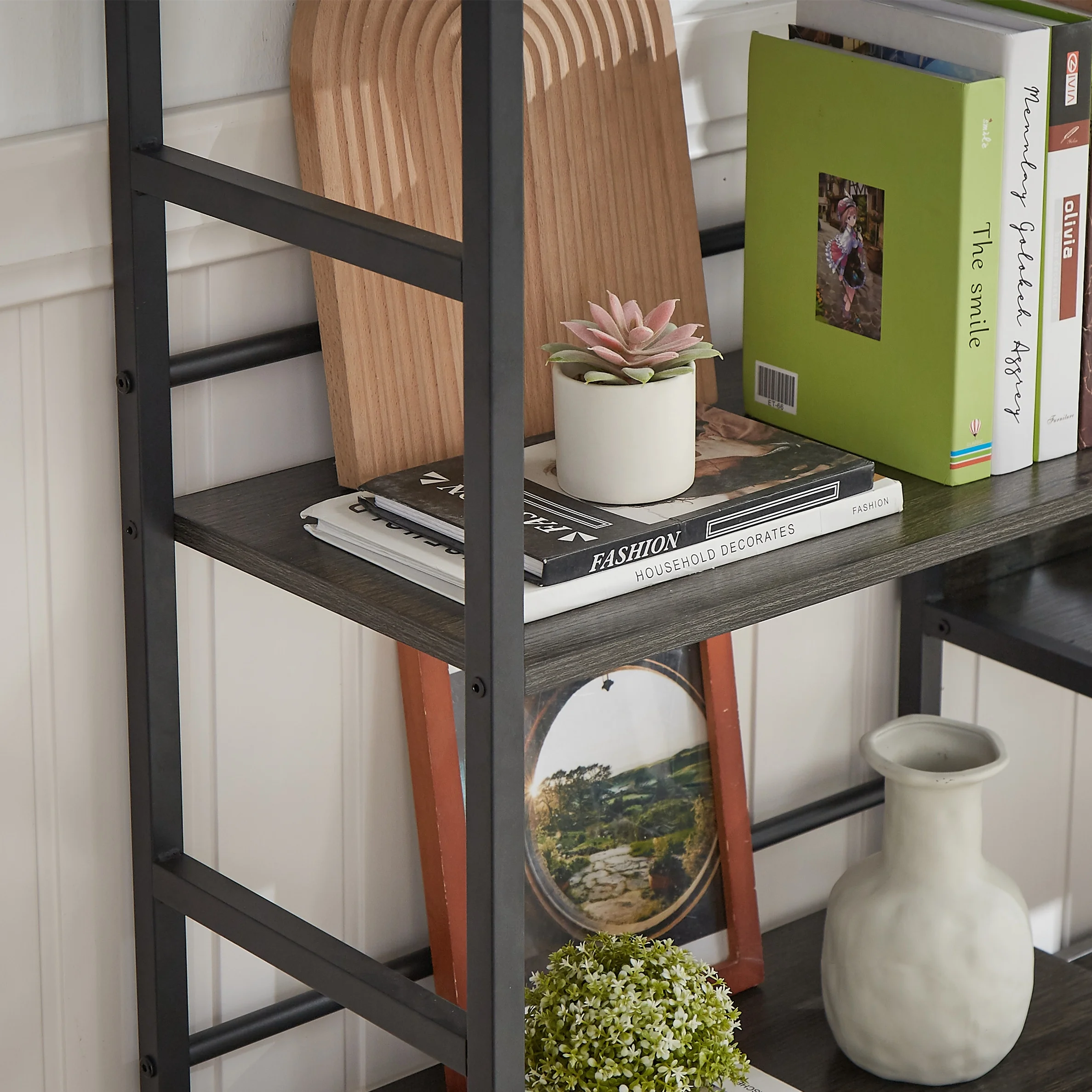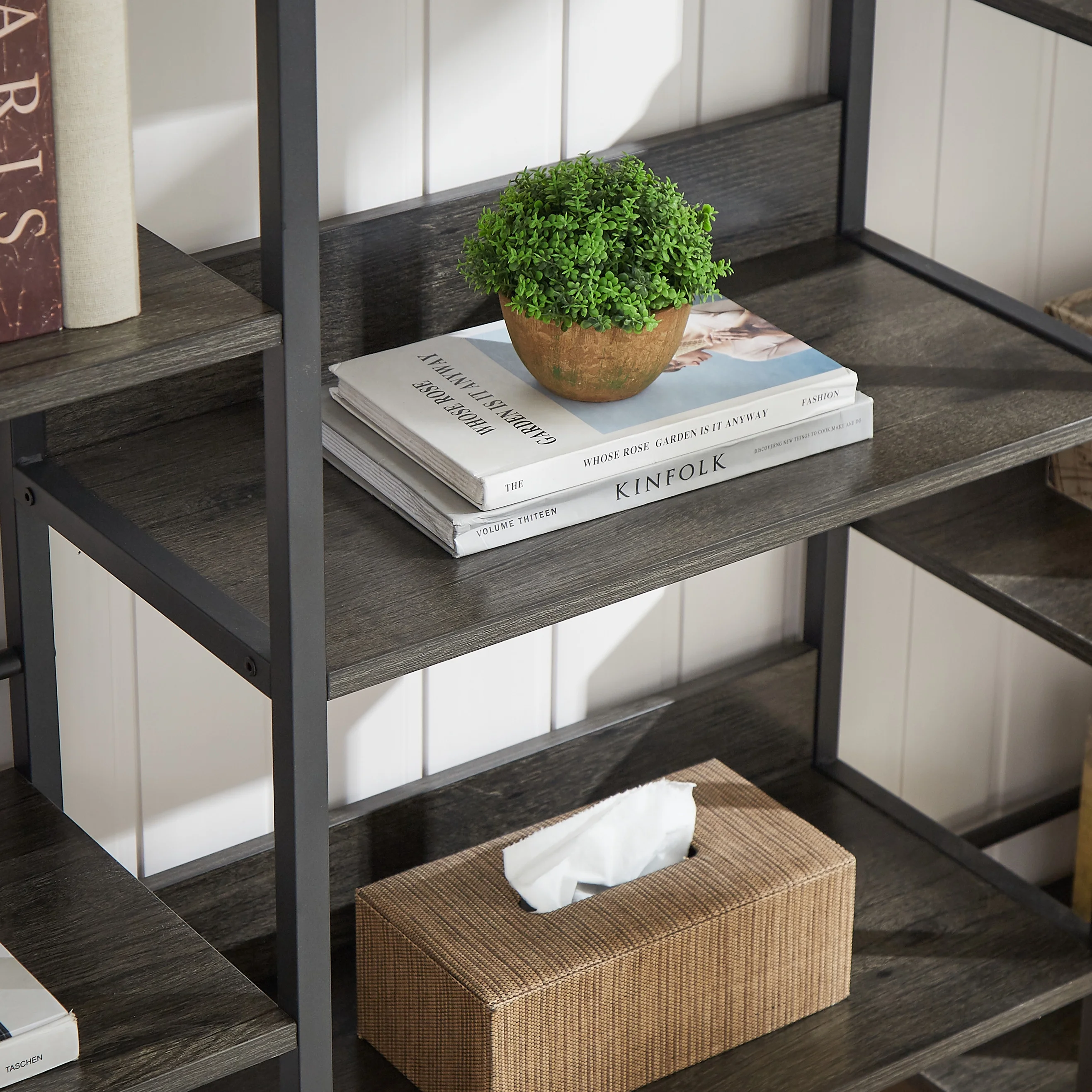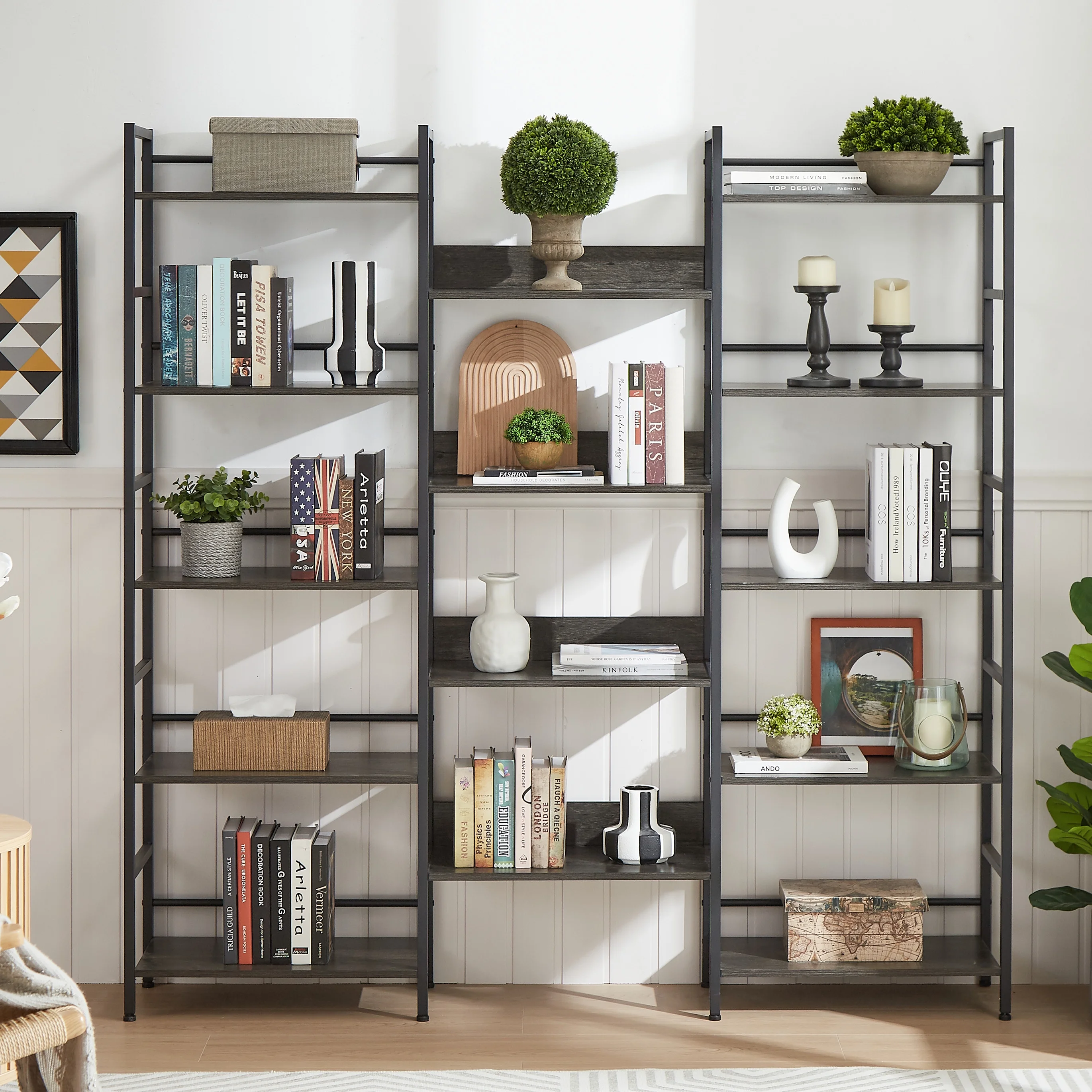 Aukfa AK-FB04-010 5-Shelf Bookcase triple large industrial bookshelf is simple, stable, durable steeped in industrial style, 17 Stories Bookcase strikes a warm balance of wood and metal. 5-Shelf Bookcase for Living Room Home Office, a versatile and functional storage solution that combines high-quality materials with thoughtful design elements.Constructed with a durable metal frame and engineered wood, this bookcase is built to last. Each sturdy plank can hold an impressive 85 lbs, ensuring reliable support for your items.Featuring three wide display racks with a total of 14 open shelves, whether you’re organizing books, displaying decorations, or storing essentials, the ample storage capacity caters to your needs.Designed with practicality in mind, the bookshelf is equipped with a guardrail design on the back. This prevents items from falling into the gap between the bookshelf and the wall, ensuring your belongings stay secure.Safety is a priority, and our bookcase comes with an anti-tipping design for added stability. Eight adjustable feet not only keep the bookcase steady but also protect your floors from scratches.Beyond its functional qualities, this 5-Shelf Bookcase serves as a stunning display stand for your decorations. Its versatile design makes it suitable for various rooms, such as the living room or bedroom.Elevate your organization and interior decor with our 5-Shelf Bookcase.