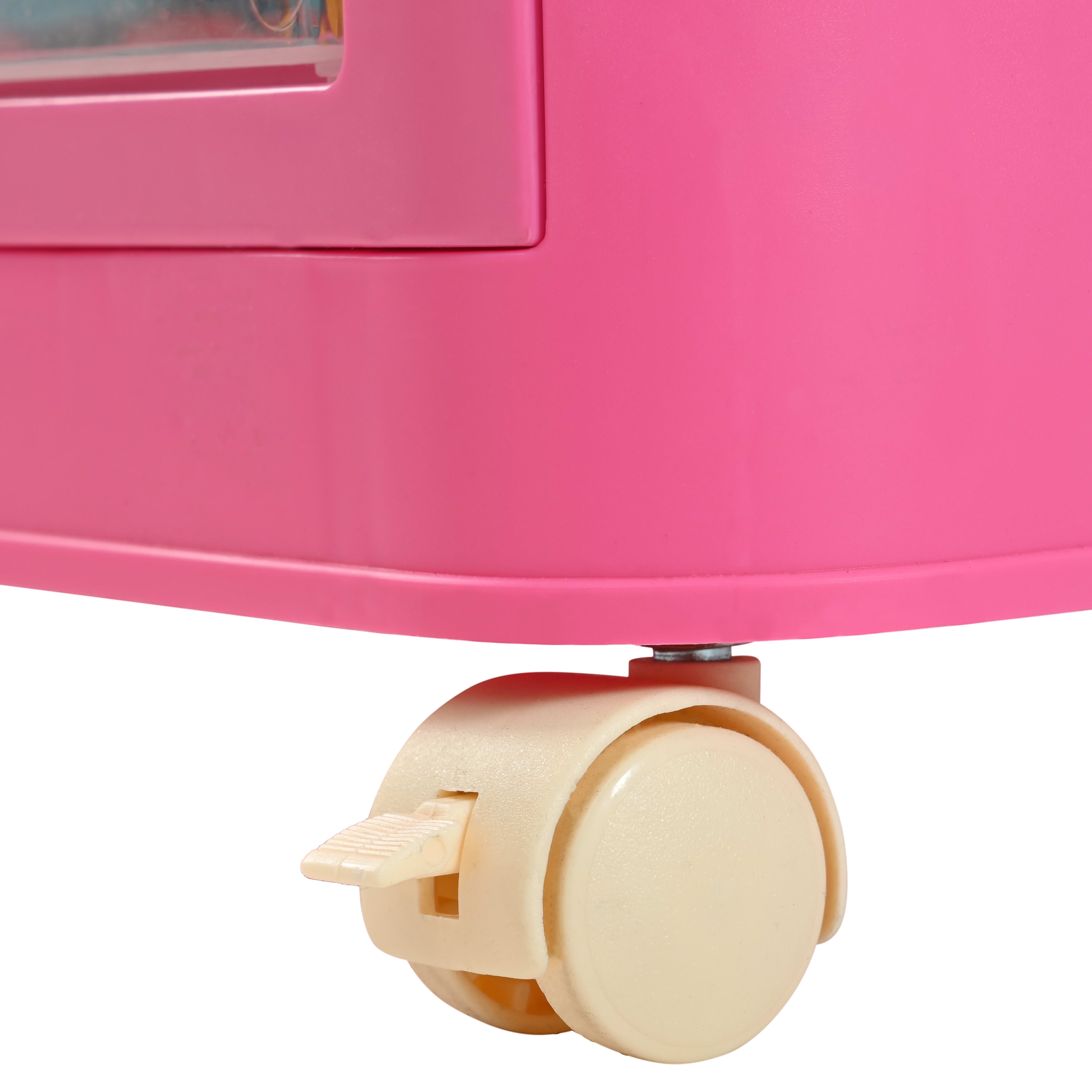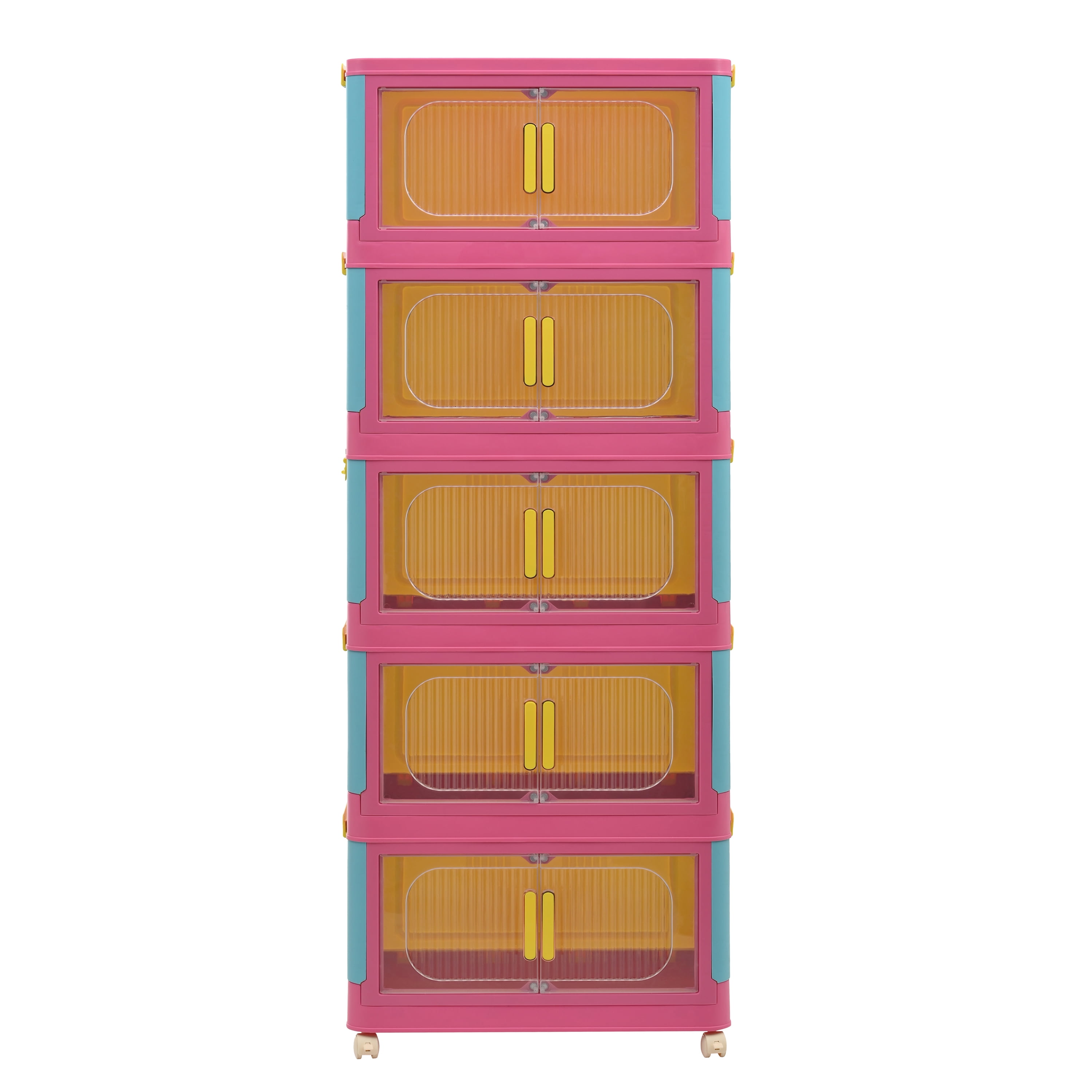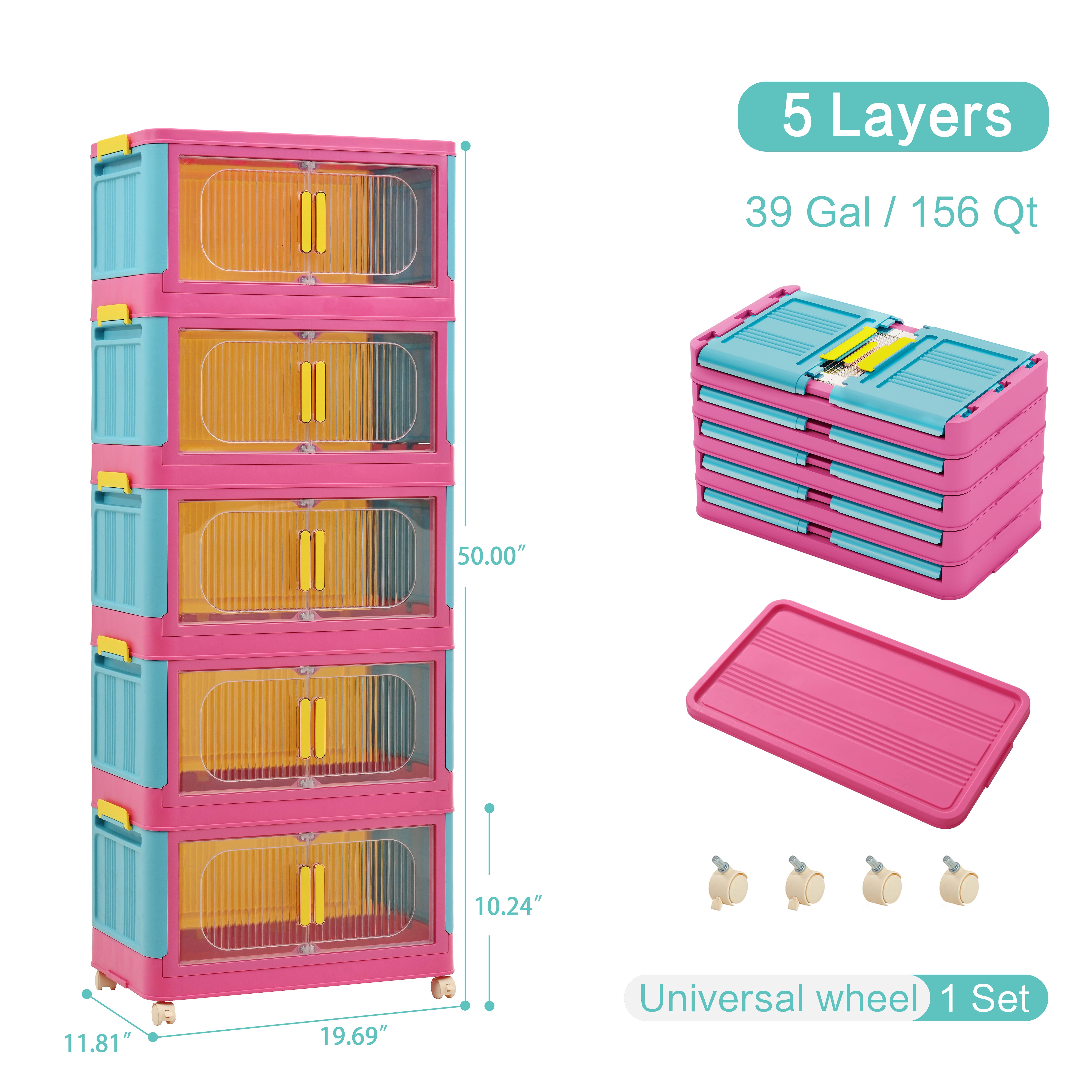 Aukfa 5 Tier Collapsible Storage Bins,20″ Side Plastic Storage Cabinet with Wheels,Pink