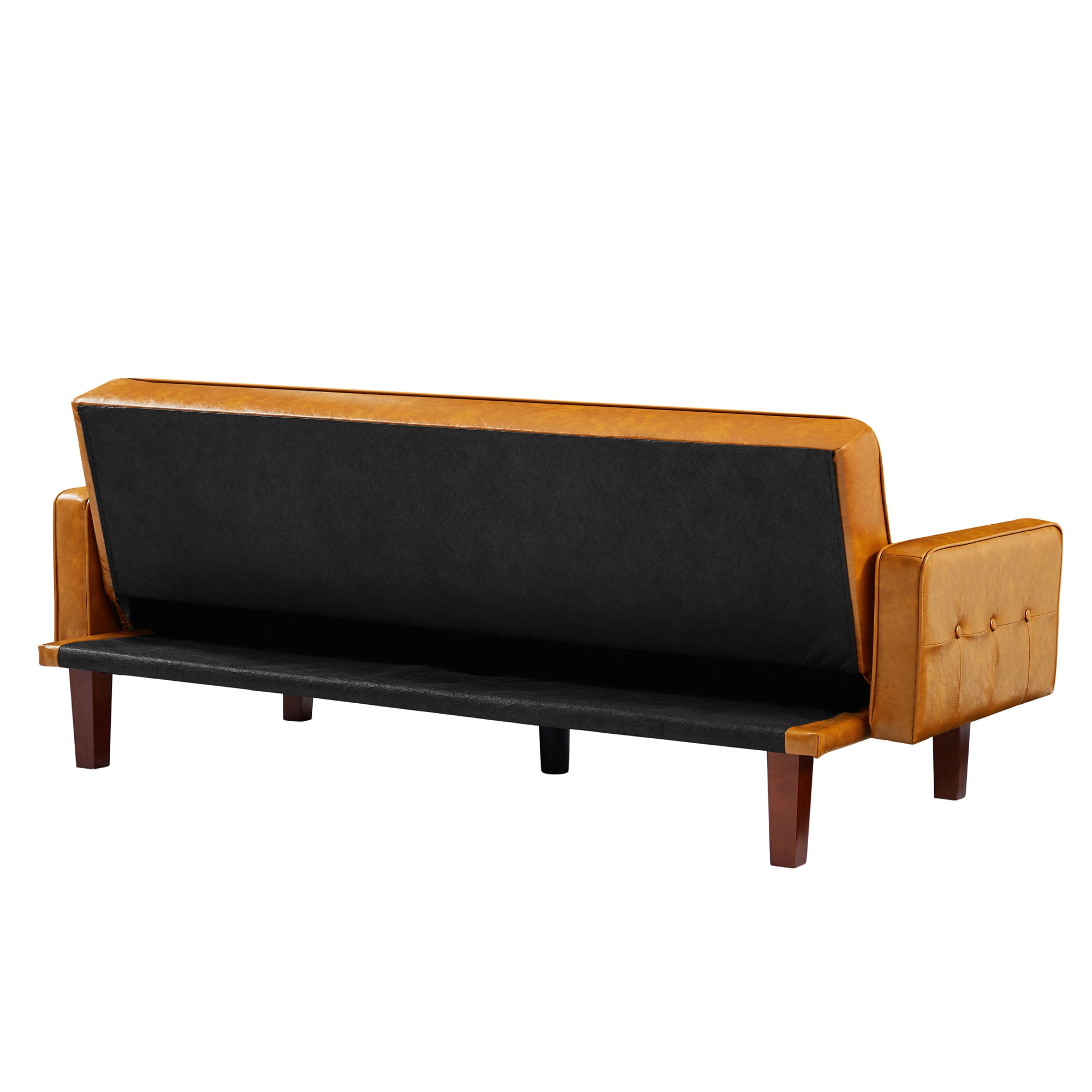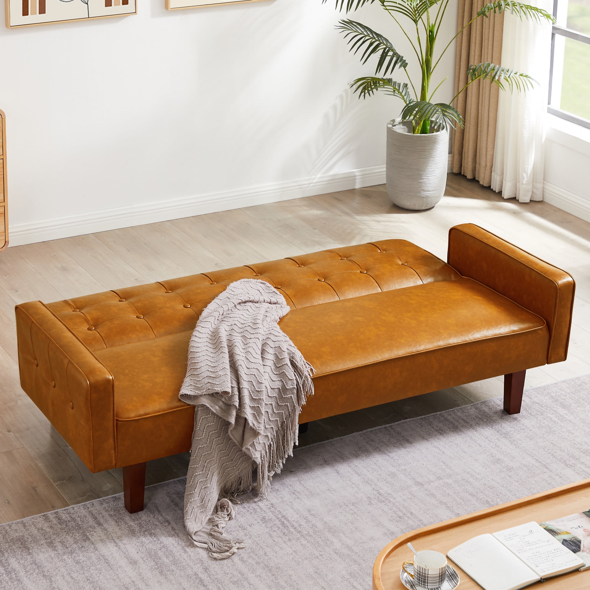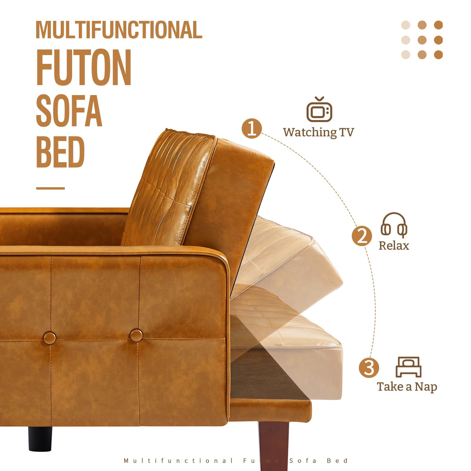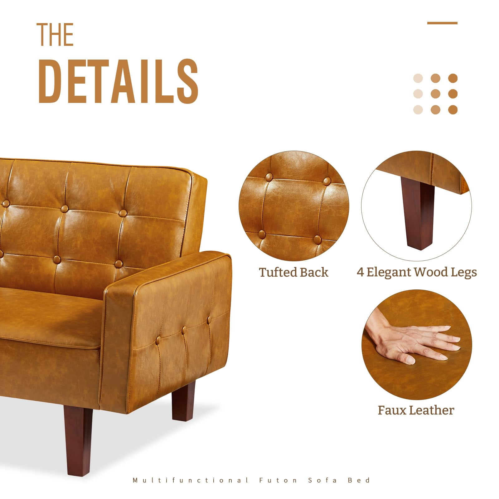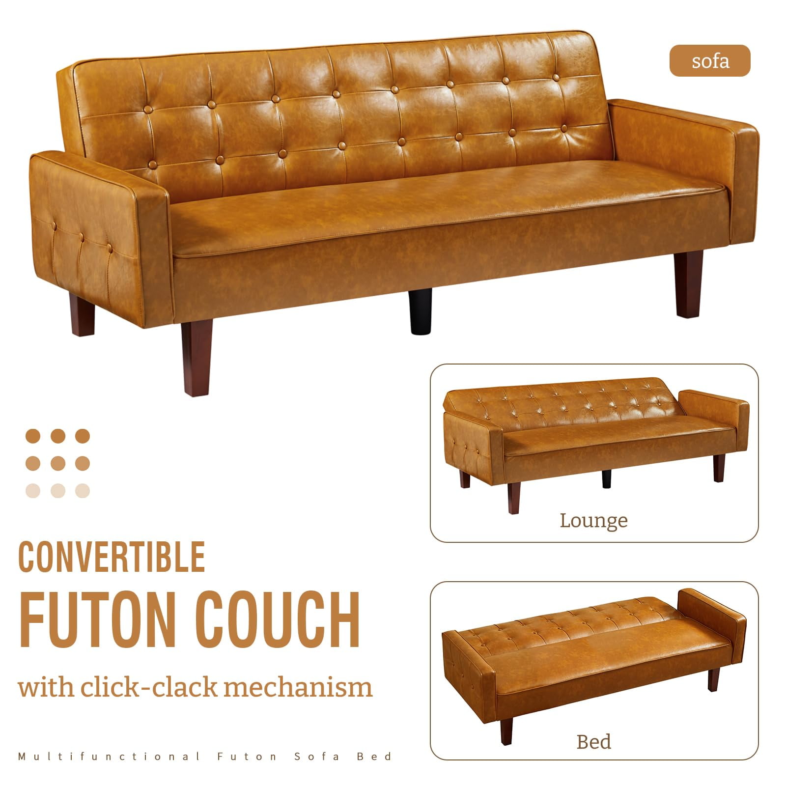 Aukfa 75″ Button-Tufted Futon Convertible Sofa Bed for Home Office, Leather, Brown
