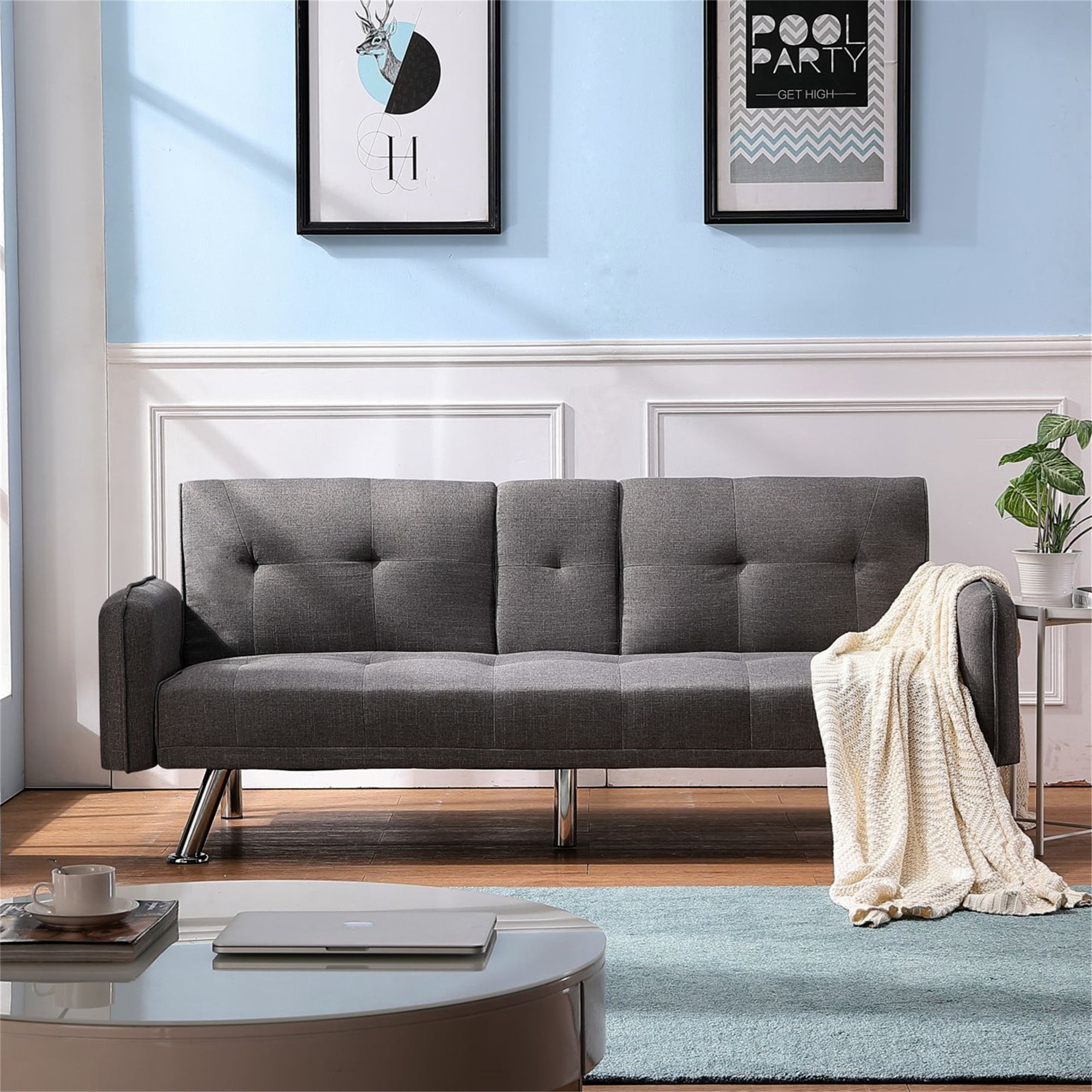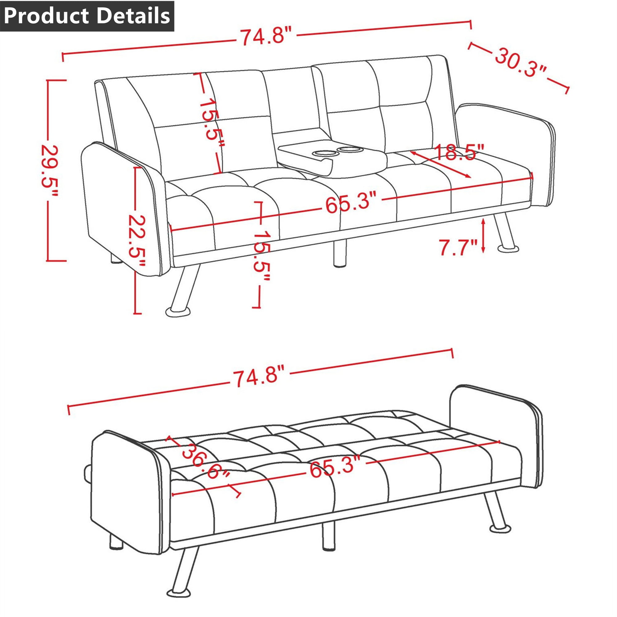 MODERN STYLE AND VERSATILITY – This Aukfa AK-FF01-038 futon sofa bed is designed with a fashionable appearance and modern style, perfect for an apartment, home living room, studio, study room, game room, and guest room. FUTON WITH HIDDEN CUP HOLDER – Folding the middle armrest with 2 cup holders in the middle of the sofa allows you and your family and your friends to enjoy drinks while relaxing. It can make it more convenient for you and your family to drink while watching a sports game. CONVERTIBLE SOFA BED – This futon sofa bed features a folding contraption that locks the back at 105 degrees for reading/TV or 140 degrees for lounging. It can also be rolled down to a twin-size bed. COMFY MATERIAL – The eye-catching solid-hued linen fabric highlights the charming face of this sofa, with an excellent touch and high-quality foam cushions. The tufted back enhances the design, and the armrest can be removed and placed on the other side when sleeping. DURABLE – Elevated on 5 metal legs, this futon sofa bed features a wooden frame, breathable linen fabric upholstery, foam fill, and metal zig-zag springs for a robust structure and unmatched durability. EASY ASSEMBLY – All parts and instructions are smartly packed into one box and require only one person to assemble. Takes less than 15 minutes to assemble and is easy to move around the house. Tips: This futon sofa’s arms, legs, and accessories are all hidden in its bottom compartment, which can be accessed by opening the zipper at the bottom of the sofa. MODERN STYLE AND VERSATILITY – This Aukfa AK-FF01-038 futon sofa bed is designed with a fashionable appearance and modern style, perfect for an apartment, home living room, studio, study room, game room, and guest room. FUTON WITH HIDDEN CUP HOLDER – Folding the middle armrest with 2 cup holders in the middle of the sofa allows you and your family and your friends to enjoy drinks while relaxing. It can make it more convenient for you and your family to drink while watching a sports game. CONVERTIBLE SOFA BED – This futon sofa bed features a folding contraption that locks the back at 105 degrees for reading/TV or 140 degrees for lounging. It can also be rolled down to a twin-size bed. COMFY MATERIAL – The eye-catching solid-hued linen fabric highlights the charming face of this sofa, with an excellent touch and high-quality foam cushions. The tufted back enhances the design, and the armrest can be removed and placed on the other side when sleeping. DURABLE – Elevated on 5 metal legs, this futon sofa bed features a wooden frame, breathable linen fabric upholstery, foam fill, and metal zig-zag springs for a robust structure and unmatched durability. EASY ASSEMBLY – All parts and instructions are smartly packed into one box and require only one person to assemble. Takes less than 15 minutes to assemble and is easy to move around the house. Tips: This futon sofa’s arms, legs, and accessories are all hidden in its bottom compartment, which can be accessed by opening the zipper at the bottom of the sofa. SPECIFICATION: PRODUCT INFORMATION Overall: 74.8″L x 30.3″ W x 29.5″H. Open size – sleeper: 74.8″L x 36.7″W Back Cushion: 15.5”H Seat Width: 65.3” Seat Depth: 18.5” Seat High: 15.5” Leg High: 7.7” Minimum Door Width: 20” Product Weight: 70 lbs Cross Weight: 80 lbs Carton Size: 66.5”L x 37.8” W x 7.1”H Feature Product Type: Futon Sofa Bed Seating Capacity: 2 Frame Material: Solid Wood Weight Capacity: 600 lb Sleeper Size: Twin Upholstery Material: Linen Upholstery Color: Dark Gray Fill Material: Foam Seat Construction: Solid Wood Supplier Intended and Approved Use: Residential Use Leg Material: Metal Leg Color: Chrome Back Type: Tufted Back Arm Type: Square Arm Product Care: Dust regularly. Clean gently with a clean, slightly damp cloth. PRODUCT INFORMATION Overall: 74.8″L x 30.3″ W x 29.5″H. Open size – sleeper: 74.8″L x 36.7″W Back Cushion: 15.5”H Seat Width: 65.3” Seat Depth: 18.5” Seat High: 15.5” Leg High: 7.7” Minimum Door Width: 20” Product Weight: 70 lbs Cross Weight: 80 lbs Carton Size: 66.5”L x 37.8” W x 7.1”H Product Type: Futon Sofa Bed Seating Capacity: 2 Frame Material: Solid Wood Weight Capacity: 600 lb Sleeper Size: Twin Upholstery Material: Linen Upholstery Color: Dark Gray Fill Material: Foam Seat Construction: Solid Wood Supplier Intended and Approved Use: Residential Use Leg Material: Metal Leg Color: Chrome Back Type: Tufted Back Arm Type: Square Arm Product Care: Dust regularly. Clean gently with a clean, slightly damp cloth. Assembly Level of Assembly: Partial Assembly Adult Assembly Required: Yes Suggested Number of People for Assembly/Install: 1 Additional Tools Required (Not Included): All Tools Included Warranty Commercial Warranty: No Product Warranty: Yes Full or Limited Warranty: Limited Warranty Length: One Year Level of Assembly: Partial Assembly Adult Assembly Required: Yes Suggested Number of People for Assembly/Install: 1 Additional Tools Required (Not Included): All Tools Included Commercial Warranty: No Product Warranty: Yes Full or Limited Warranty: Limited Warranty Length: One Year