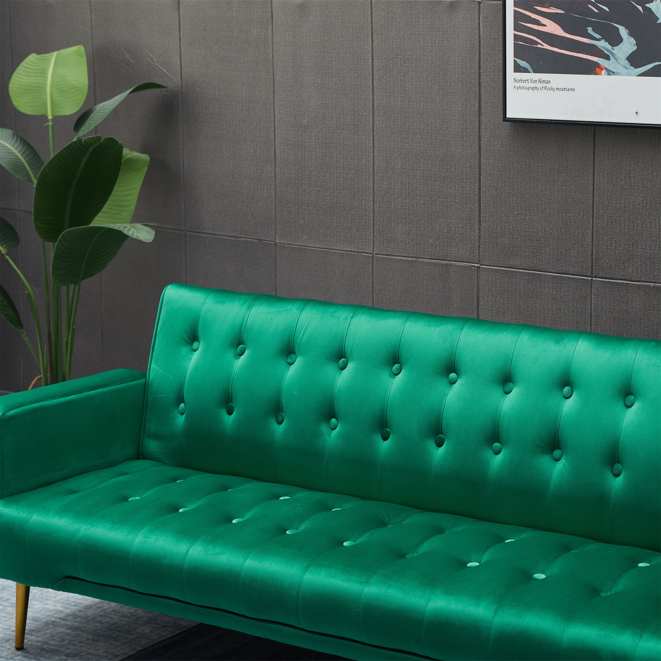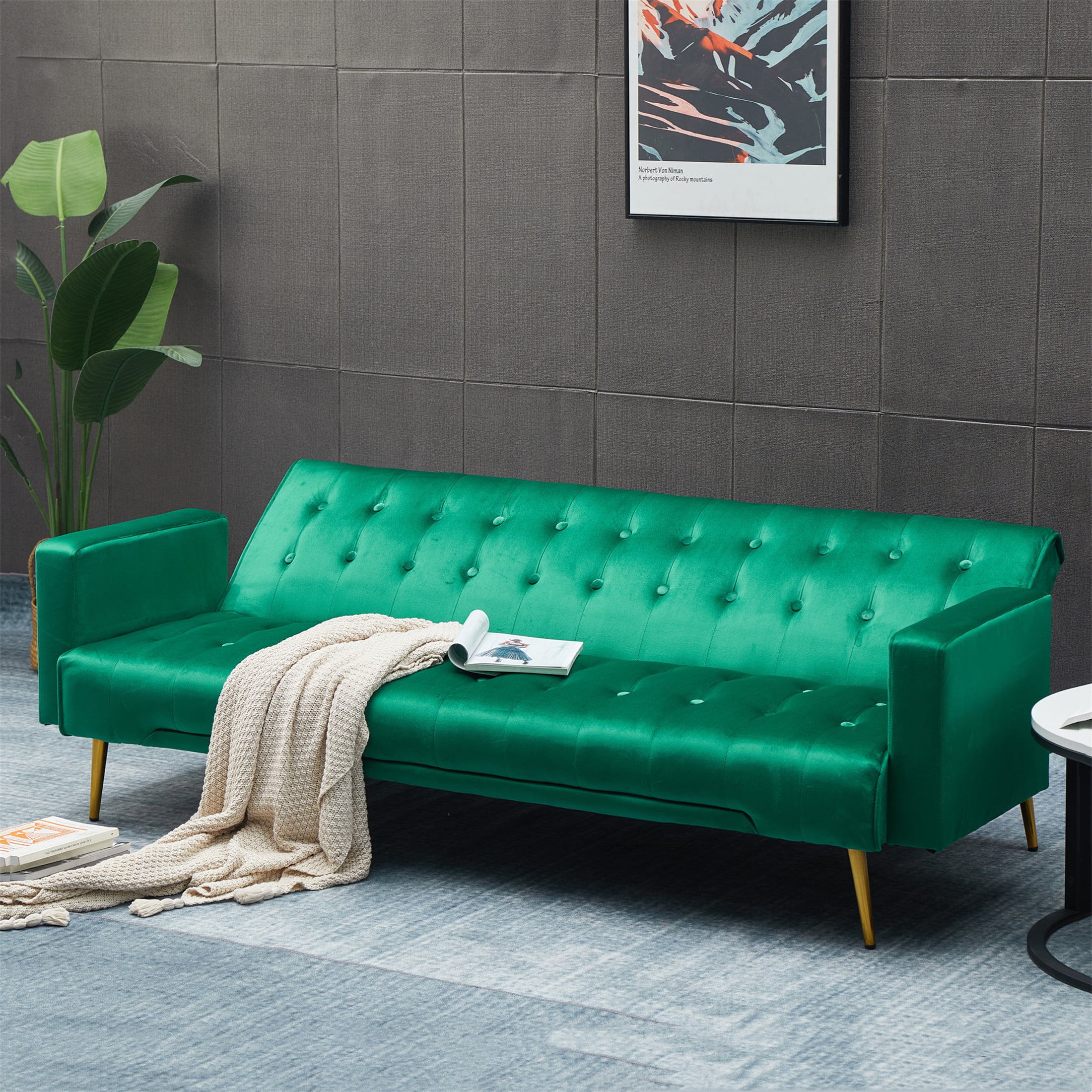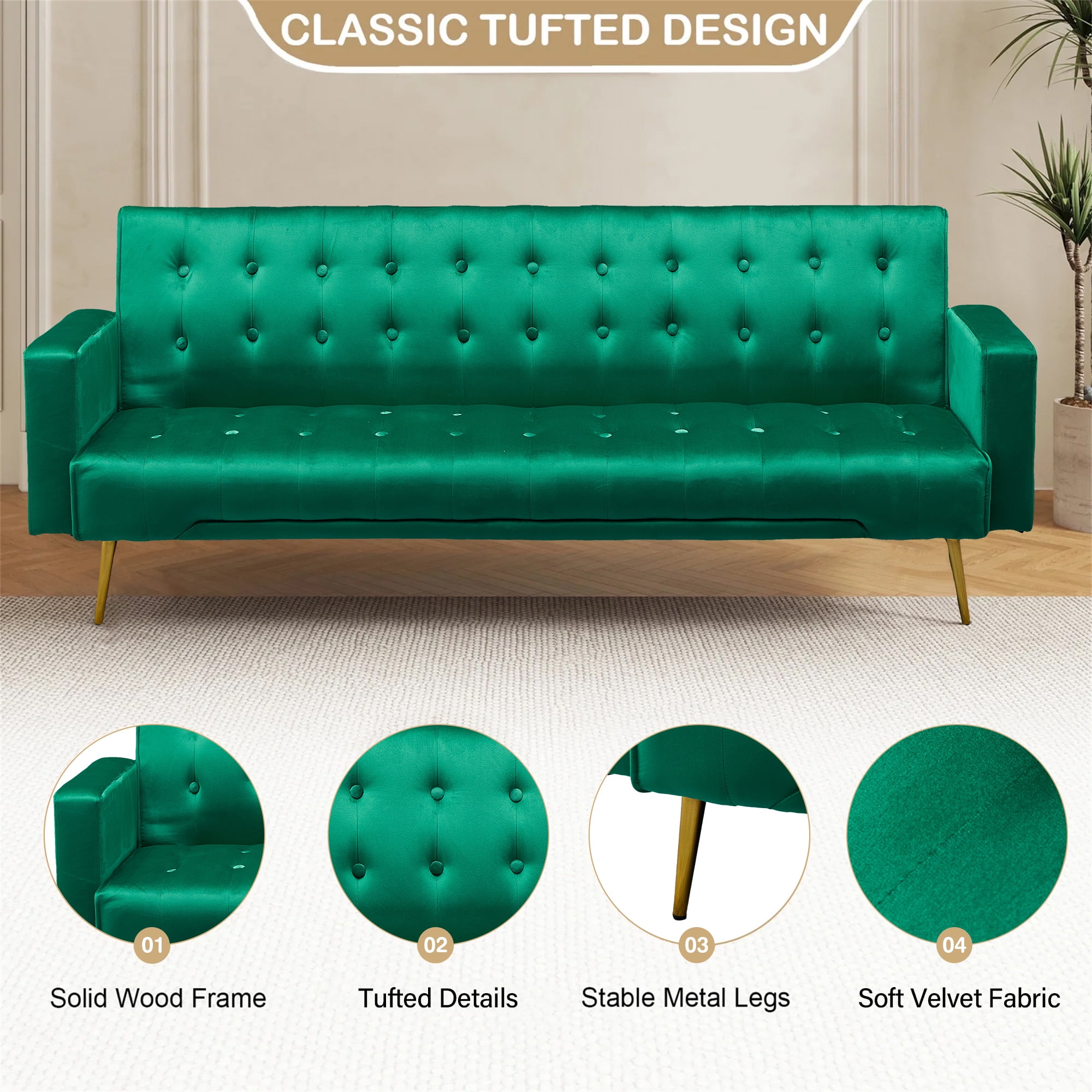 Aukfa 76″ Velvet Futon Convertible Sofa Bed Tufted Arm Couch for Home Office, Green