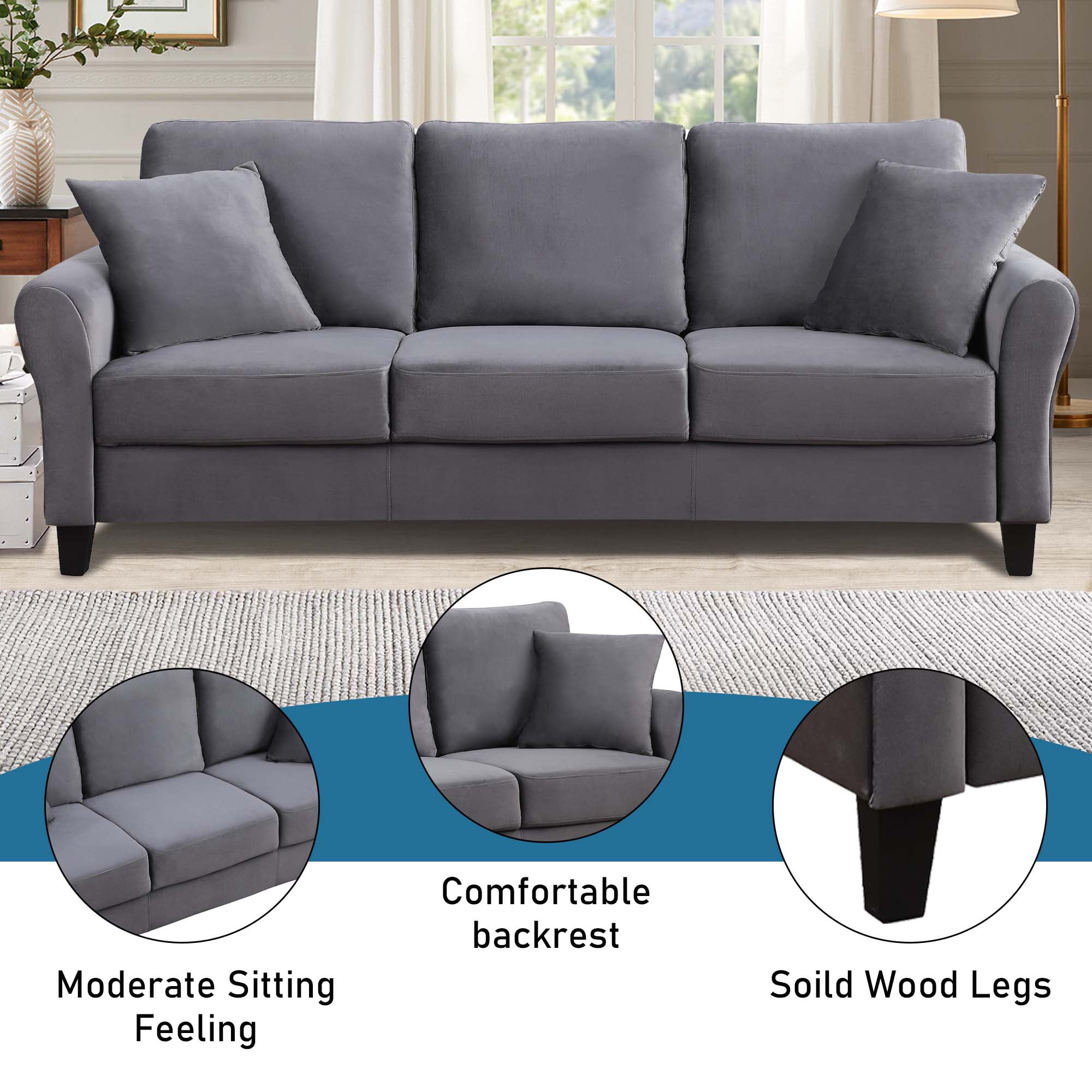 FEATURES COMFORTABLE DESIGN – Sit back and relax with the inviting and spacious design of Aukfa. Conceptually simple, this sofa is a lasting addition in a home or apartment and is perfect for entertaining. BUILT TO LAST – A naturally strong frame is wrapped in supportive foam cushioning and soft velvet fabric; Seats a maximum weight capacity of 600 lbs; Seat cushions are secured to the frame and are not detachable, while back cushions are detachable. CONTEMPORARY DESIGN SOFA – Embodying retro intrigue and contemporary style, this Aukfa AK-FS01-001 mid-century modern couch is an easy addition to a living space with its clean lines, rounded corners, and organic form. VELVET UPHOLSTERY – Sitting atop a durable rubberwood frame, this upholstered sofa features densely padded foam cushions. EASY ASSEMBLY – All parts and instructions are cleverly packed into one box for easy assembly. Weight & Dimensions Overall: 78.35″L x 29.92″W x 35.43″H Seat: 18.5” H X 66.54” W X 20.08” D Arm Height – Floor to Arm: 24.41″ Back Height – Seat to Top of Back: 16.93″ Overall Product Weight: 92.4 lbs Minimum Door Width – Side to Side: 18” W Leg Height – Top to Bottom: 4.53″ Number of packages: 1 Specifications Product Type: Sofa Sofa Design: Standard Seating Capacity: Upholstery Material: Velvet Frame Material: Solid +Manufactured Wood Wood Species: Eucalyptus Leg Color: Black Leg Material: Plastic Seat Fill Material: Foam Seat Construction: Sponge Back Fill Material: Polyester+Foam Removable Cushions: Yes Removable Cushion Location: Back Toss Pillows Included: Yes(two pillows) Product Care: Dust regularly. Clean gently with a clean, slightly damp cloth. Professional cleaning is recommended. Avoid direct sunlight. Never apply or clean with harsh chemicals. Cleaning Code: Clean with water-based or dry, solvent-based cleaners Durability: Stain Resistant Arm Type: Round Arm Seat Style: Single cushion seat Back Type: Cushion back Supplier Intended and Approved Use: Residential Use Cushion Construction: Foam Component Connector: Brackets/clips are installed Weight Capacity: 600 lbs Adjustable Components: Armrest Sleeper Sofa: No Package Information 1 x Upholstered Sofa 2 x Pillows 1 x Tool Kit 1 x User Manual: AK_AK-HLS7FV1001-K0_PUM_RL-021123 Notes Manual measurement has been used, there may be some reasonable error. All the pictures are taken by actual samples, slight chromatic aberration may occur due to lighting or display.