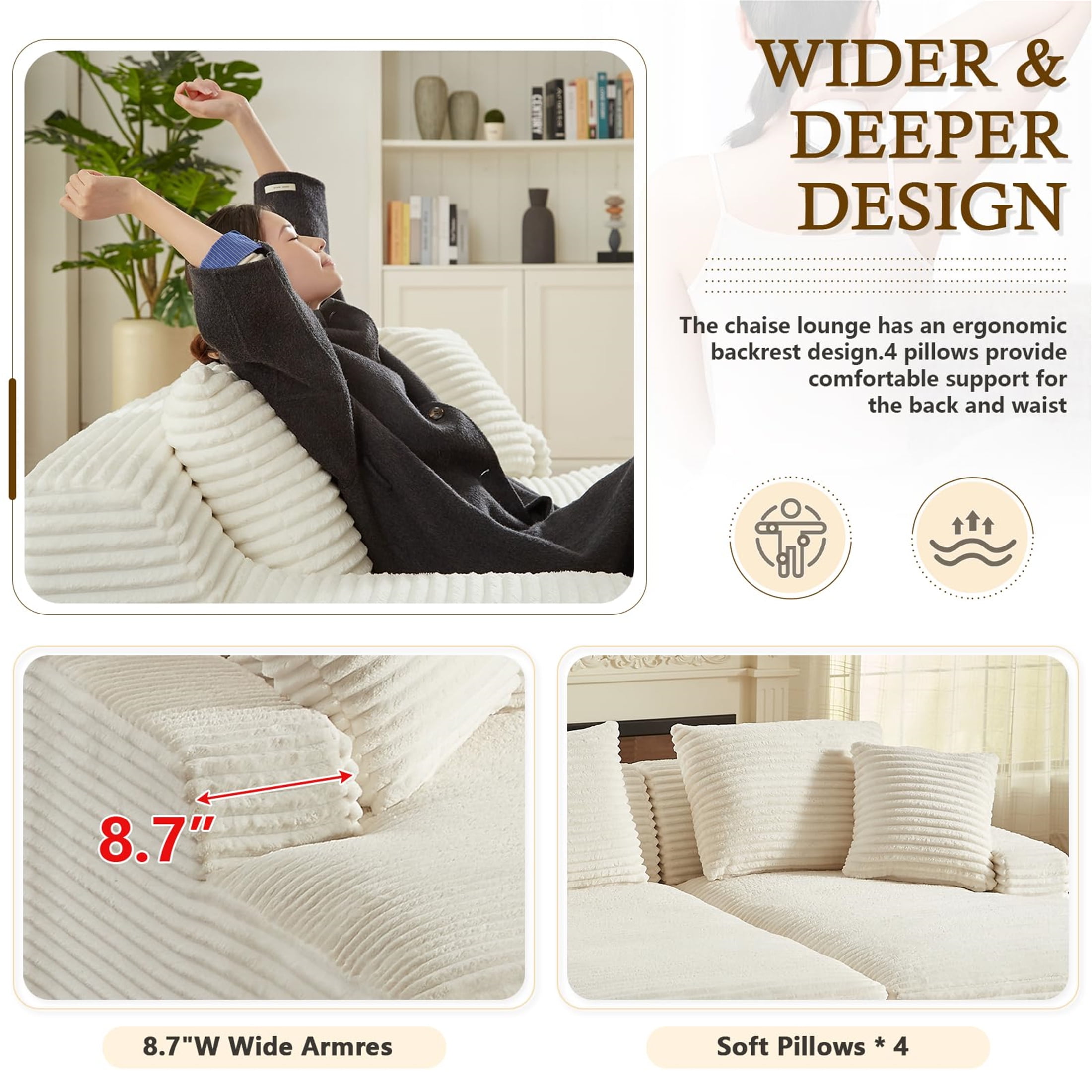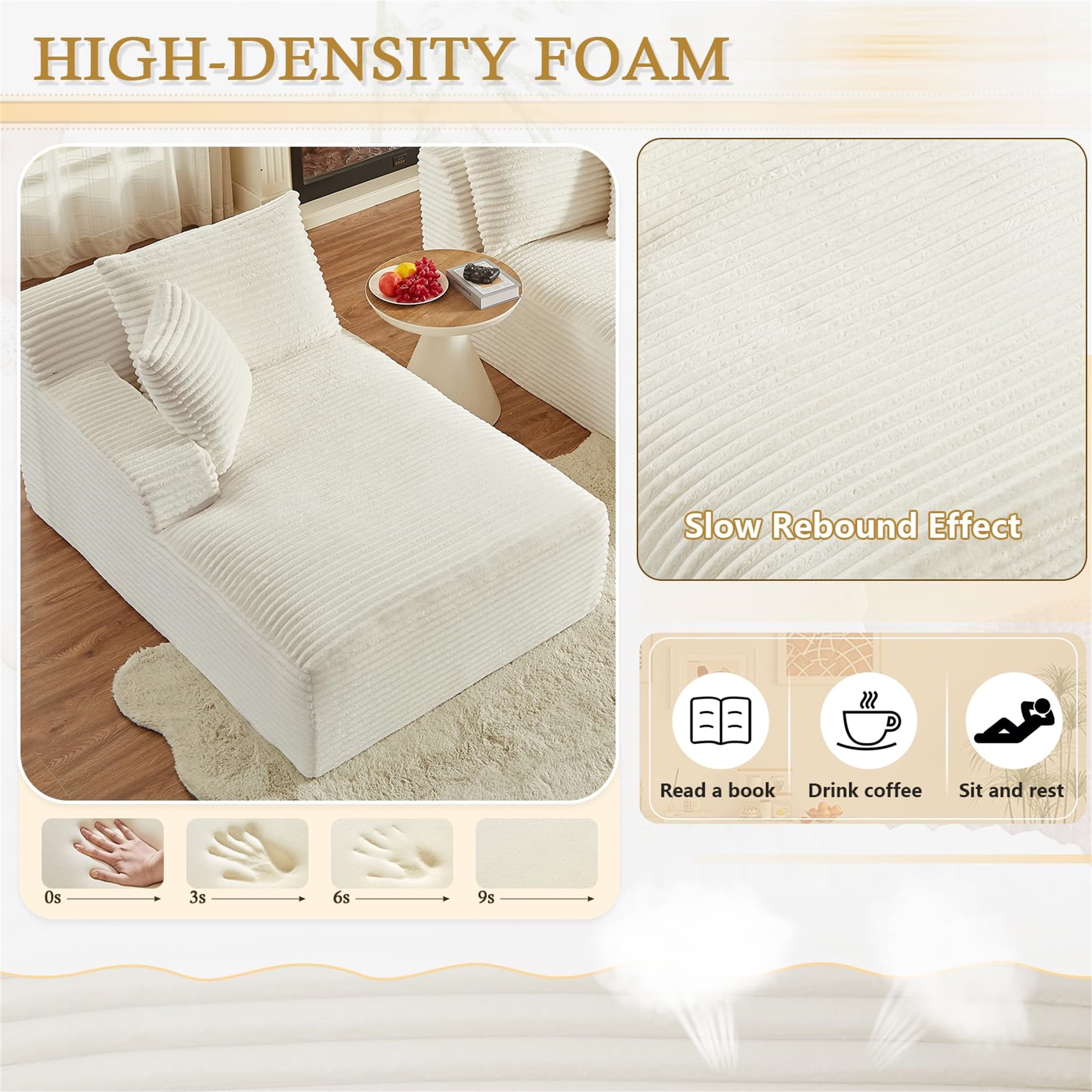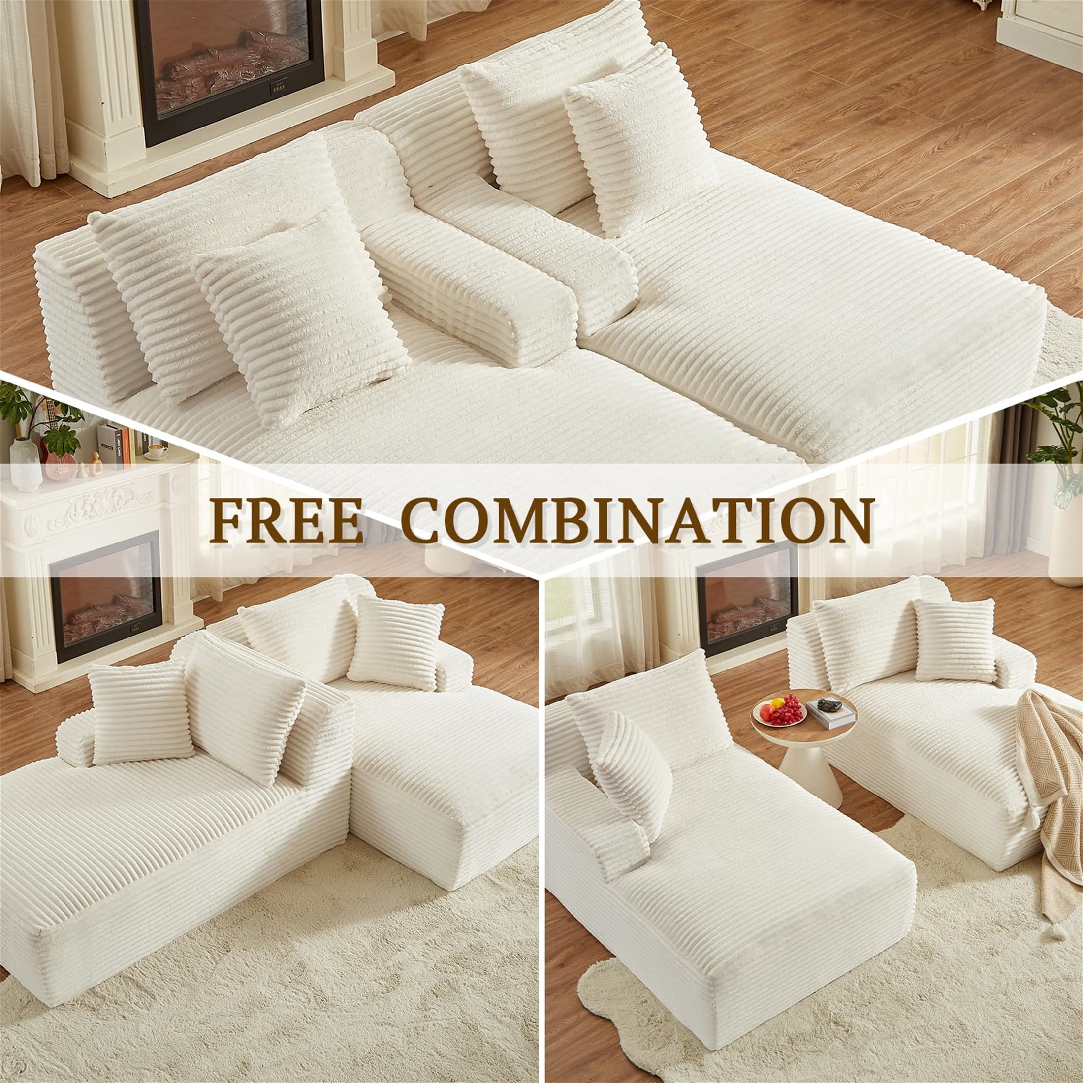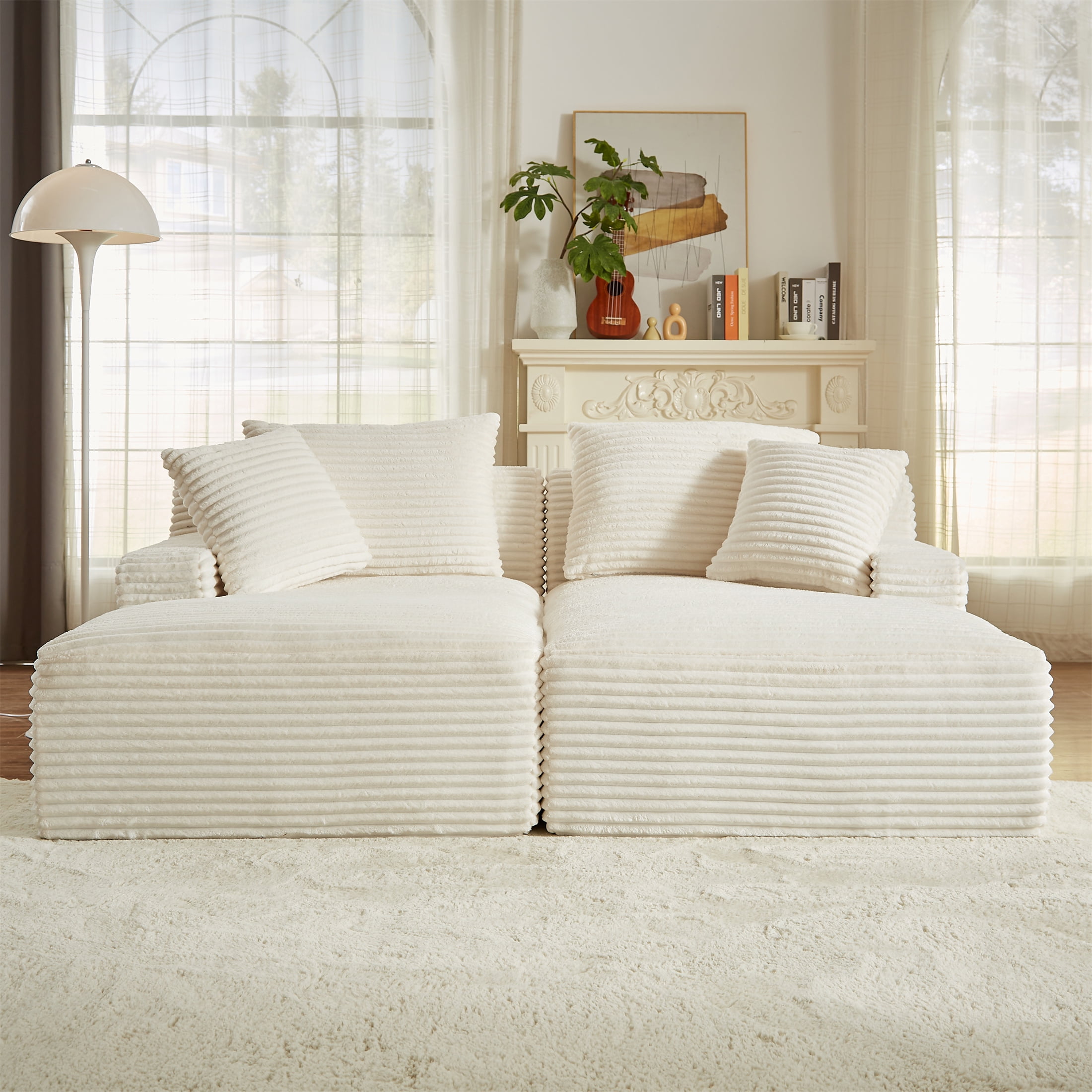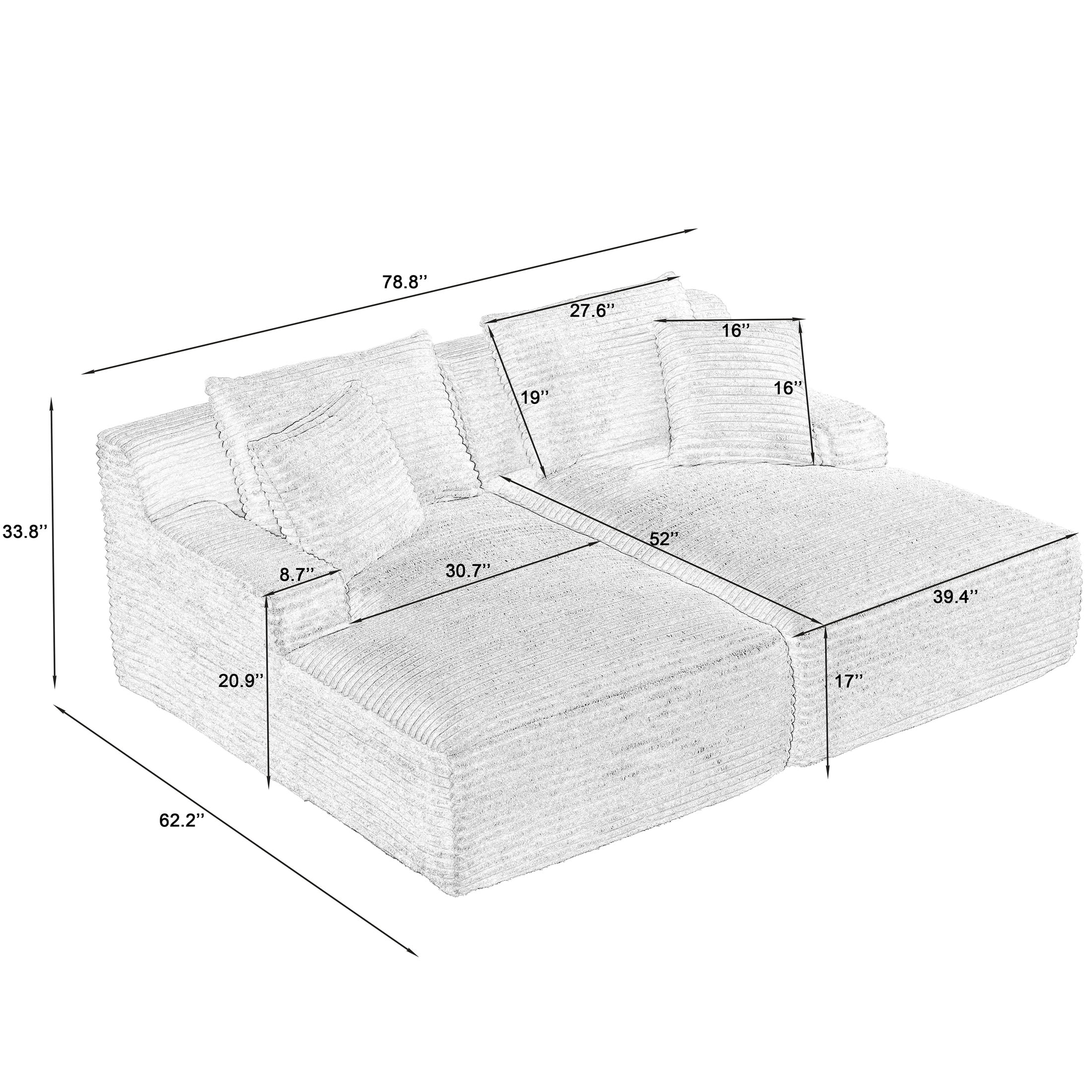 MULTI-FUNCTIONAL USE – This Aukfa AK-FC05-033 78.8″ x 62.2″ oversized double chaise offers the ideal multi-functional solution for unwinding and relaxation. Whether you’re in the mood for reading, movie-watching, or even yoga, this versatile piece of furniture ensures a comfortable and enjoyable experience. LARGE DIMENSIONS – With its 52-inch extra deep seat depth, this chaise bed lets you effortlessly find your perfect position for utmost comfort, ensuring you enjoy the serenity of your stay on this chaise bed. four throw pillows are included. PREMIUM MATERIALS – The lounge sofa is swathed in luxurious corduroy fabric and embraces a 9-inch seat cushion brimming with dense high-resilience memory foam for unparalleled comfort, soothing away the day’s weariness. FLEXIBLE & VERSATILE LIVING ROOM SOFA SET – Perfect for living rooms, apartments, bedrooms, guest rooms, and children’s play areas, our versatile floor sofa set serves many functions, encouraging children to play on its luxurious surface. MODULAR COUCH DESIGN – Its modular design facilitates seamless navigation through narrow hallways and tight doorways, ensuring optimal space utilization. Say farewell to relocation concerns, as each piece can be moved independently Note: Please note that the indoor double lounge chair is compressed during transportation. After unpacking, the size may deviate from the picture size when just unpacked due to the rebound of the sponge. After 72 hours, the product size will return to the picture size. You can speed up this process by gently patting it or gently jumping on it. If wrinkles appear on the surface, it is recommended to carefully use a steam iron to smooth them out. SPECIFICATION: PRODUCT INFORMATION Overall: 78.8” L x 62.2” W x 33.8” H Back Cushion: 19”H Seat Depth – Front to Back: 52“ Seat Height – Floor to Seat: 17” Minimum Door Width – Side to Side: 25”W Overall Product Weight: 120 lb Arm Height – Floor to Arm: 20.9” Leg Height – Top to Bottom: Floor Box Size: 19.3” L x 19.3” W x 45.7″ H; 128 lb Features Product Type: Double Chaise Seating Capacity: 2 Upholstery Material: 100% Corduroy Upholstery Color: Beige Fill Material: Memory Foam Back Type: Pillow Back Convertible: Yes 4 Pillows: Yes Removable Cushions: Yes Supplier Intended and Approved Use: Residential Use Cleaning Code: WW: Water-based agents only. Gently remove stains by blotting. Assembly Assembly Required: No Warranty Product Warranty: Yes Full or Limited Warranty: Limited Warranty Length: One Year