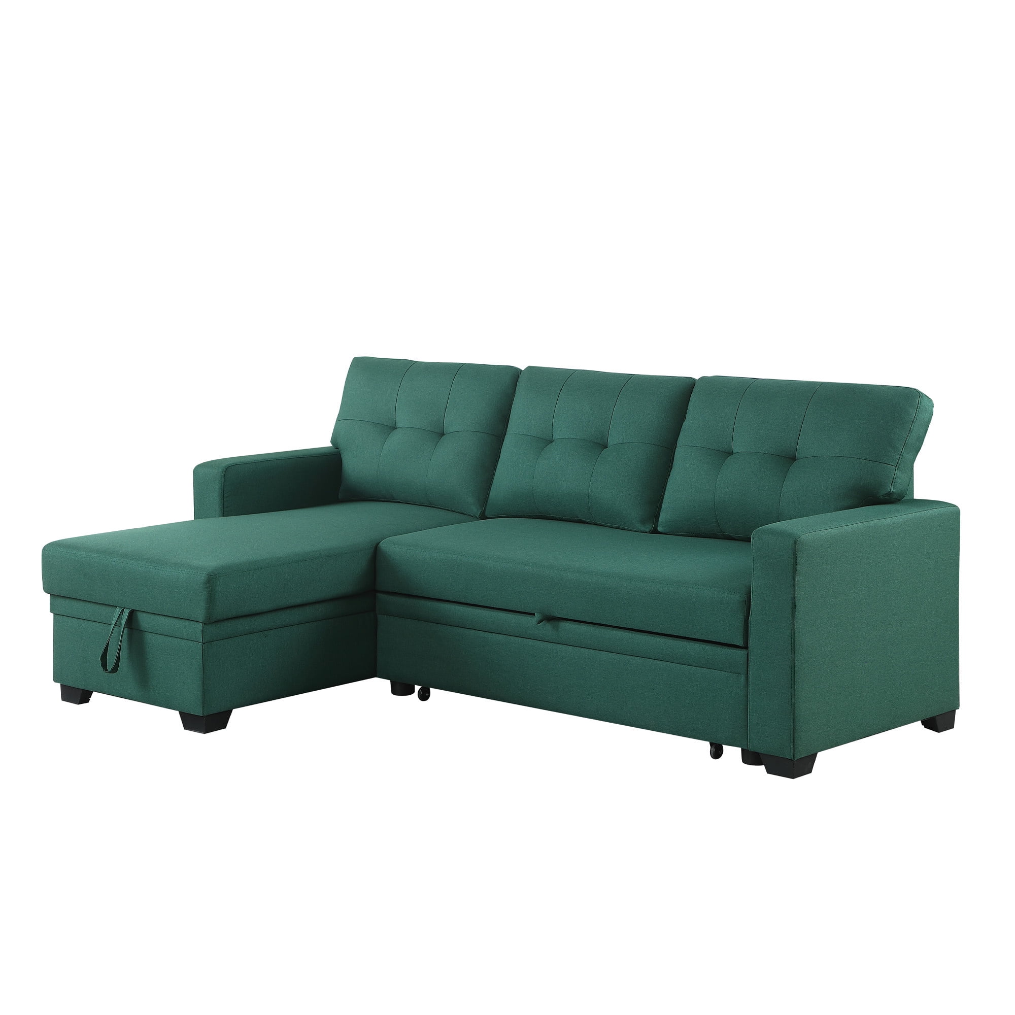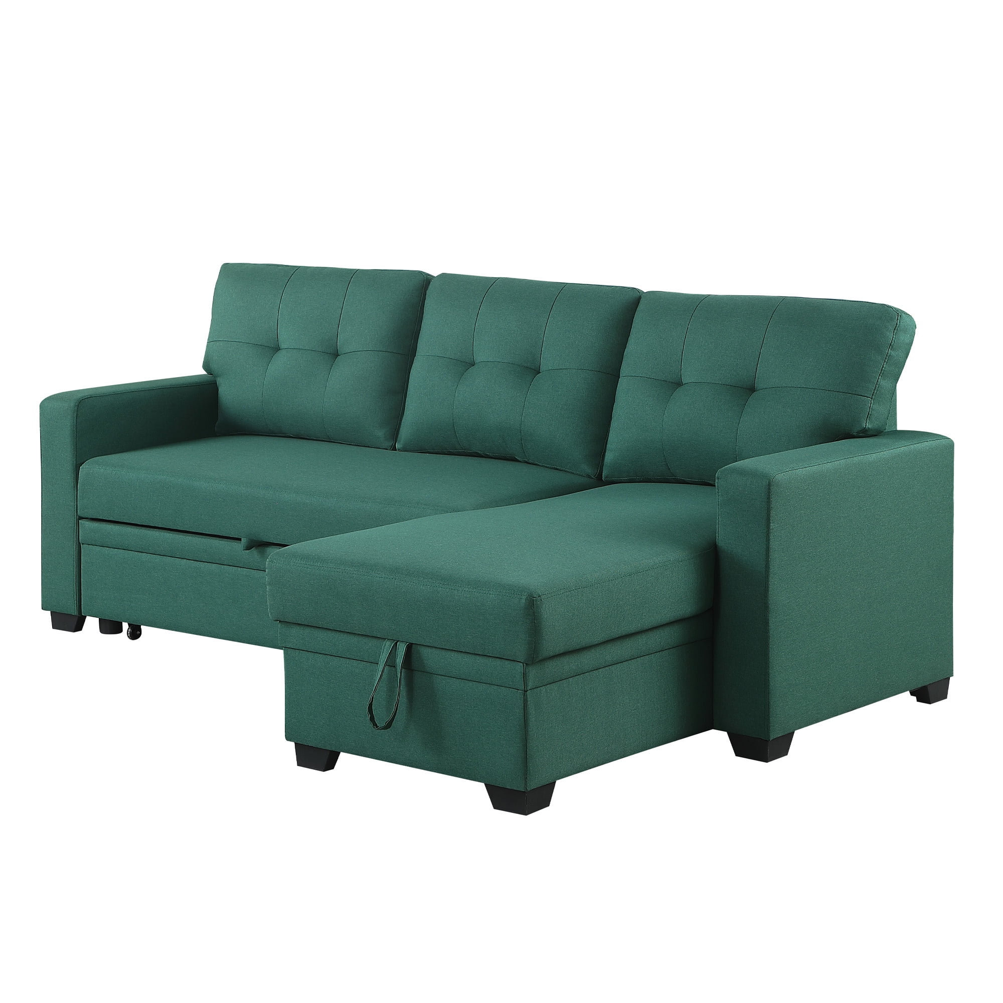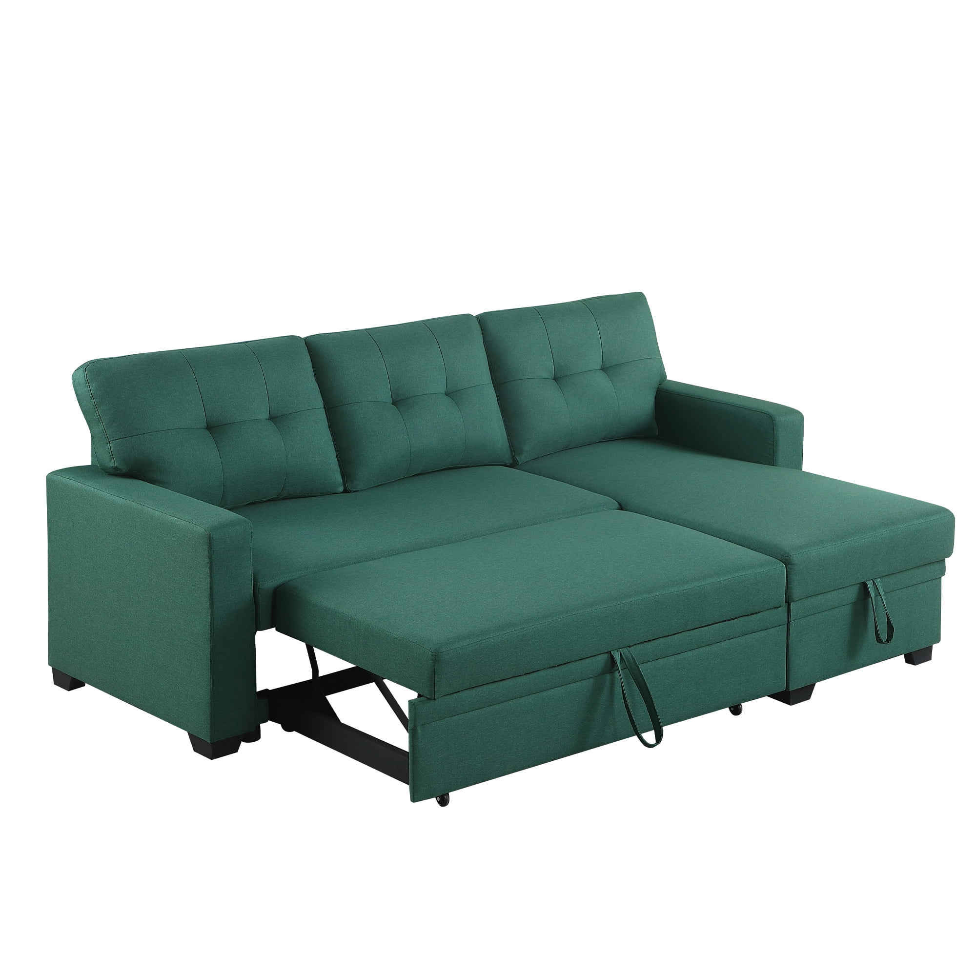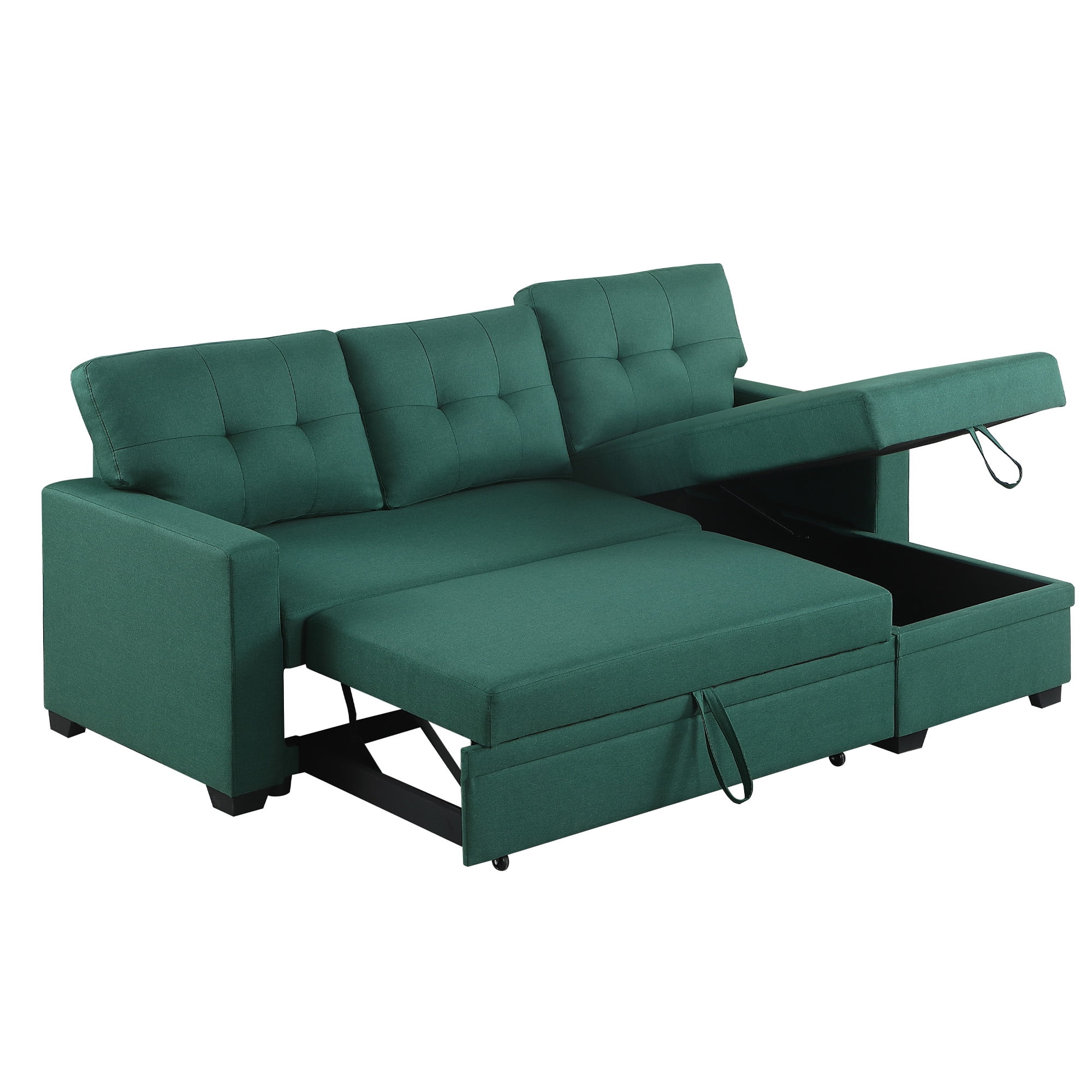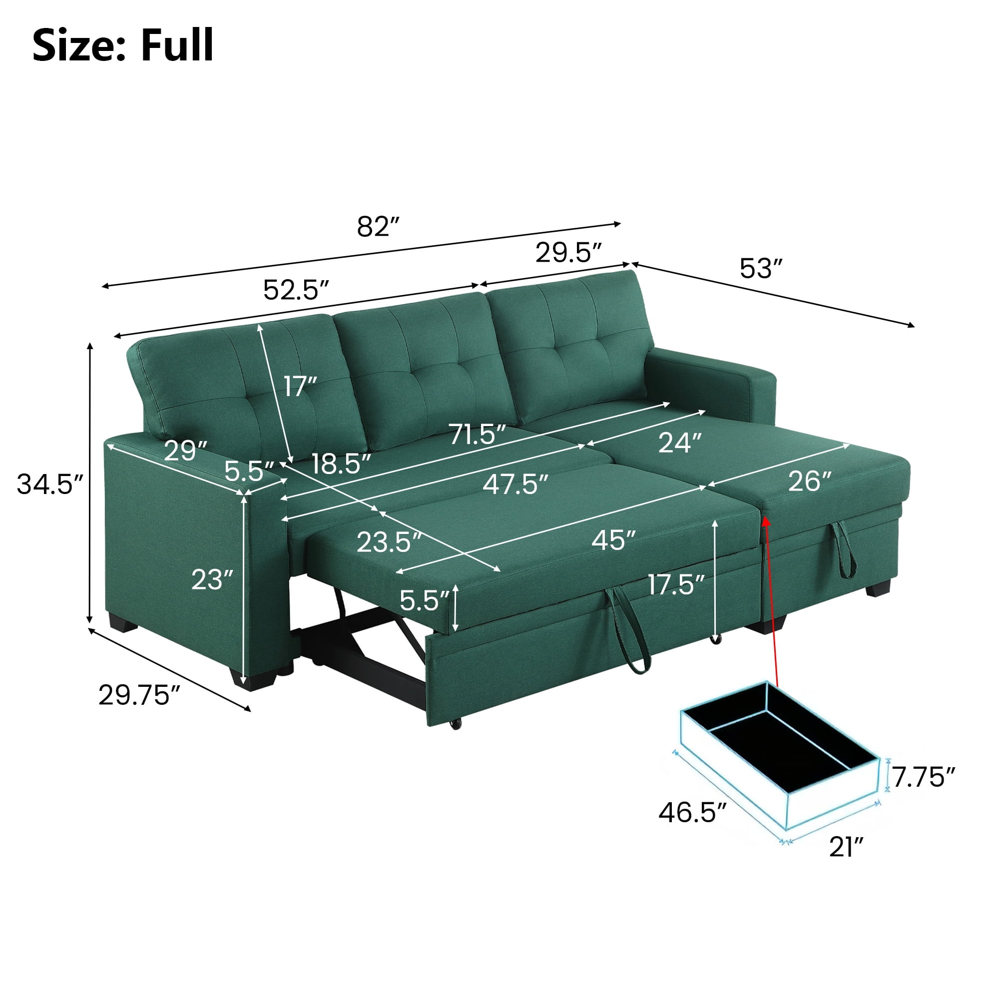 2-in-1 PULL OUT SOFA BED – Modern and stylish design with low-profile silhouette and wide armrest. Corner-blocked frame multi-purpose, all-in-one sectional sofa bed. REVERSIBLE CHAISE FOR FLEXIBILITY – The AK-FS02-035 sectional sleeper sofa comes in two pieces and attaches via alligator clips. includes a reversible chaise that helps with arranging your space in any way that you want. ULTIMATE COMFORT SECTIONAL COUCH – Upholstered with soft linen fabric in a neutral hue for an inviting look that blends with other modern furniture. STORAGE CHAISE FOR SPACE SAVING – Excellent space optimizer. It comes with a reversible chaise that includes a wide built-in storage compartment and a twin size pull-out bed. STURDY & FUNCTIONAL – Sturdy solid wood structure with plastic modern legs. High-gauge sinuous springs seating to ensure comfortable cushion and provide optimal lumber support. EASY ASSEMBLY – Our sofa bed comes with clear and concise instructions, making it easy to assemble and start using in no time. 12-hour professional service team will support you if there is any problem. PRODUCT INFORMATION Overall: 82” L x 53” W x 34.5” H Back Cushion: 17”H Seat Depth – Front to Back: 18.5“ Seat Height – Floor to Seat: 17.5” Minimum Door Width – Side to Side: 33”W Overall Product Weight: 175 lb Arm Height – Floor to Arm: 23” Leg Height – Top to Bottom: 3” Box Size①: 26” L x 48” W x 16″ H;69 lb Box Size②: 26” L x 38” W x 16″ H;60 lb Box Size③: 18” L x 28” W x 12″ H;28 lb Features Product Type: Sofa Bed Overall Shape: L Shape Sofa Design: Stationary Number of Pieces: 2 Seating Capacity: 3-4 Upholstery Material: 100% Linen Upholstery Color: Green Fill Material: Foam Frame Material: Solid wood+Plywood Leg Material: Plastic Leg Color: Black Arm Style: Square Arms Back Type: Pillow back Storage Chaise Included: Yes Removable Backrest: Yes Removable Cushions: No Supplier Intended and Approved Use: Residential Use Weight Capacity: 300 lbs each seat Cleaning Code: Clean with dry cloth Assembly Level of Assembly: Full Assembly Needed Adult Assembly Required: Yes Suggested Number of People for Assembly/Install: 2 Additional Tools Required (Not Included): All Tools Include Warranty Product Warranty: Yes Full or Limited Warranty: Limited Warranty Length: One Year