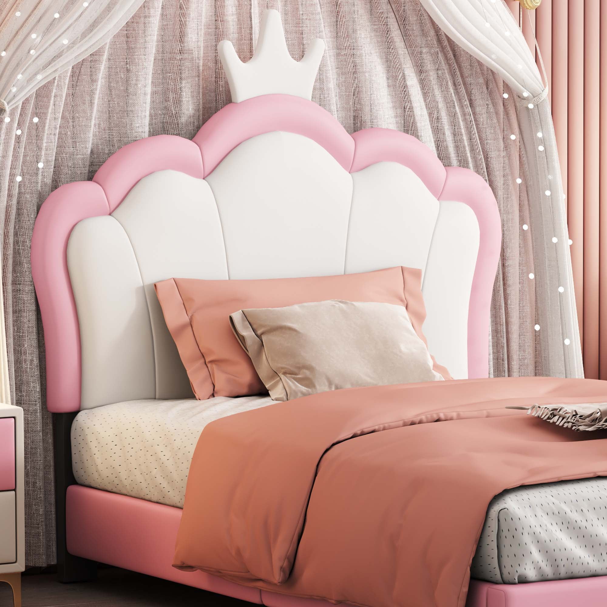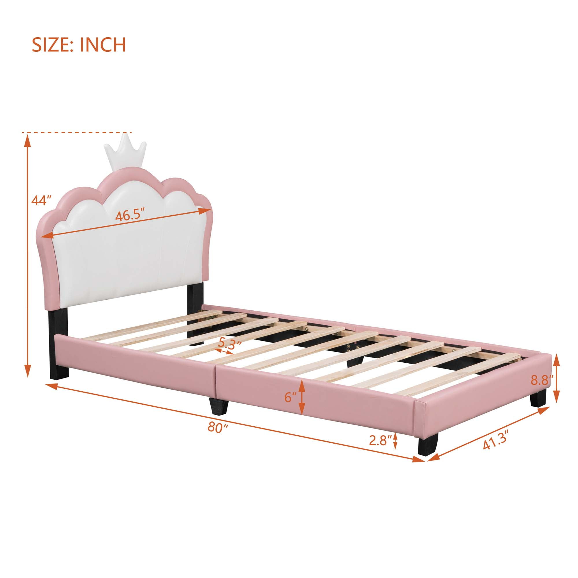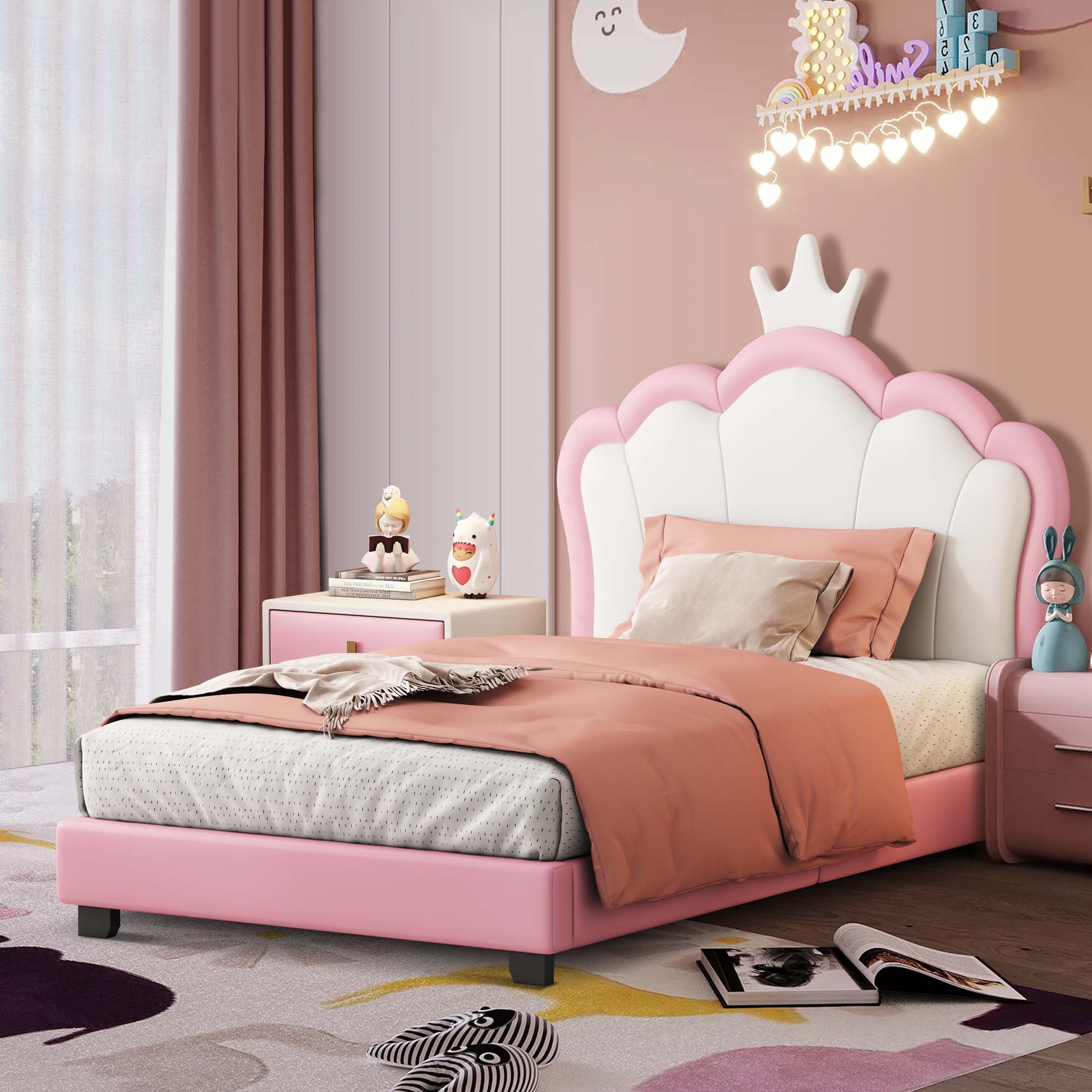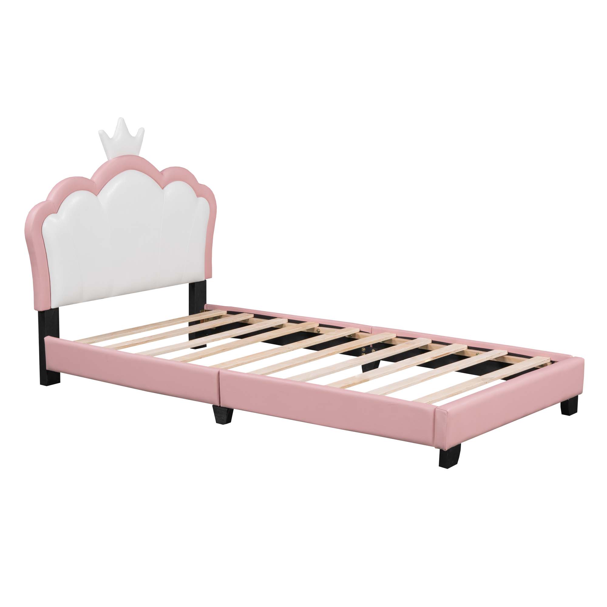 Aukfa Cartoon Kids Twin PU Leather Standard Beds, White/Pink Princess Crown Headboard Design – This twin bed features a charming headboard shaped like a cartoon princess crown, providing a soft backrest that is both cute and practical. Perfect for your little one’s room Solid Construction – Crafted from high-quality pine wood, this bed frame is resistant to humidity changes, ensuring durability. The strong legs, wide boards, and 10 slats enhance stability and support, with a weight capacity of 250 lbs Low Profile Design – The low-profile platform design allows easy access for your child to get in and out of bed. Generous padding offers comfort and support for sitting up to read or watch TV No Box Spring Required – This twin size bed includes wooden slats, eliminating the need for a box spring. The PU leather upholstery ensures a firm and quiet sleeping experience. Mattress not included Easy Assembly – All necessary instructions and hardware are included for quick assembly. It is recommended that two people assist during the setup. Contact us for replacement parts if needed