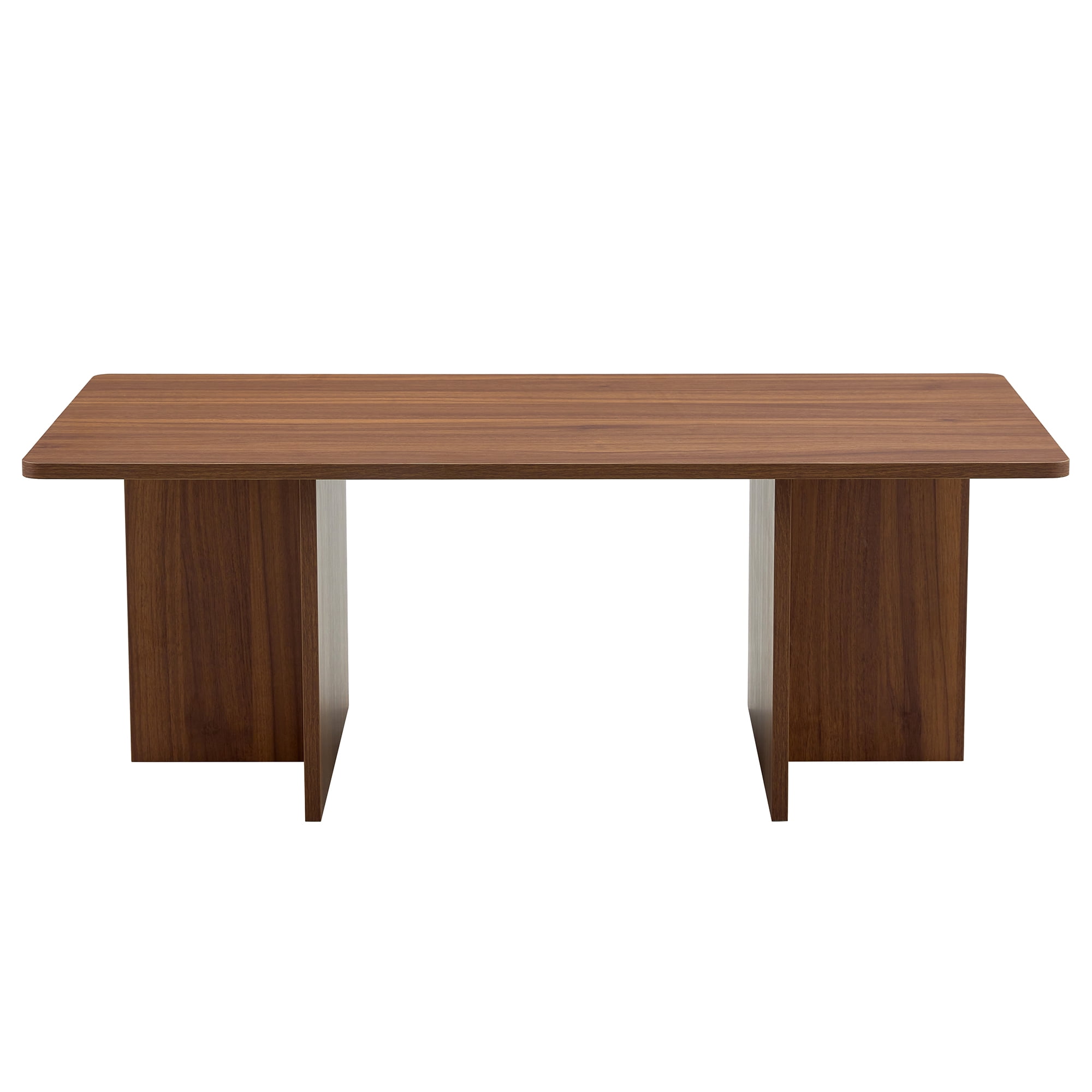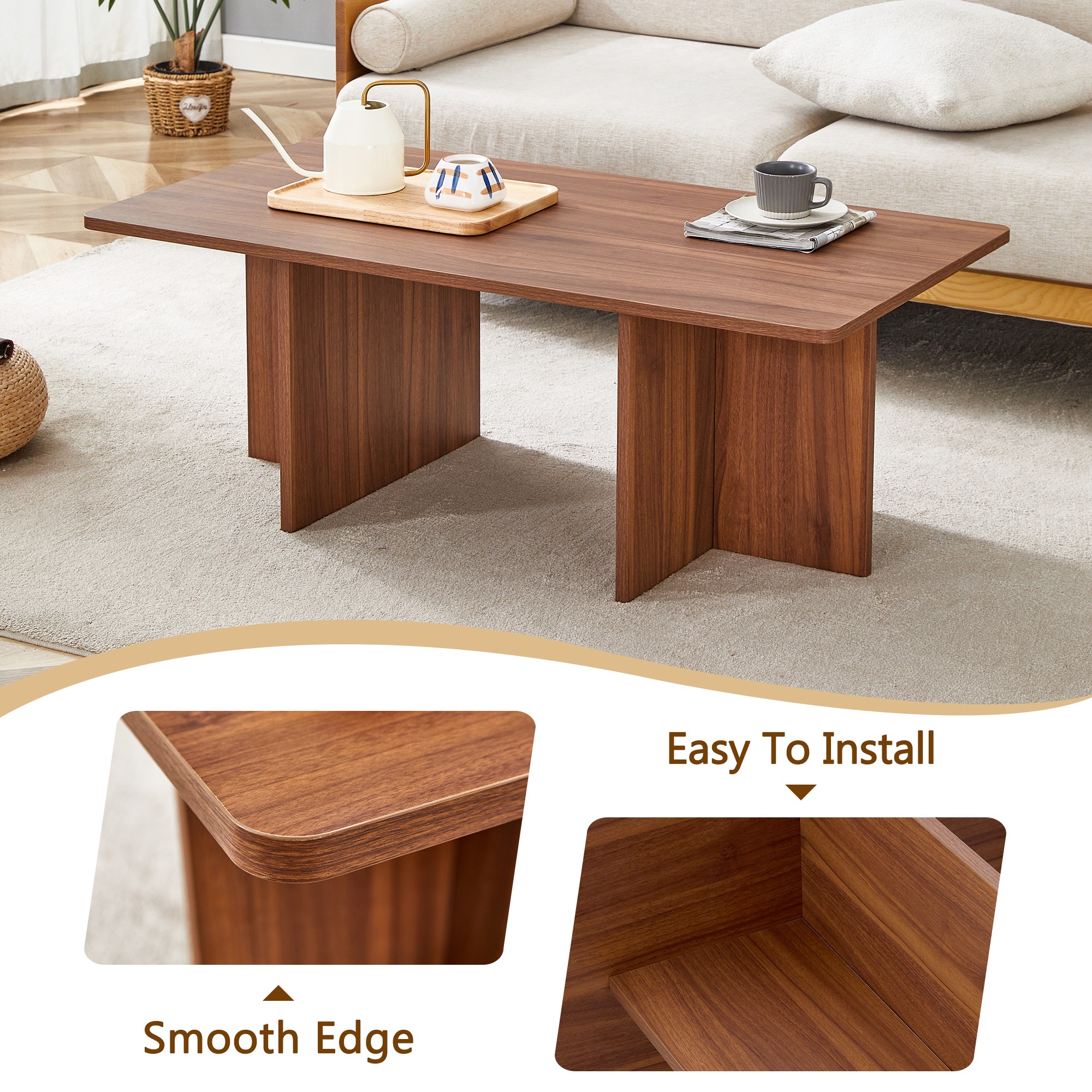 Features GEOMETRIC DESIGN – The unique T-shaped legs form a striking double-pillar base, adding modern elegance and stability. SPACIOUS TABLETOP – At 45″ wide, the rectangular surface offers generous space for everyday essentials or entertaining needs. VERSATILE AND FUNCTIONAL – Perfect for holding books, decor, or snacks during gatherings, making it an ideal centerpiece for both casual and formal settings. WALNUT WOOD GRAIN DESIGN – The coffee table is adorned with a walnut wood grain decal, showcasing a clear, natural texture that brings the outdoors into your home. PREMIUM CRAFTSMANSHIP – Made from high-quality MDF, the table features a smooth, refined surface for a touch of comfort and sophistication. CHILD-SAFE DESIGN – The rounded corners are carefully smoothed, ensuring safety for children and making it ideal for family use. Weight & Dimensions Overall: 44.8″ L x 23.6″ W x 16.4″ H Overall Product Weight: 34.06 lbs Specifications Product Type: Coffee Table Table Top Shape: Rectangular Top Material: Manufactured Wood Base Material: Manufactured Wood Extendable: No Table Base Type: Sled Weight Capacity: 90 lb 1 x User Manual: AK_AK-HLA4WX1002-N3_PUM_VY-121124